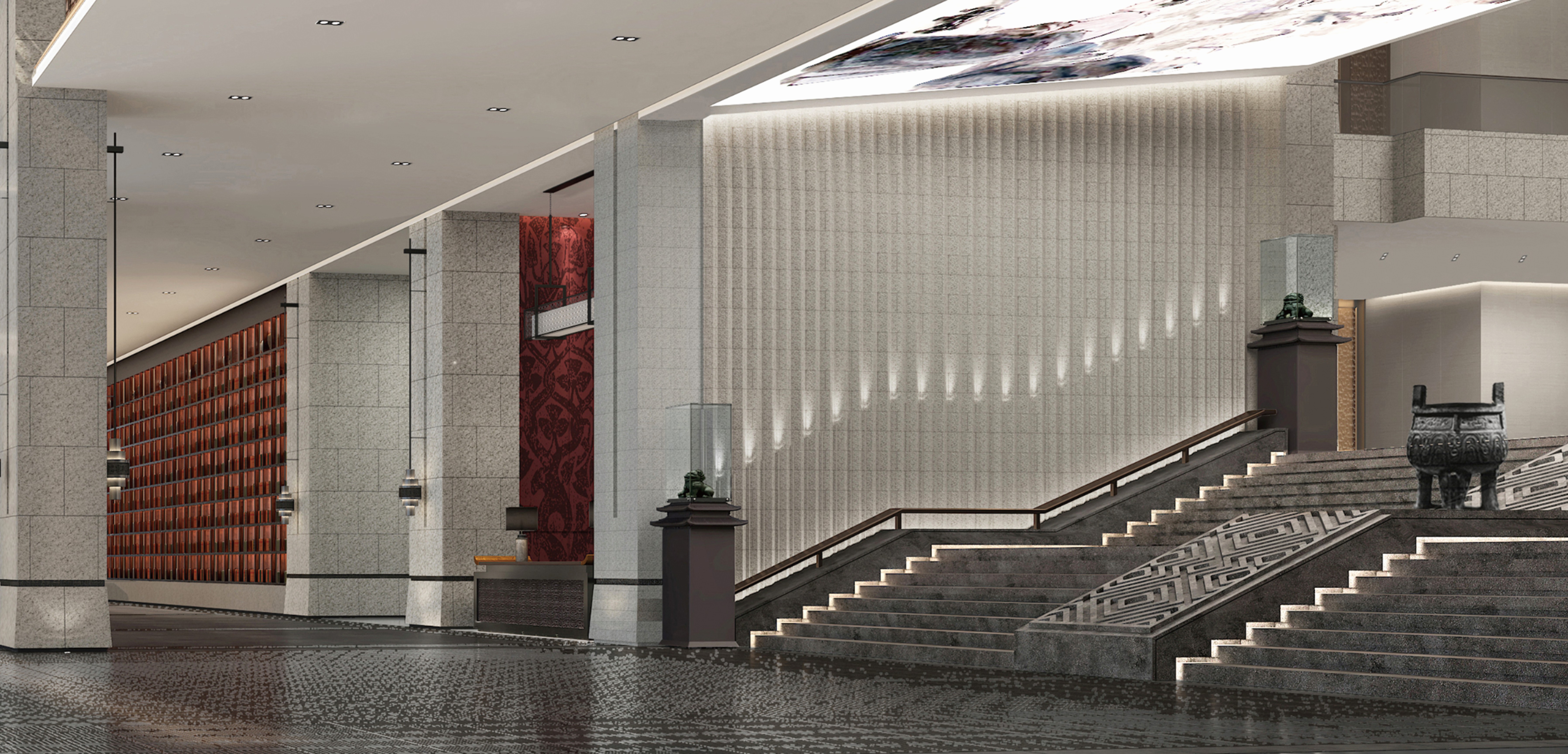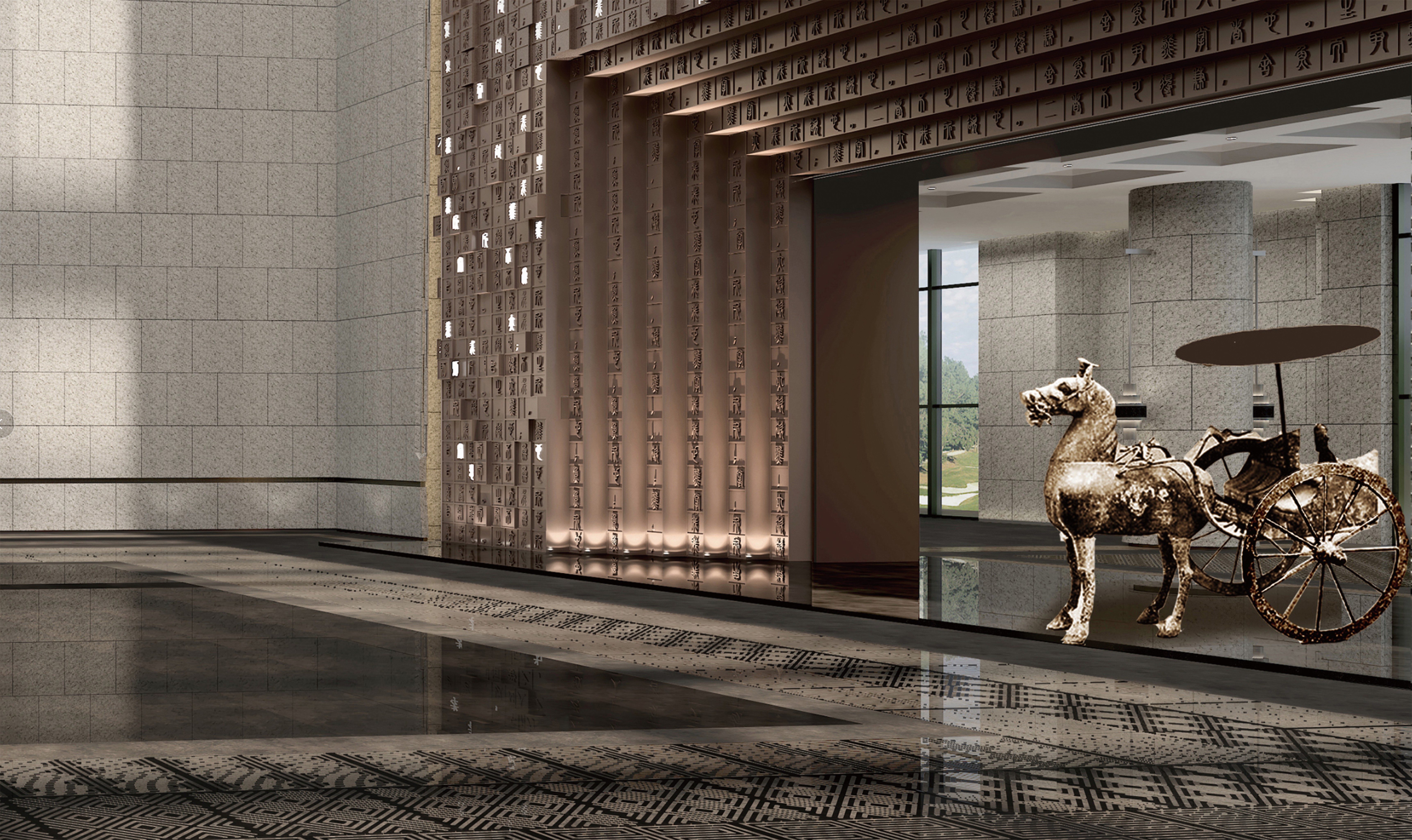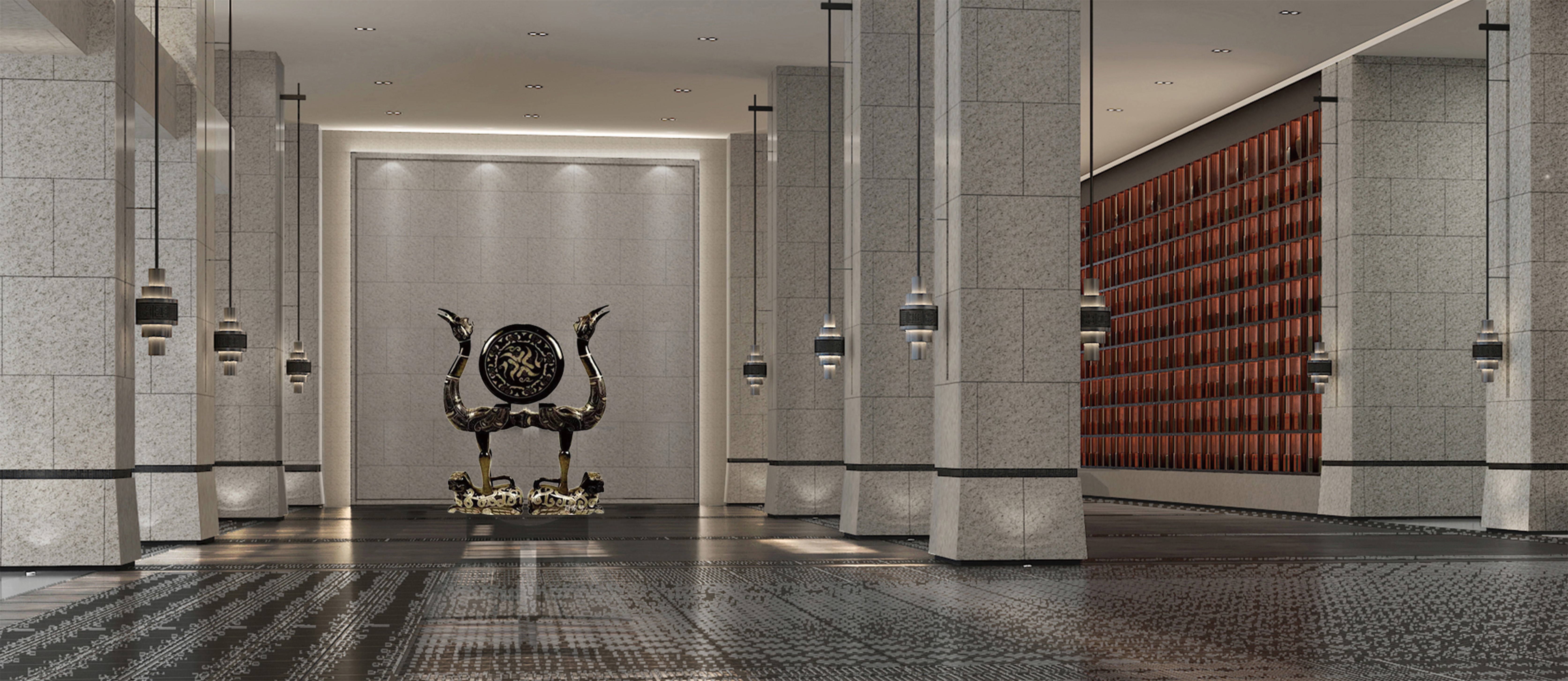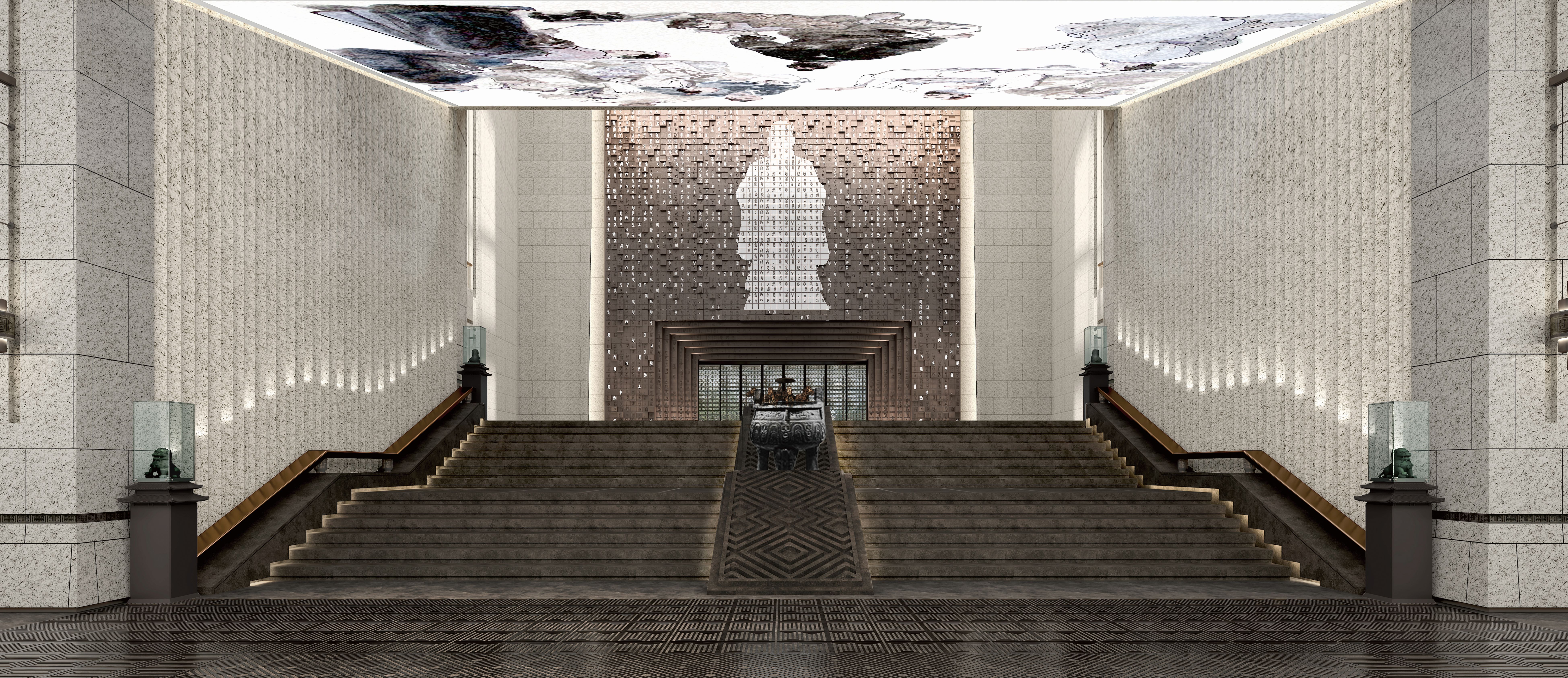 空间意境:前厅设计融入儒家“礼序”精神打造空间秩序和仪式感,同时通过对光影的创造,呈现浩然之气,全新的艺术审美给人带来更多的视觉体验感。设计利用环境烘托的手法,使人在进谒过程中不断提高对孟子的崇敬之情,从而达到渲染孟子在儒学学术的卓越贡献和在古代社会中的崇高地位。