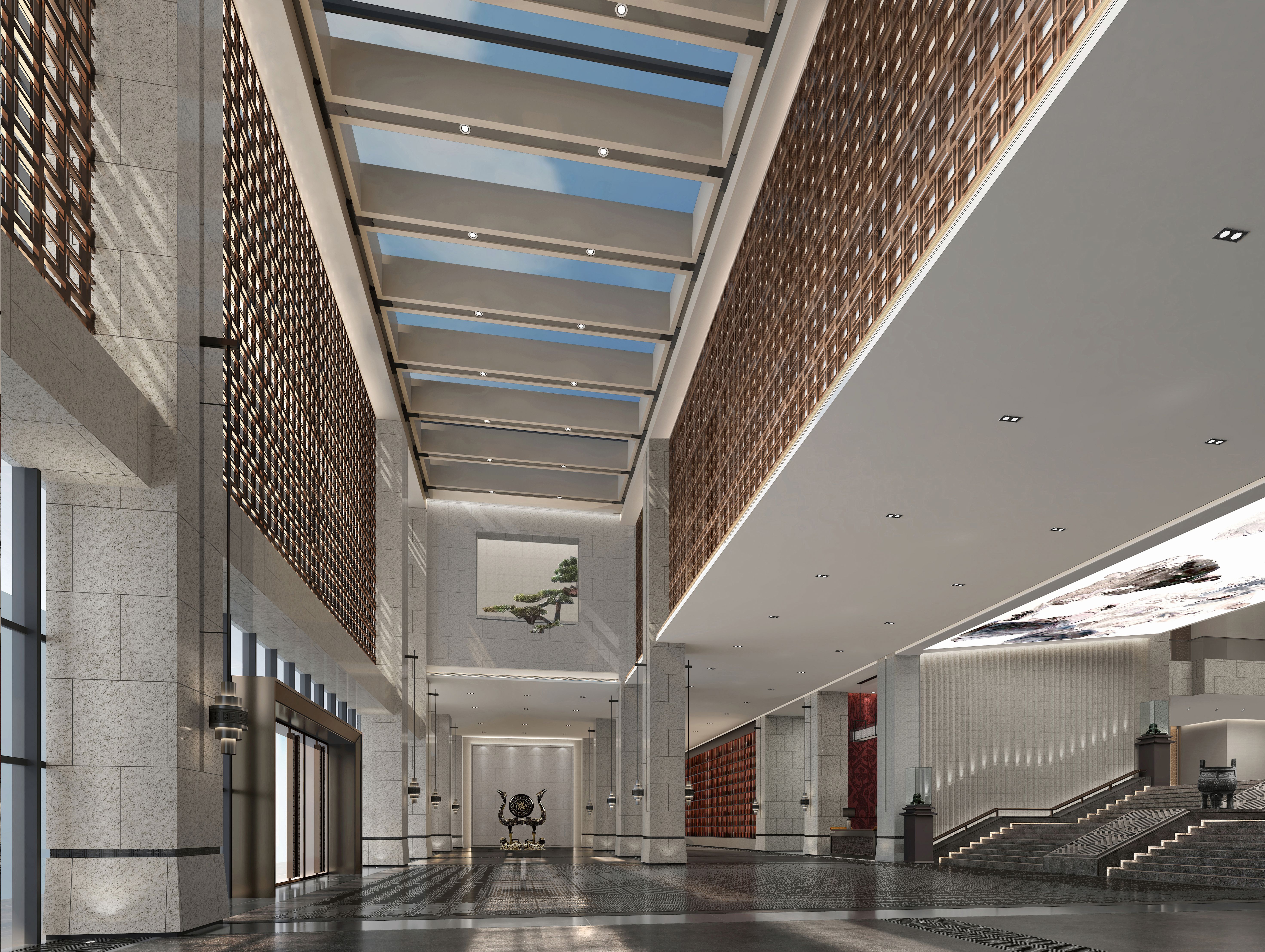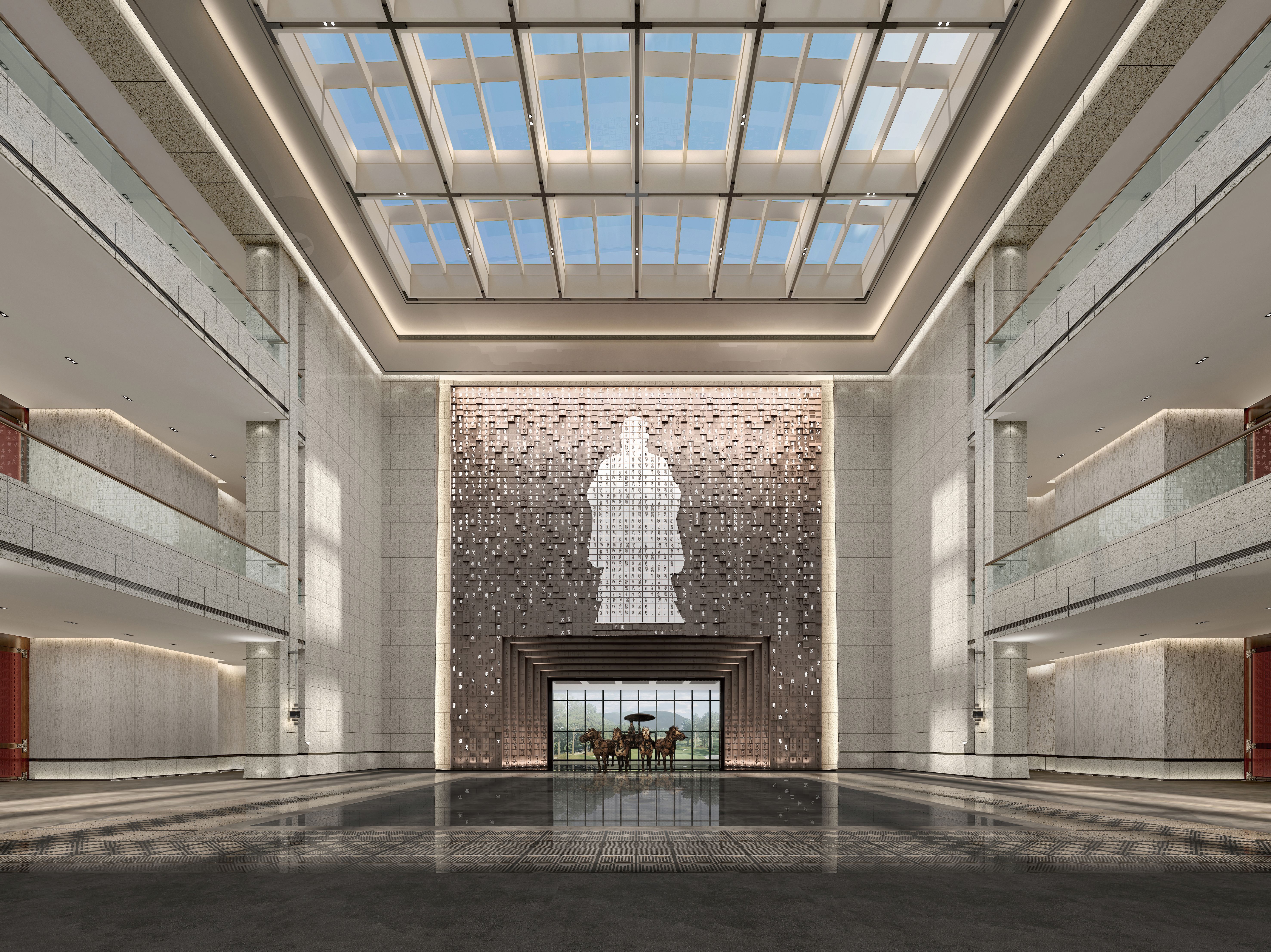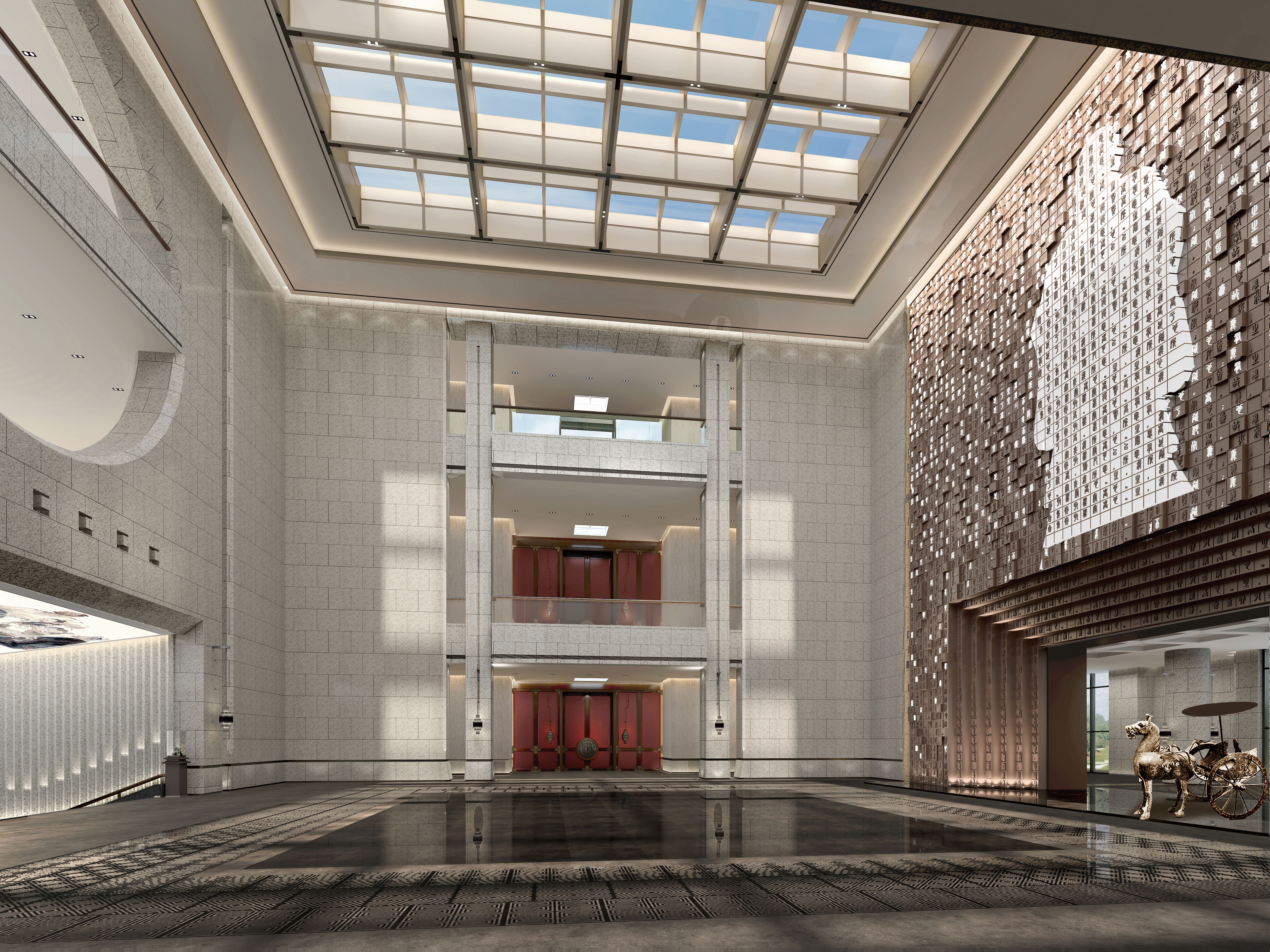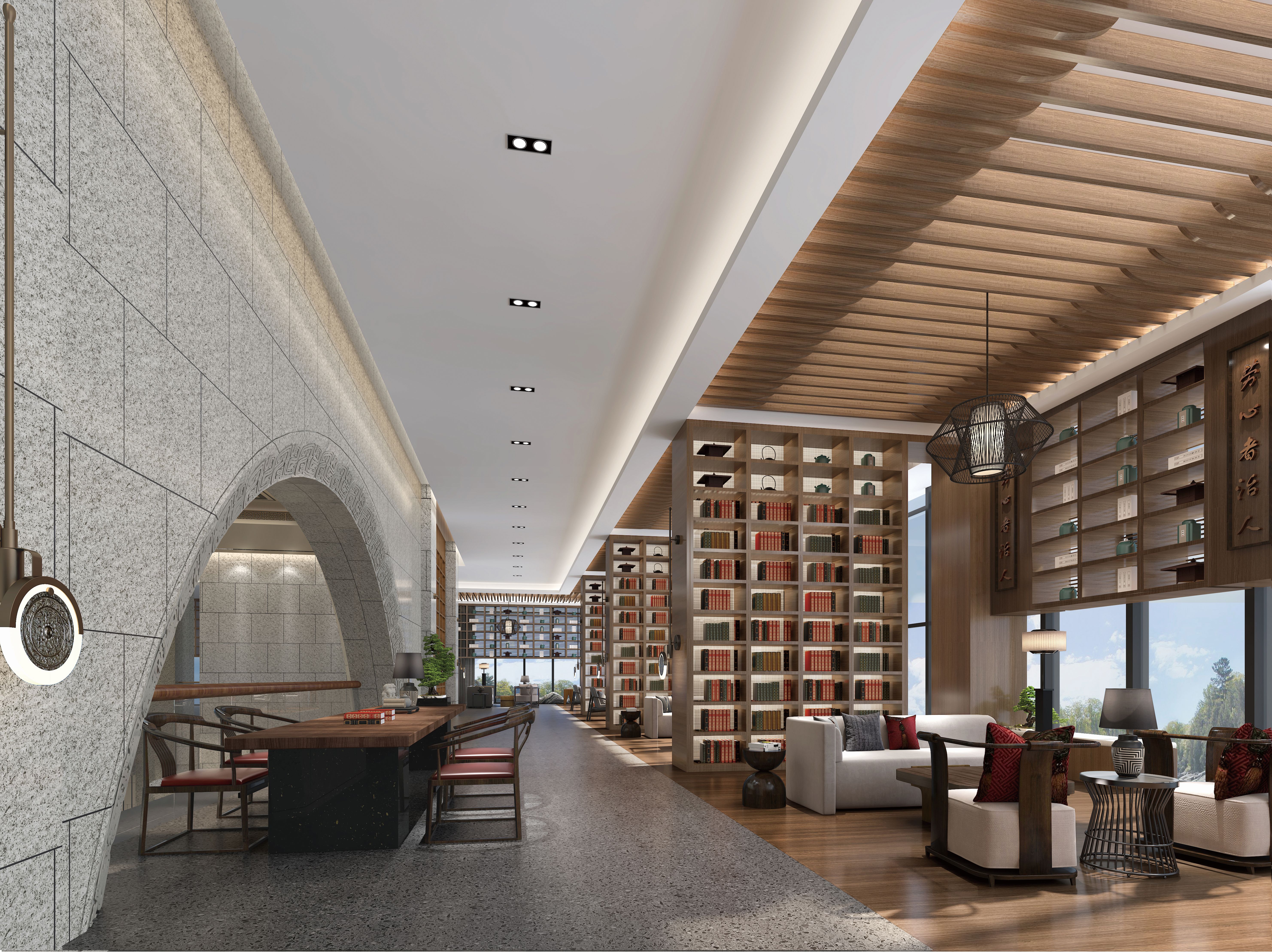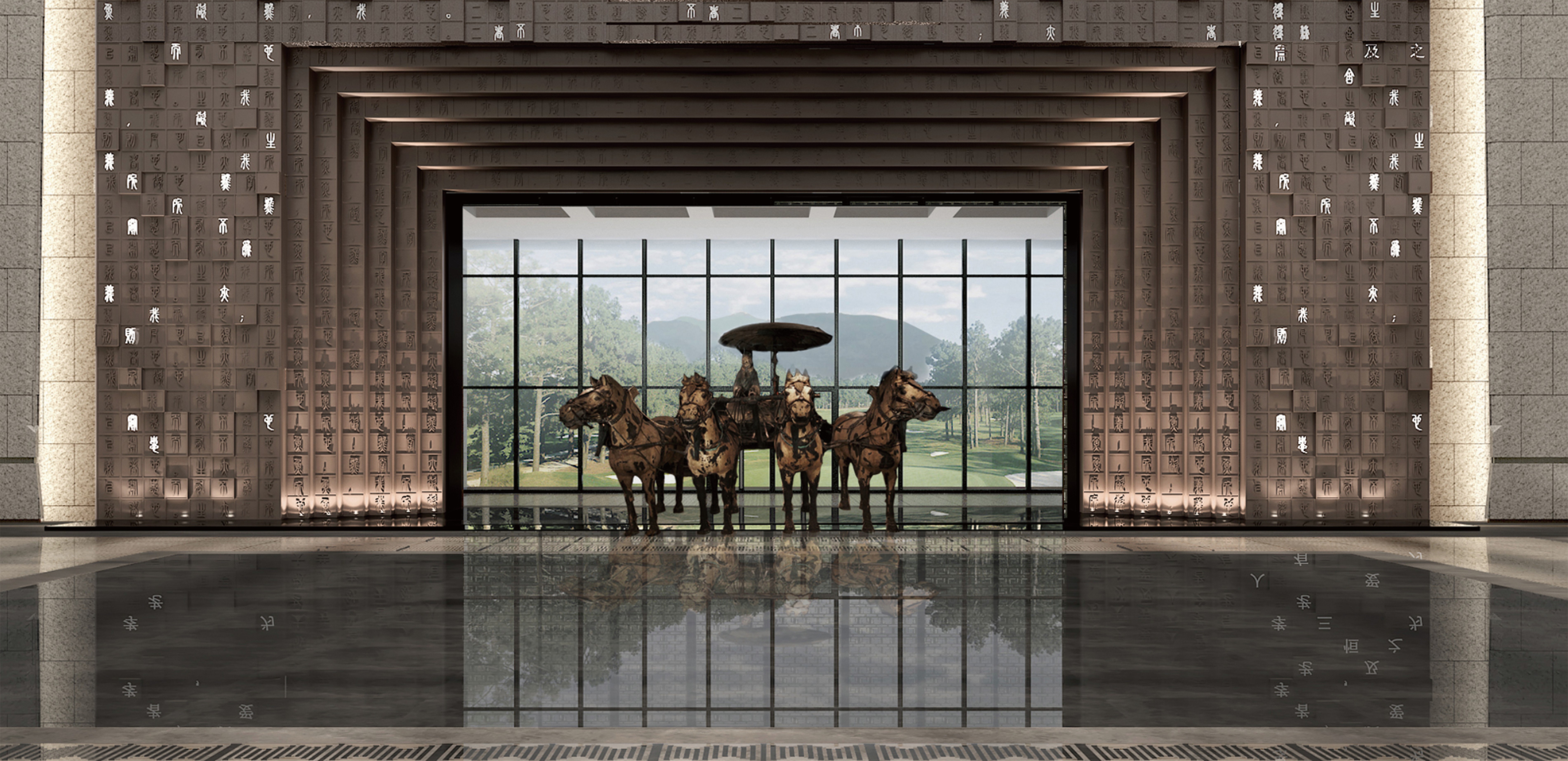 空间布局:将序厅后背景打开,空间延展,护驾山的景观融入室内,强调室内外互动意境,设计让人充分体验到室内空间与自然环境的融合,外庭运用自然山水写实的表现手法,而内庭则通过东方意境让整个空间显得灵动质朴,采用“天圆地方”的设计理念,方为地,沉稳广阔,故厚德载物。圆为天,空灵高远,故自强不息。