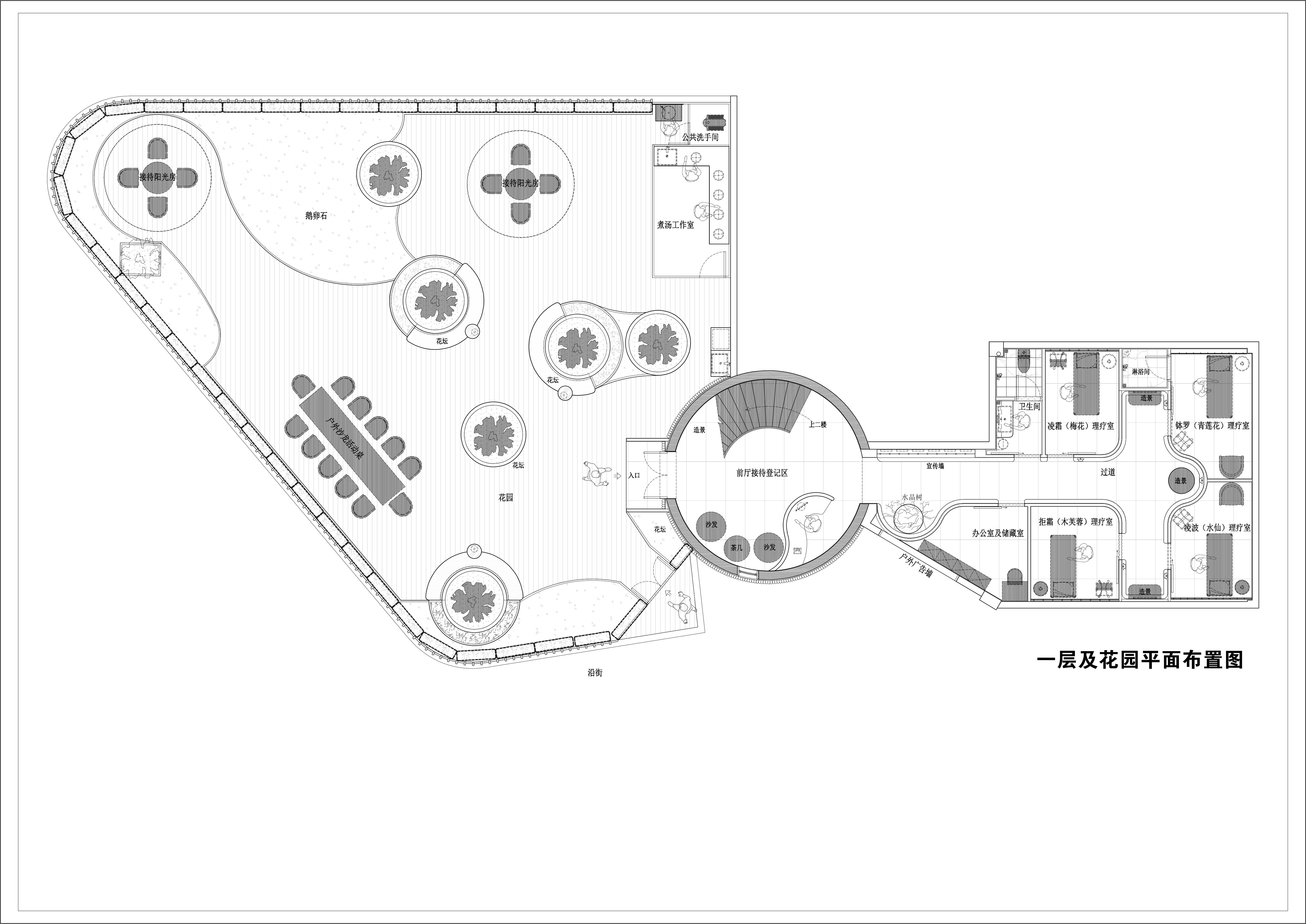 项目定位:项目主要针对女性身体健康管理做的体验店(通过康复手法、器械、茶汤专利)营造露天景观,产生休闲互动,满院鲜花让女性消费者流连忘返。