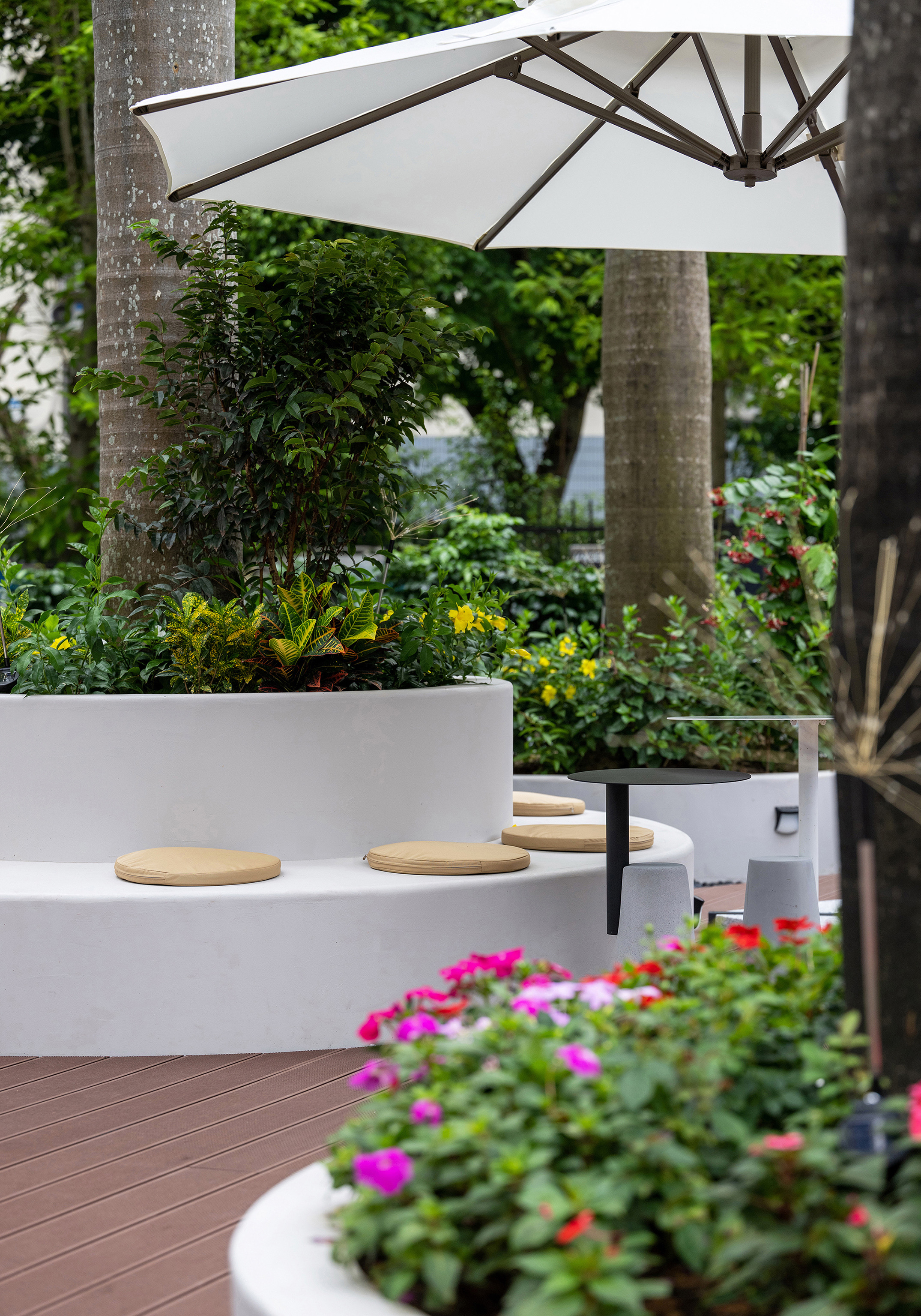围绕院子里几颗椰子树做的圆形花园休息区(一半可以休息,一半可以种各种鲜花)