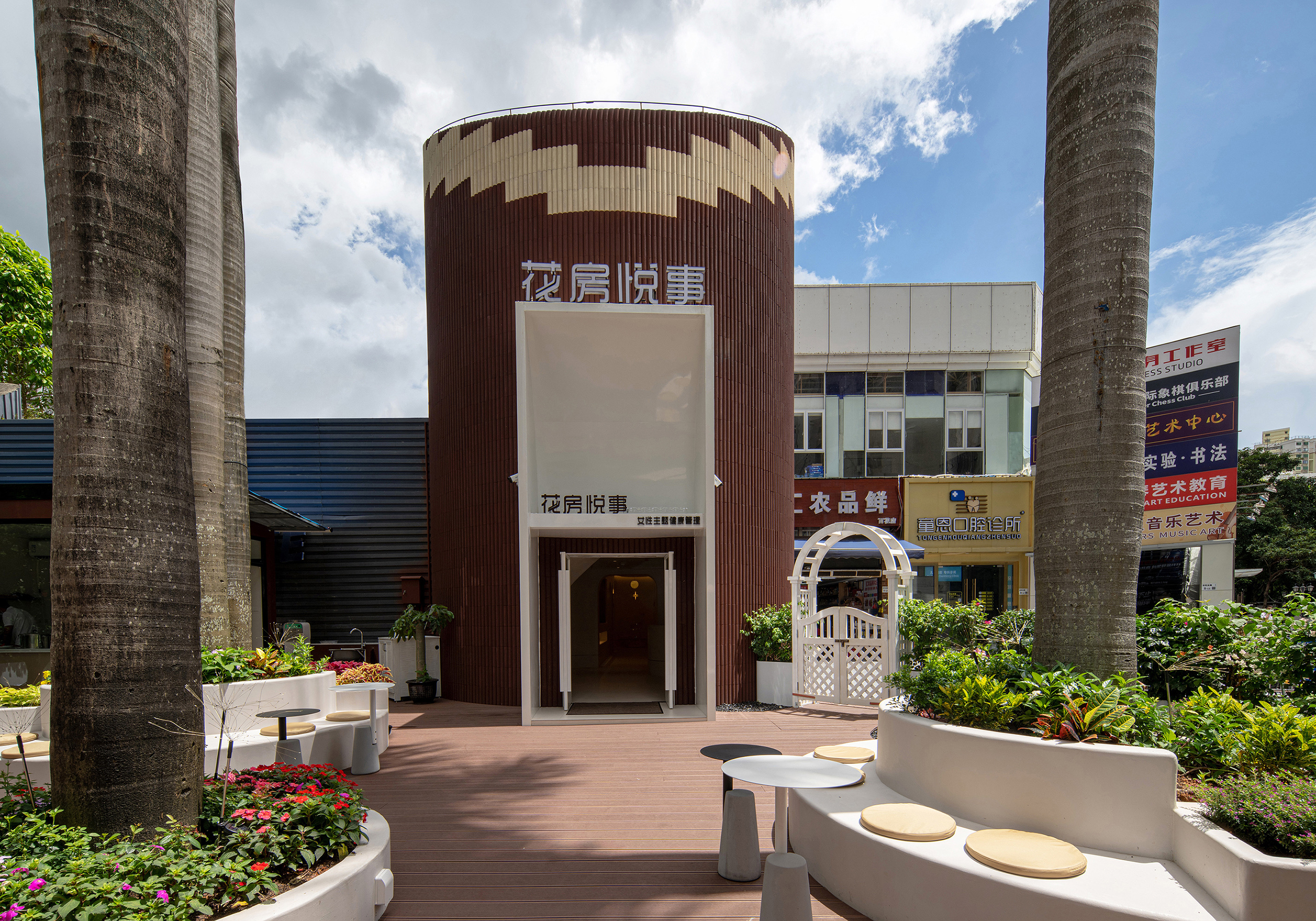 空间布局:设计手法:独立院子150平米,围绕椰子树做了花坛、休闲凳、种满各种鲜花,最重要的设计是在院子里穿插二个透明星空房(打卡、洽谈、休闲、派对)能更好的体验和互动。圆形筒状室内分为三层,一楼主要用于客户指引、接待,布局5个独立理疗室。二楼VIP独立休闲区及茶室。三楼为独立VIP功能调理房。