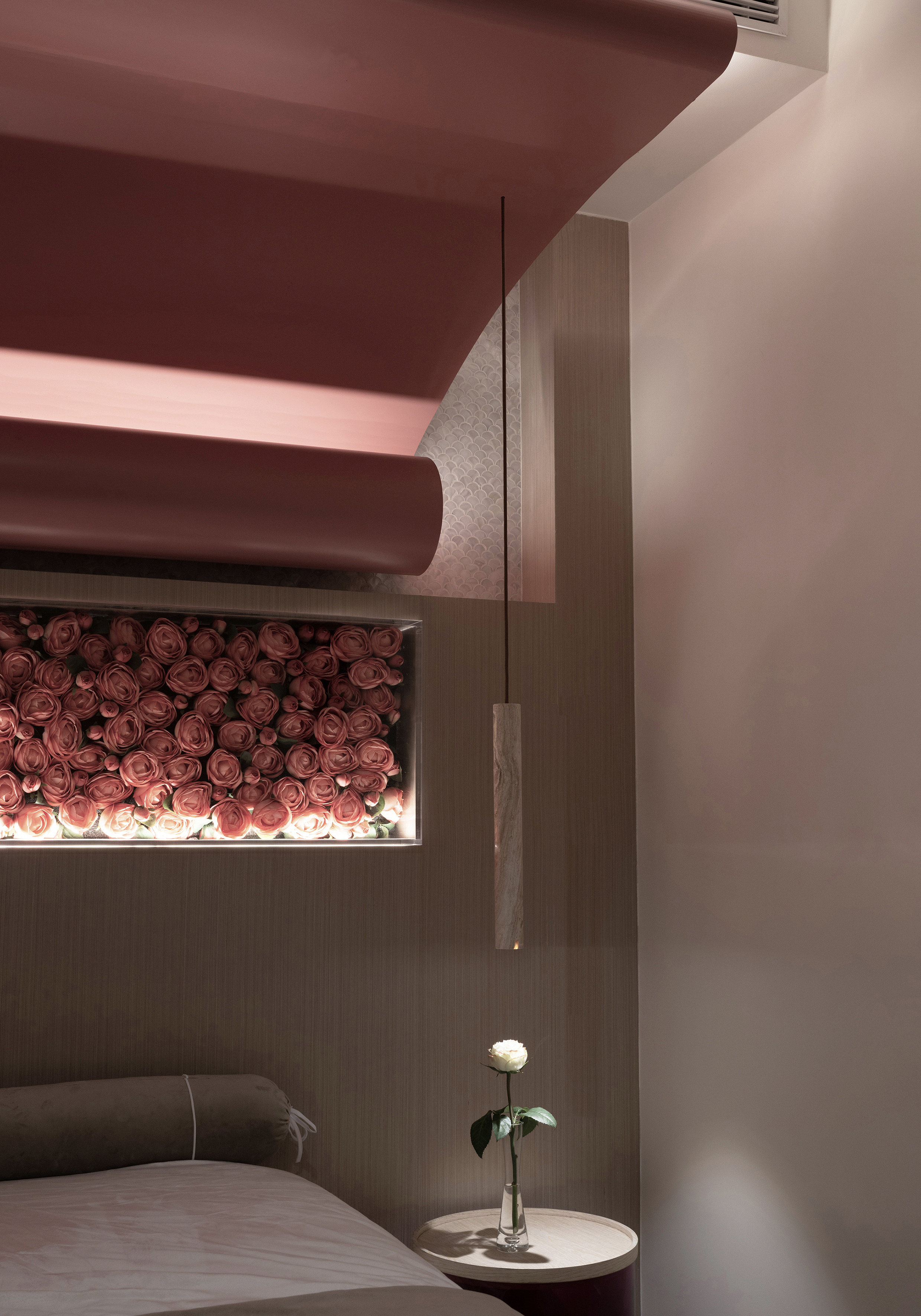 理疗房间室内景(桃红色超薄钢板卷帘吊顶造型、500支仿真玫瑰花朵背景)