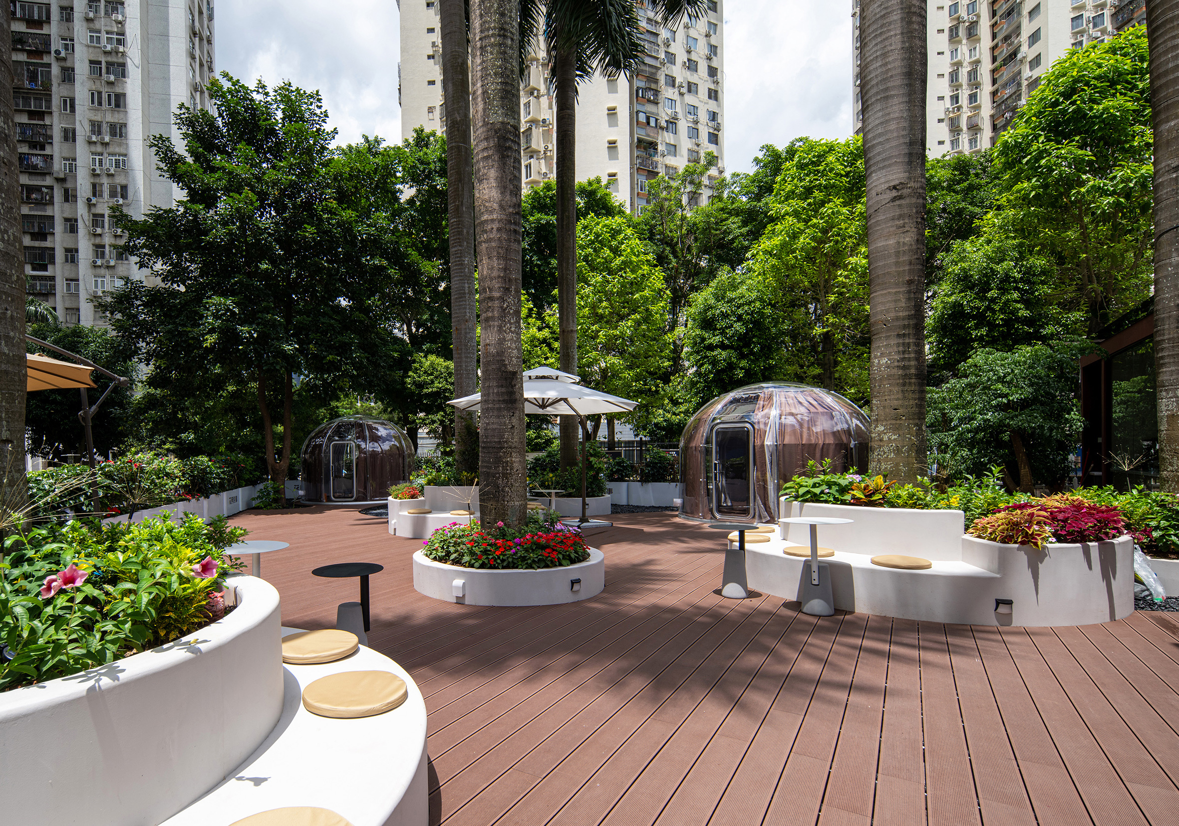 空间意境:环境:项目在深圳福田百花片区,该地段属于闹市区域,却拥有150平米的独特自然院景(椰子树、阶梯院落、楼宇环绕中),建筑是一个圆形筒状设计,独特有个性,远观视觉效果明显