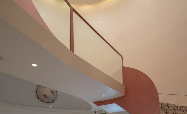 材料3:室内采用钢板弧形楼梯扶手、一体成型吊顶GRG造型、整体微水泥便于防潮、耐用 -