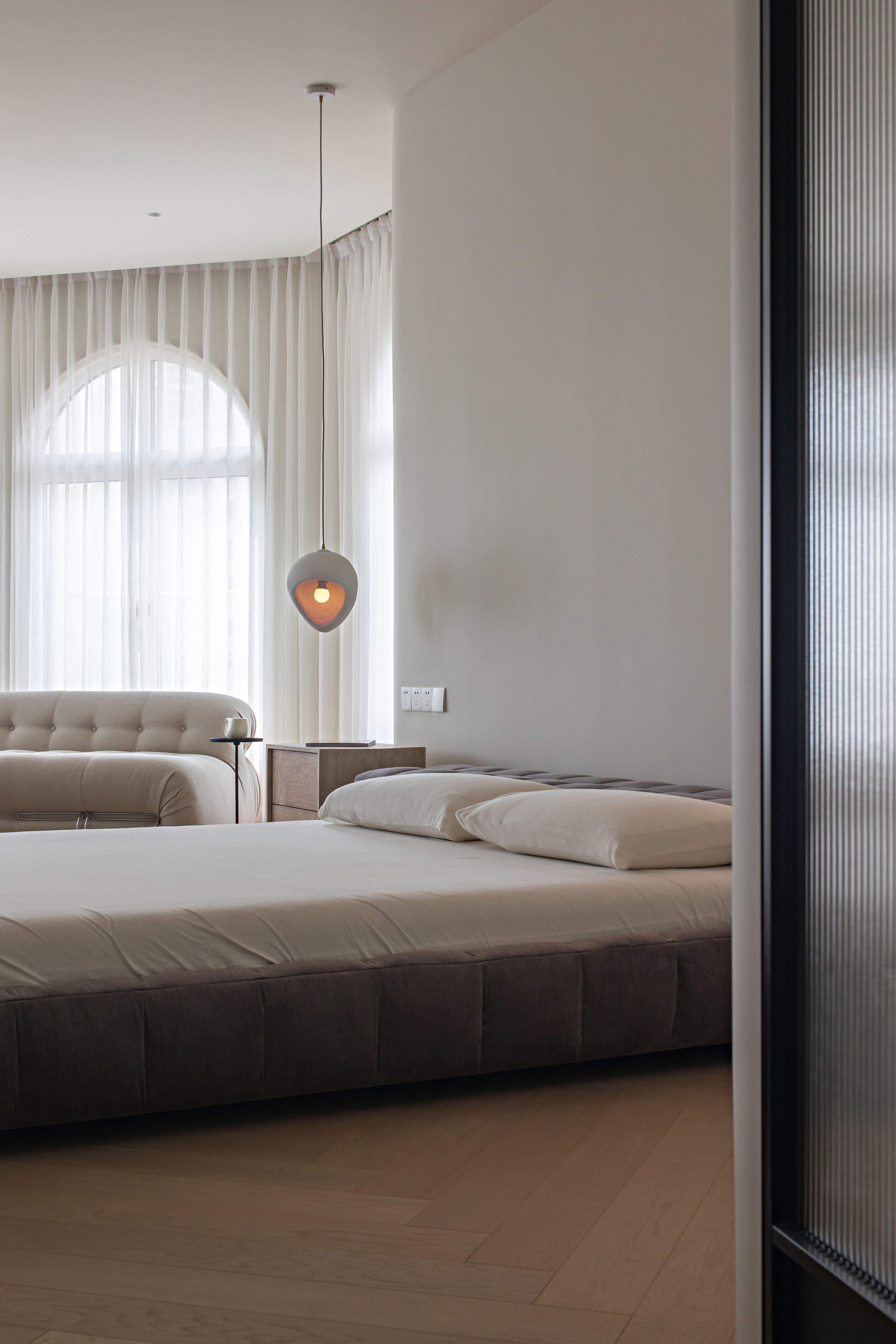 主卧空间拥有一块八角窗区域,我们特别的把窗洞改成了更偏浪漫主义的拱形,让主卧的休闲区域充满了浪漫色彩,恰如其分的绘制了另一幅唯美的画卷。