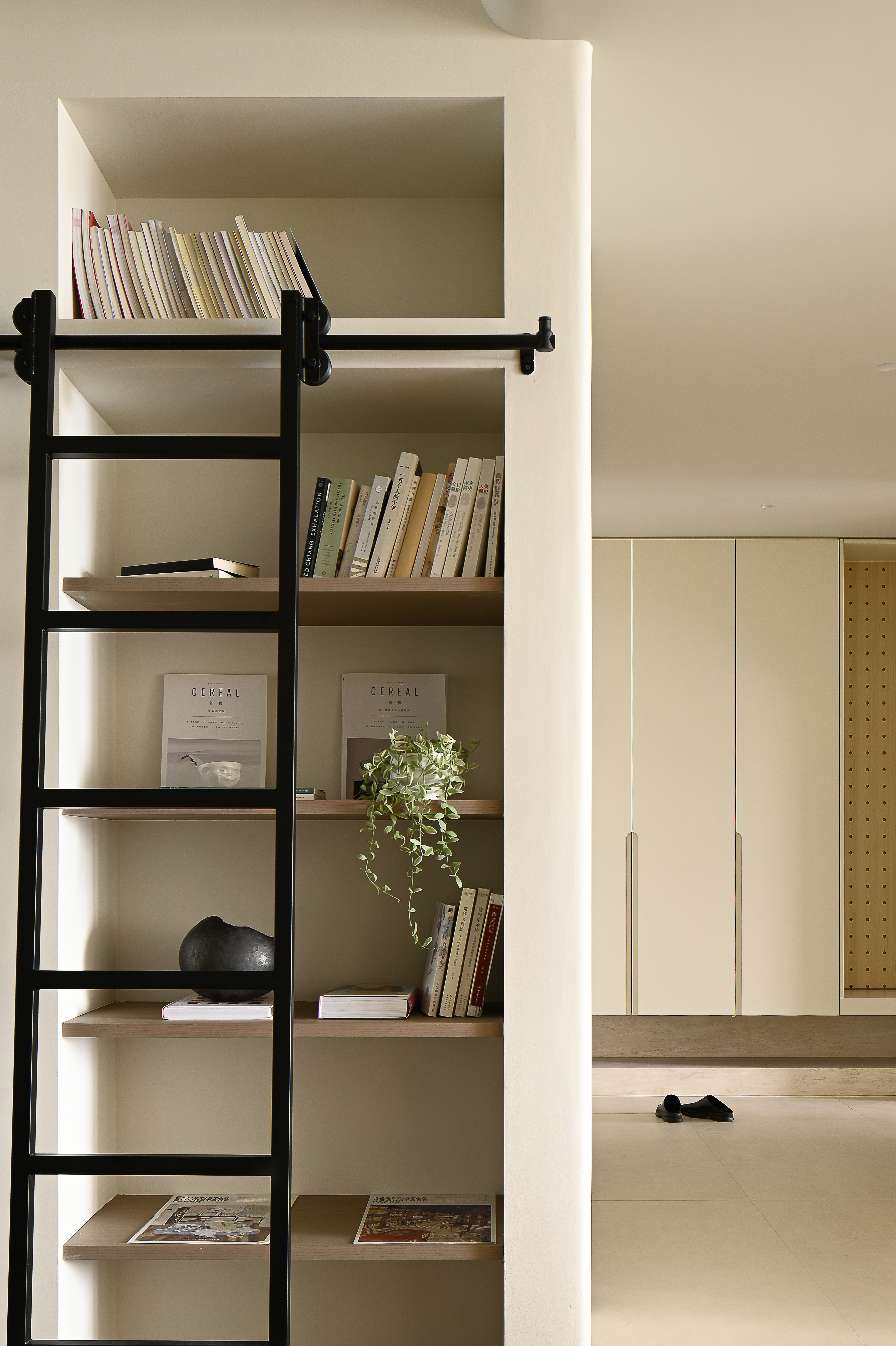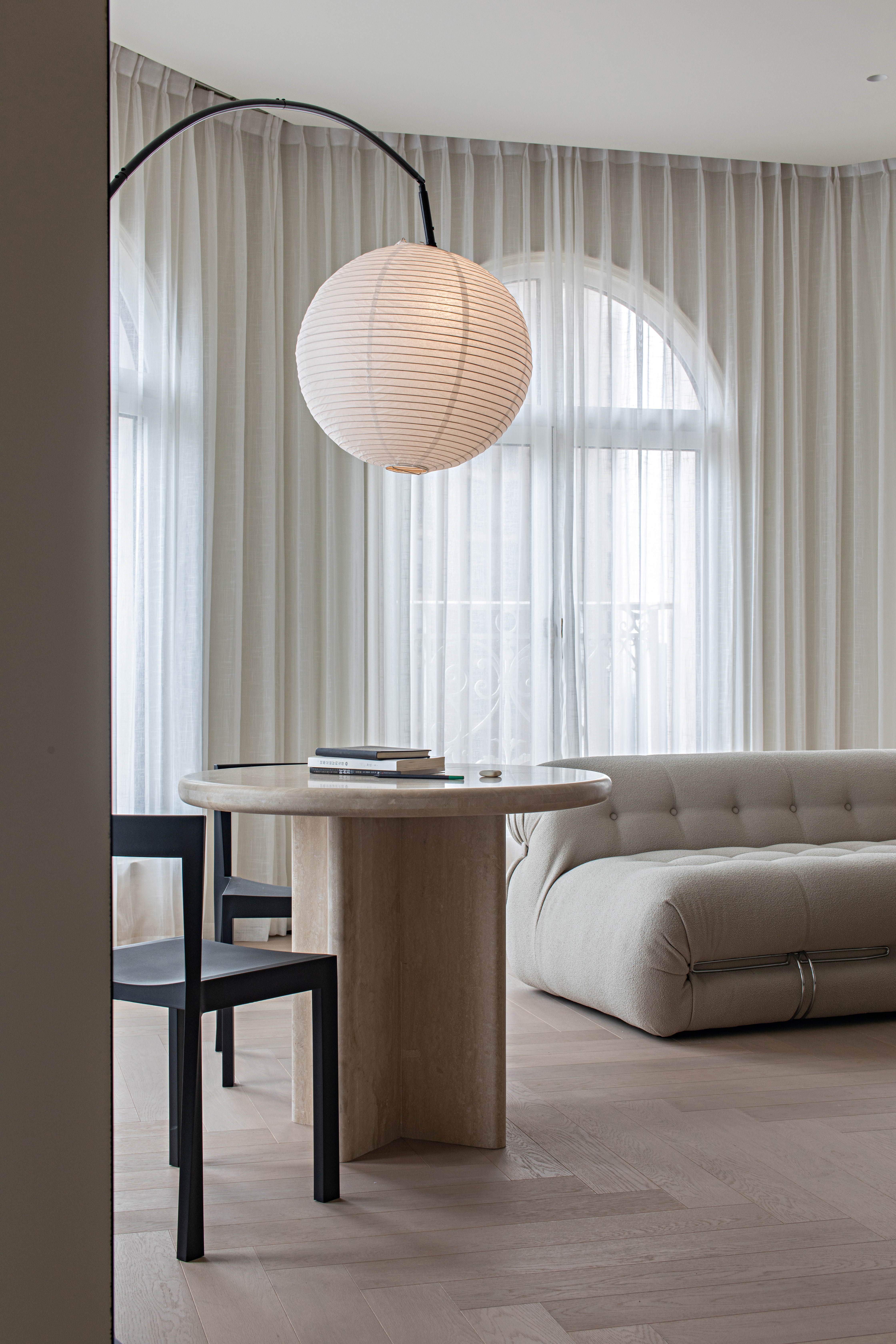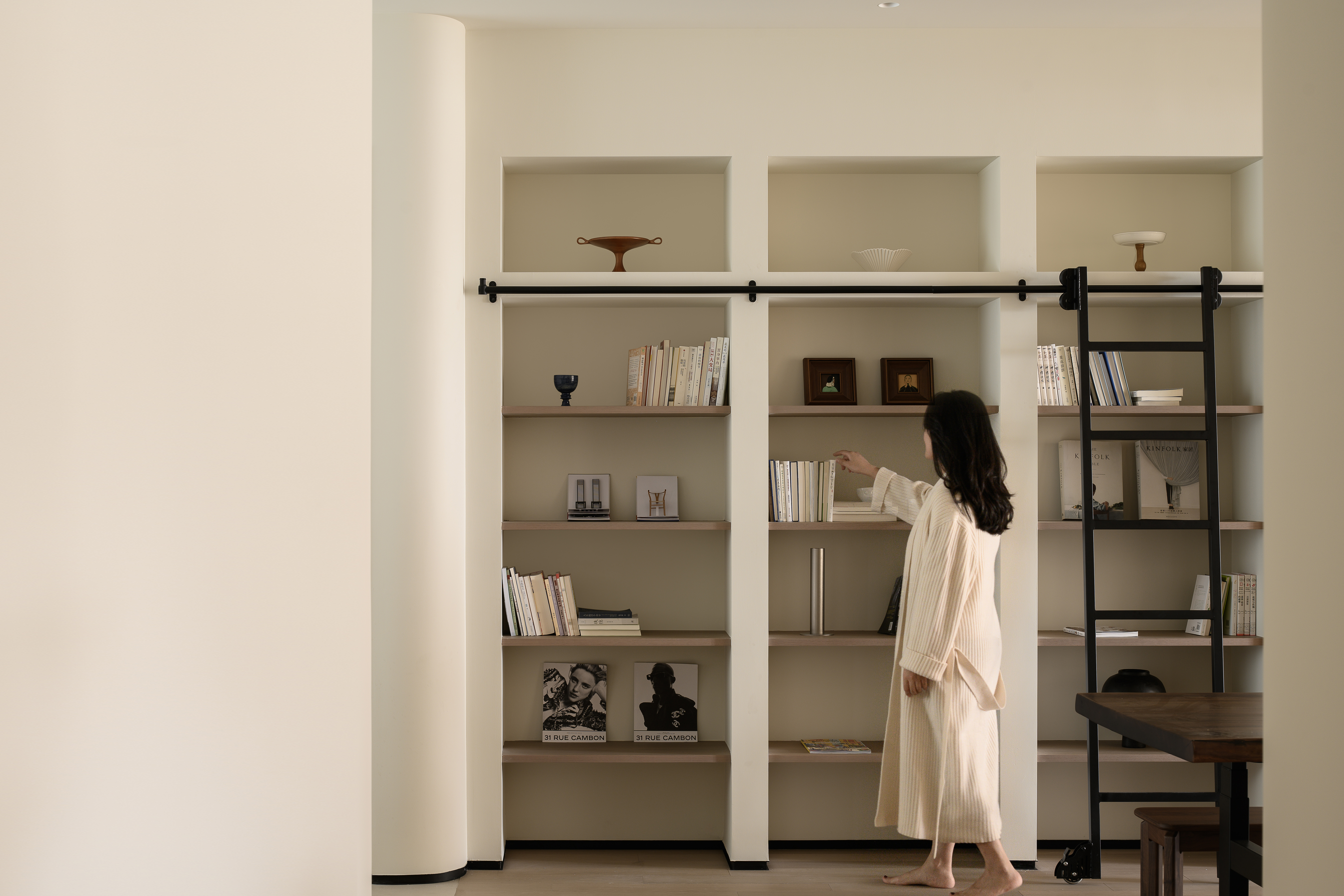 In the setting of low-saturation tones, we have chosen a white sofa series, matched with textured wood and the integration of black vintage steel doors, filling the entire home with romantic hues.