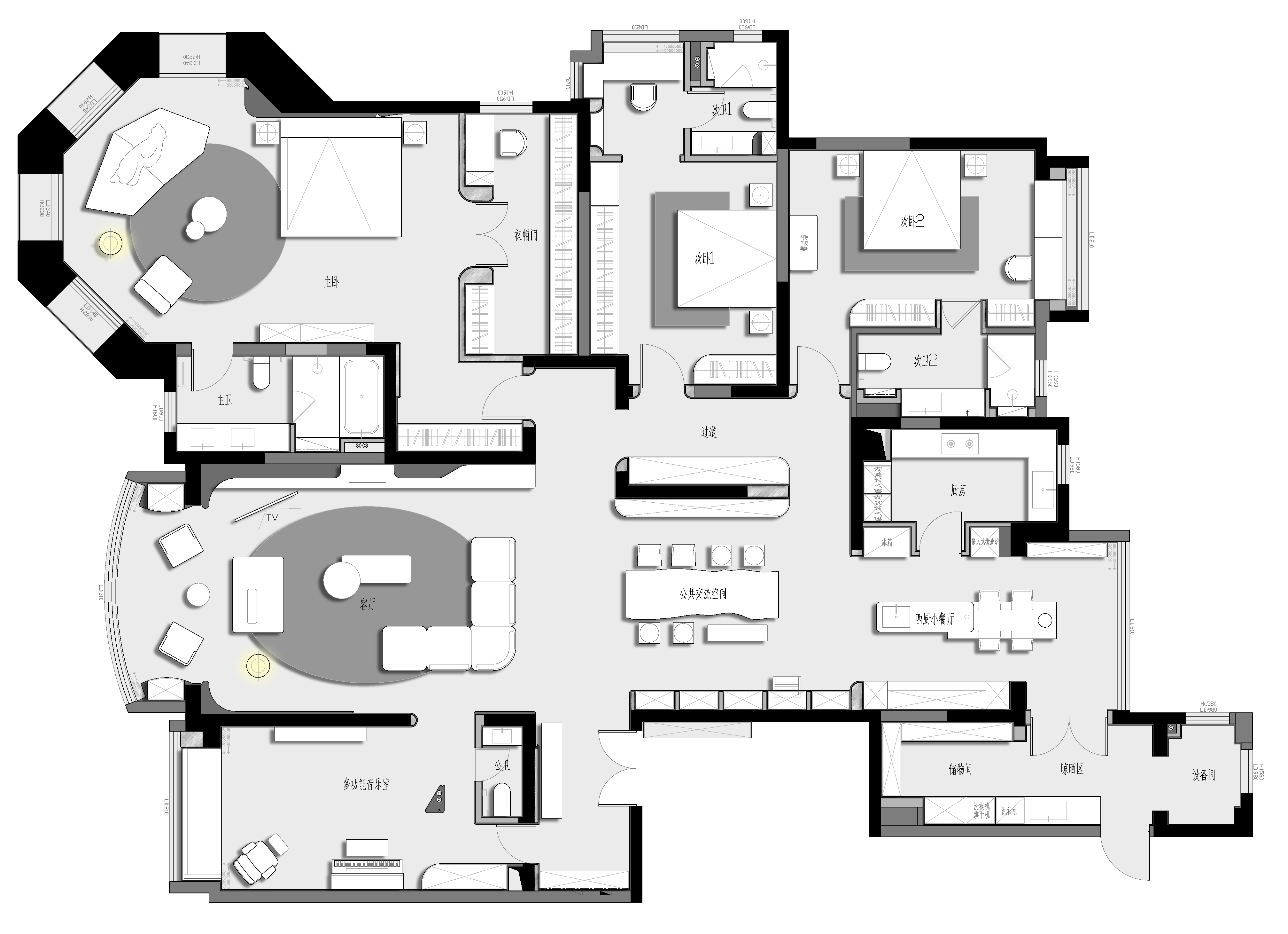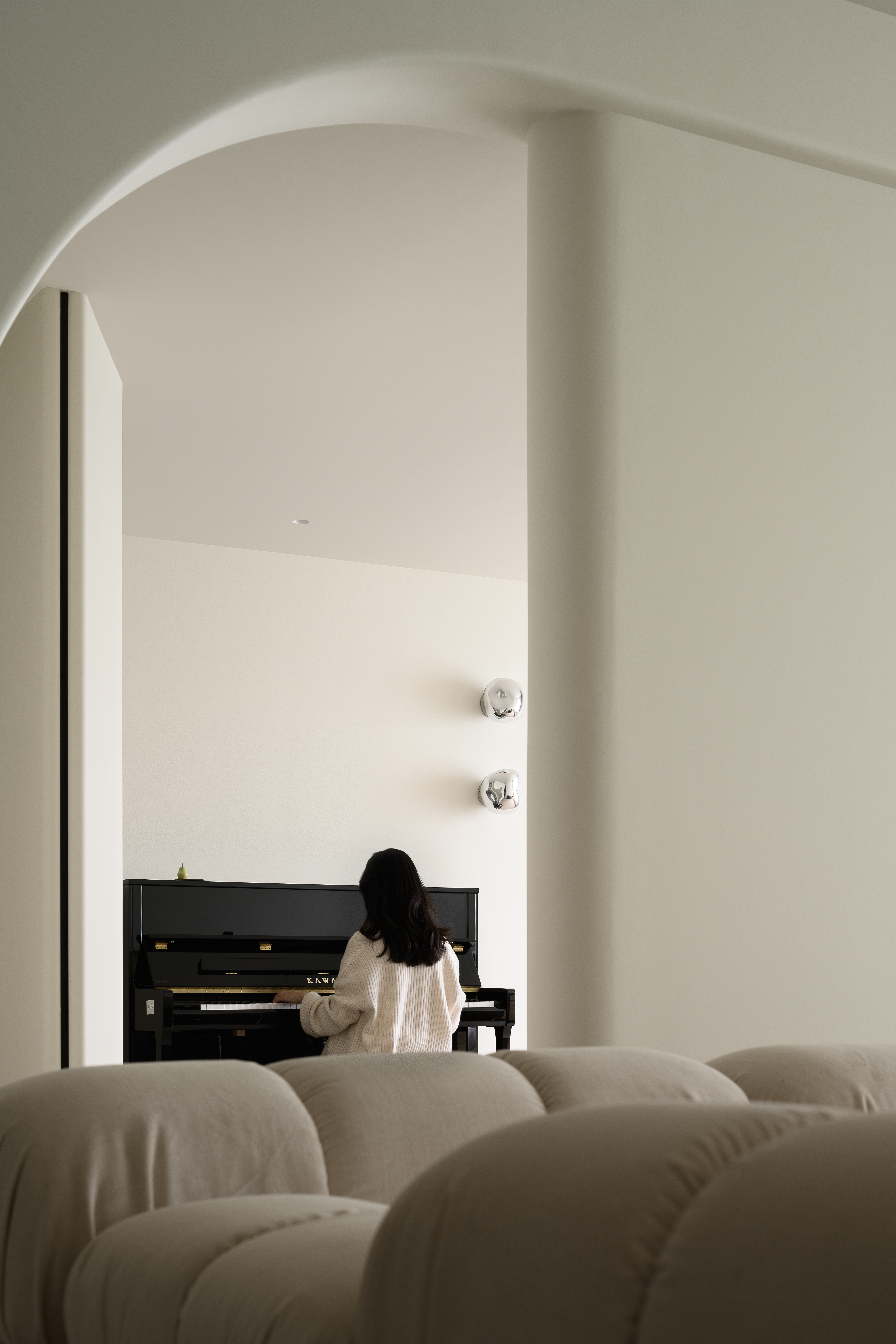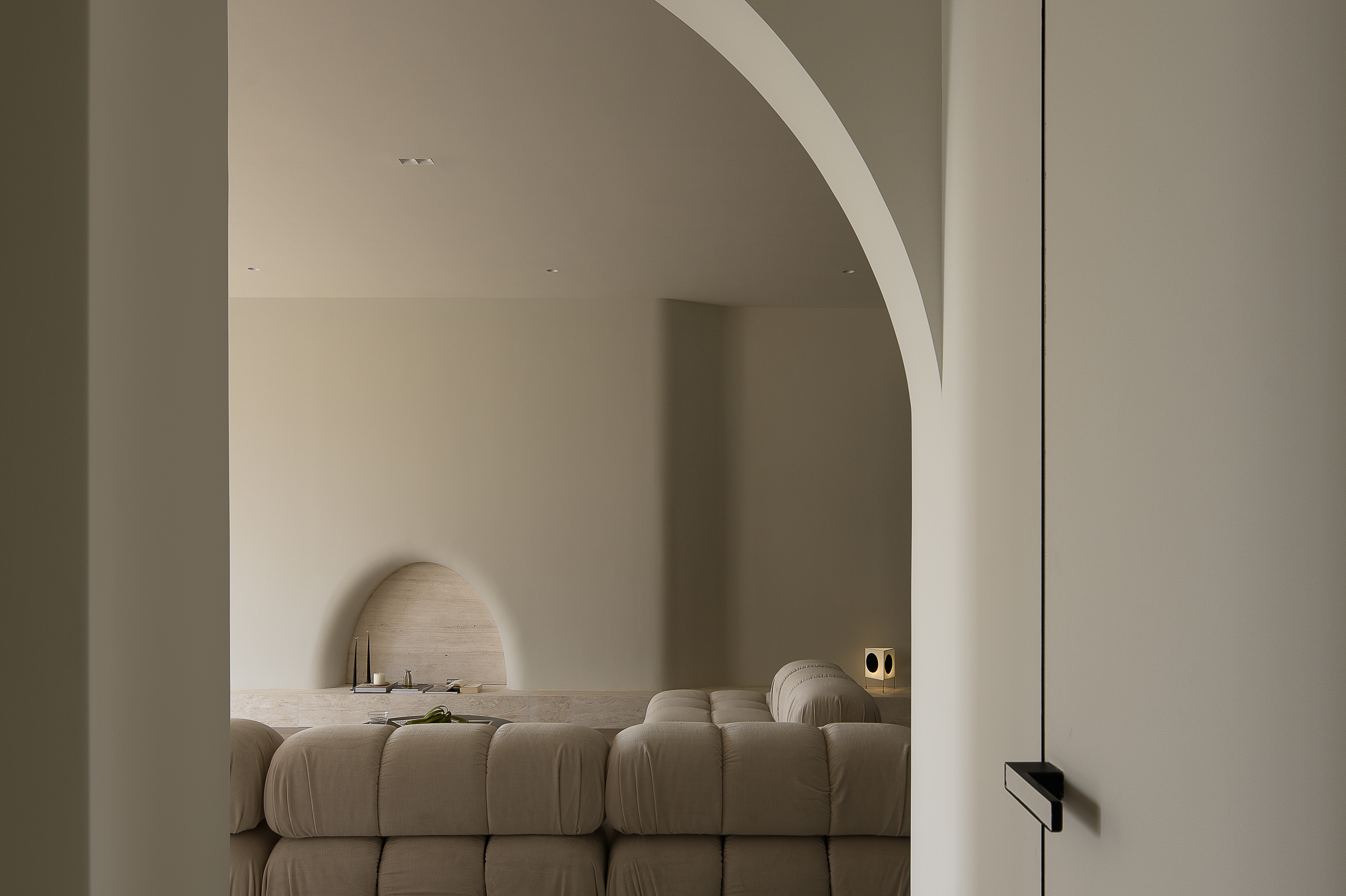 项目定位:本案为360平的大平层住宅,我们将整个公共区域打开,区分了公共区域与休息区域。客厅区域与琴房贯通,通过门洞呈现了另一幅画卷。