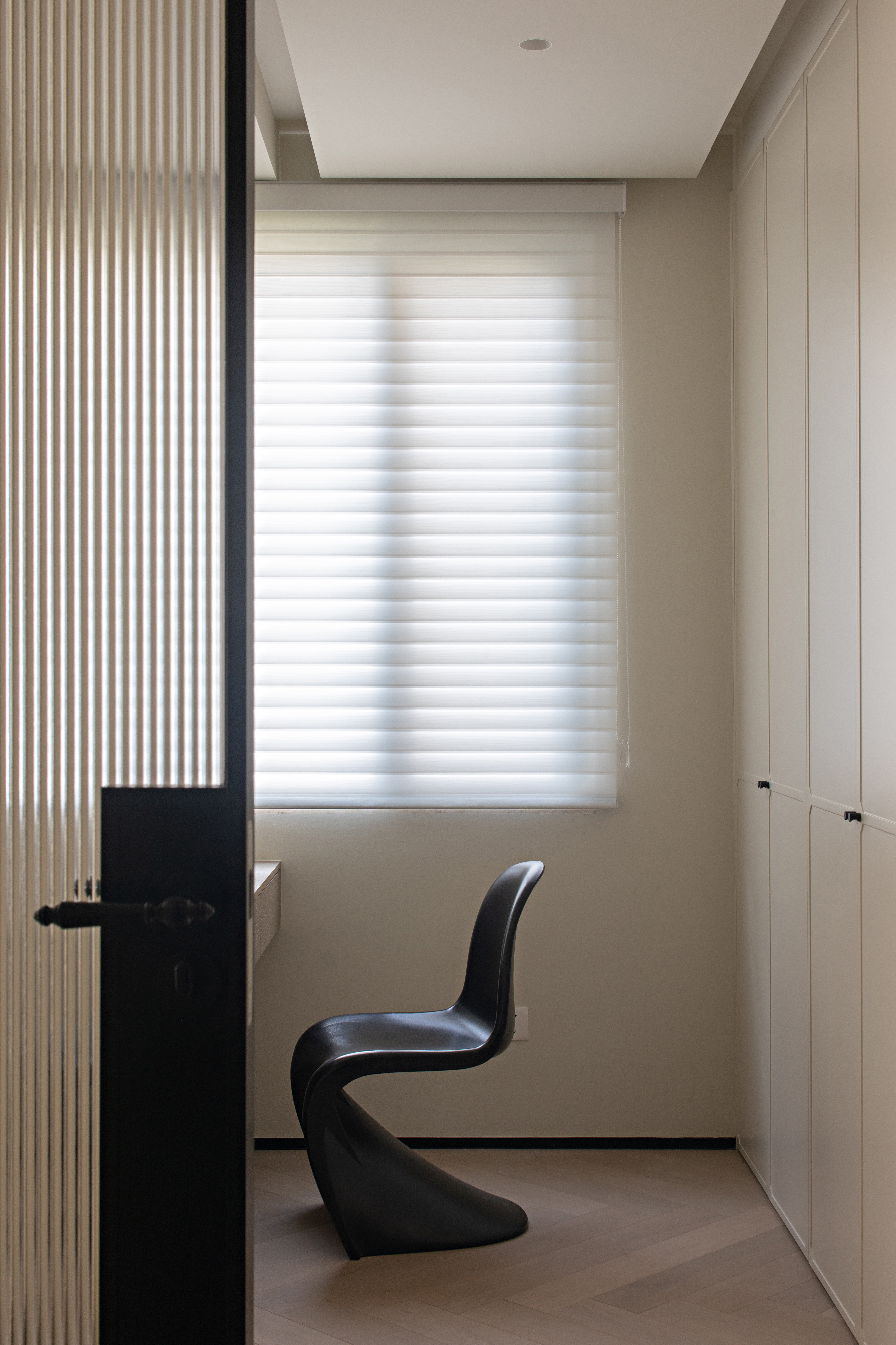 The master bedroom's floor is made of herringbone parquet, with the wardrobe door featuring a vintage steel door, and a textured cabinet adding layers and enriching the overall feel of the space. -