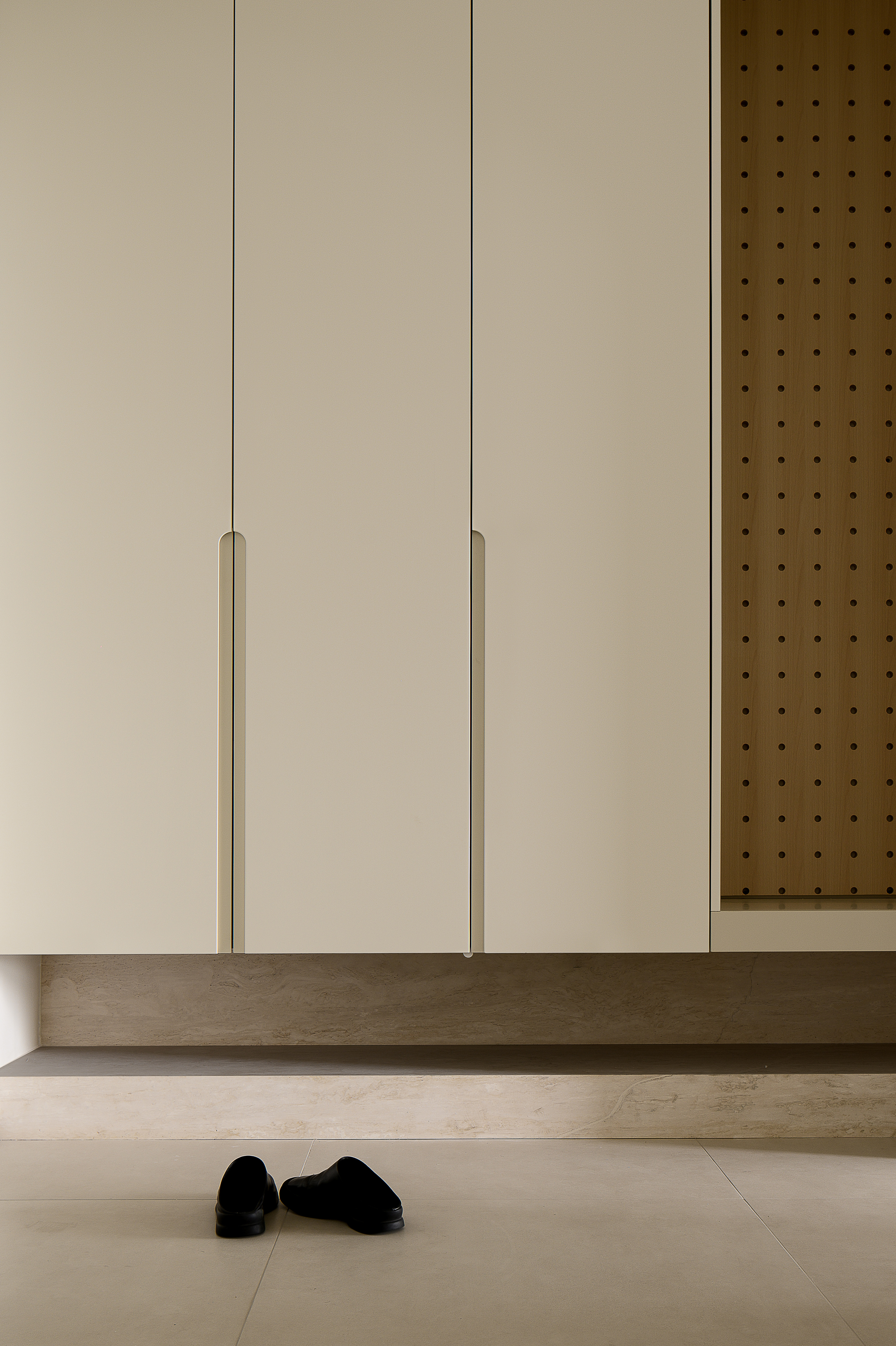From the entrance's foyer, there is a shoe cabinet that caters to the entire family. From the foyer, it extends inward to the living room and the long table area.