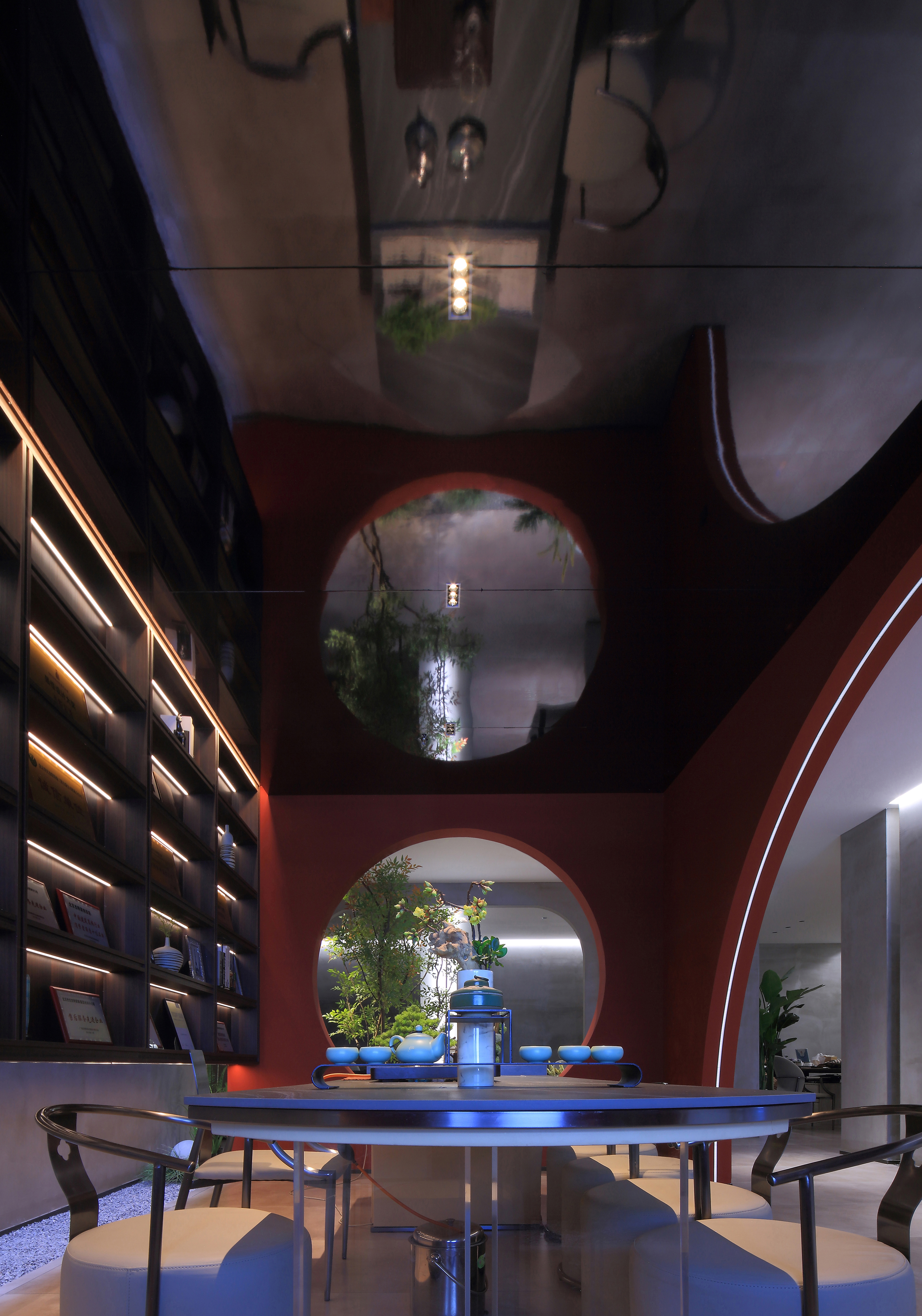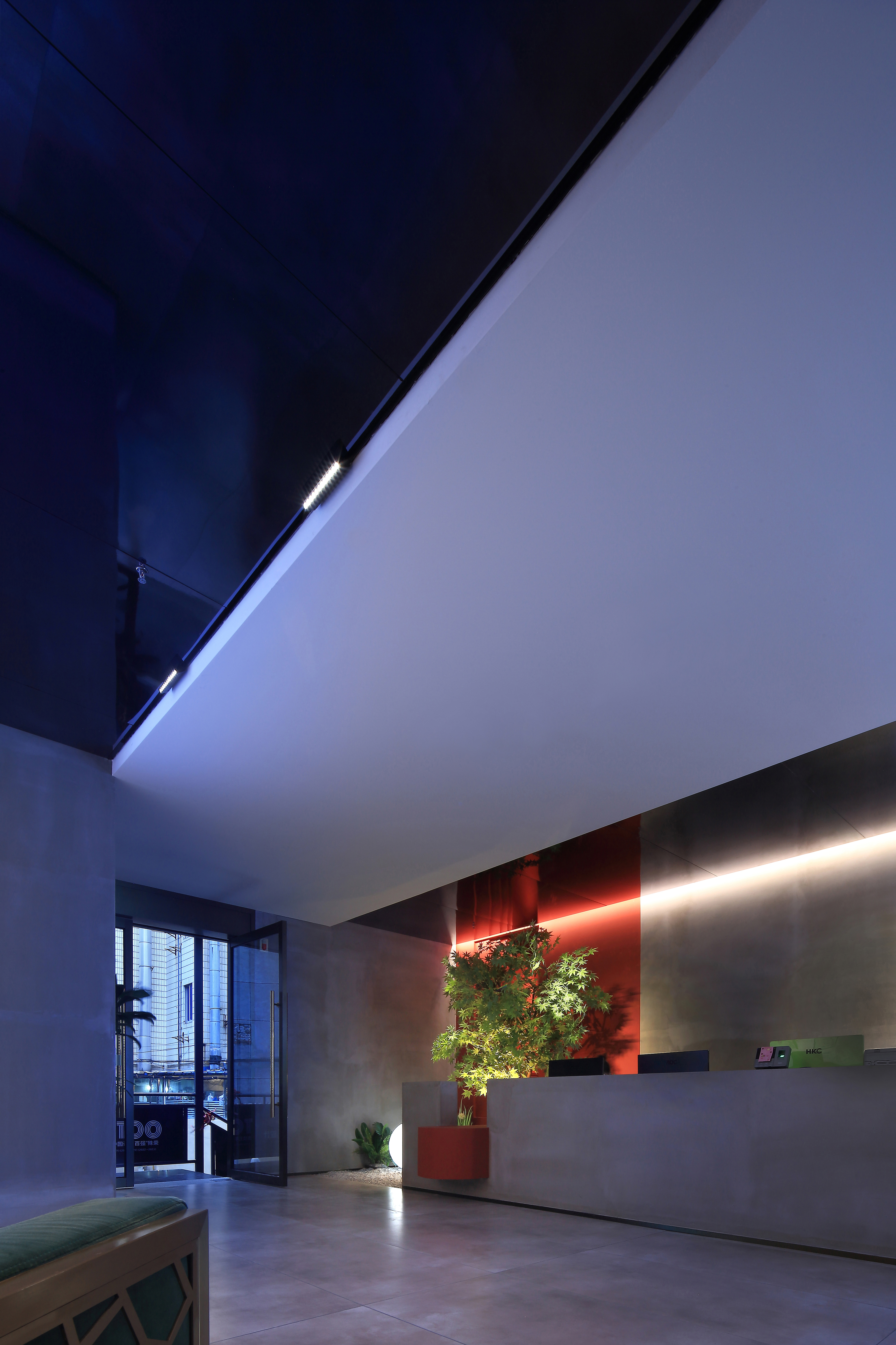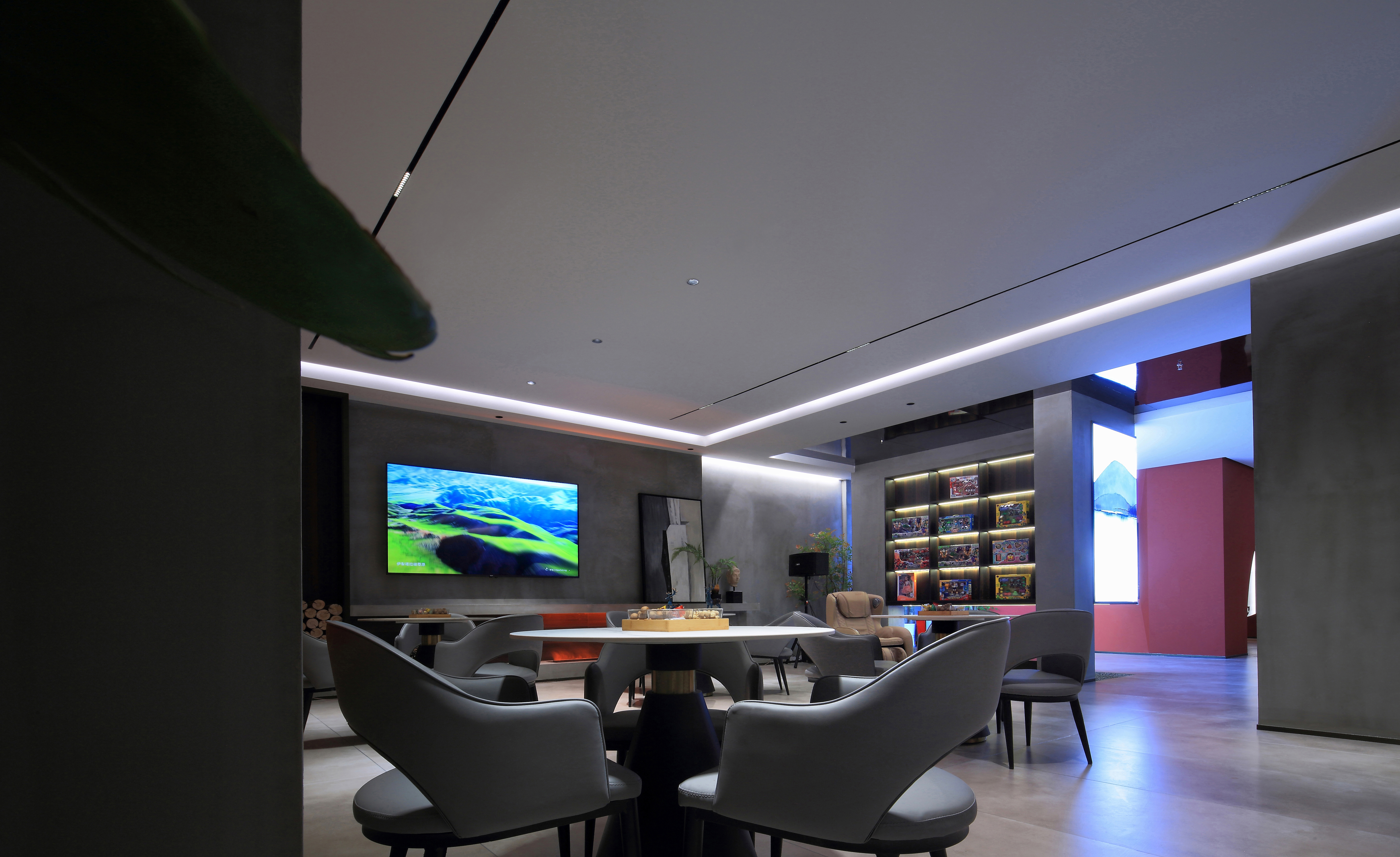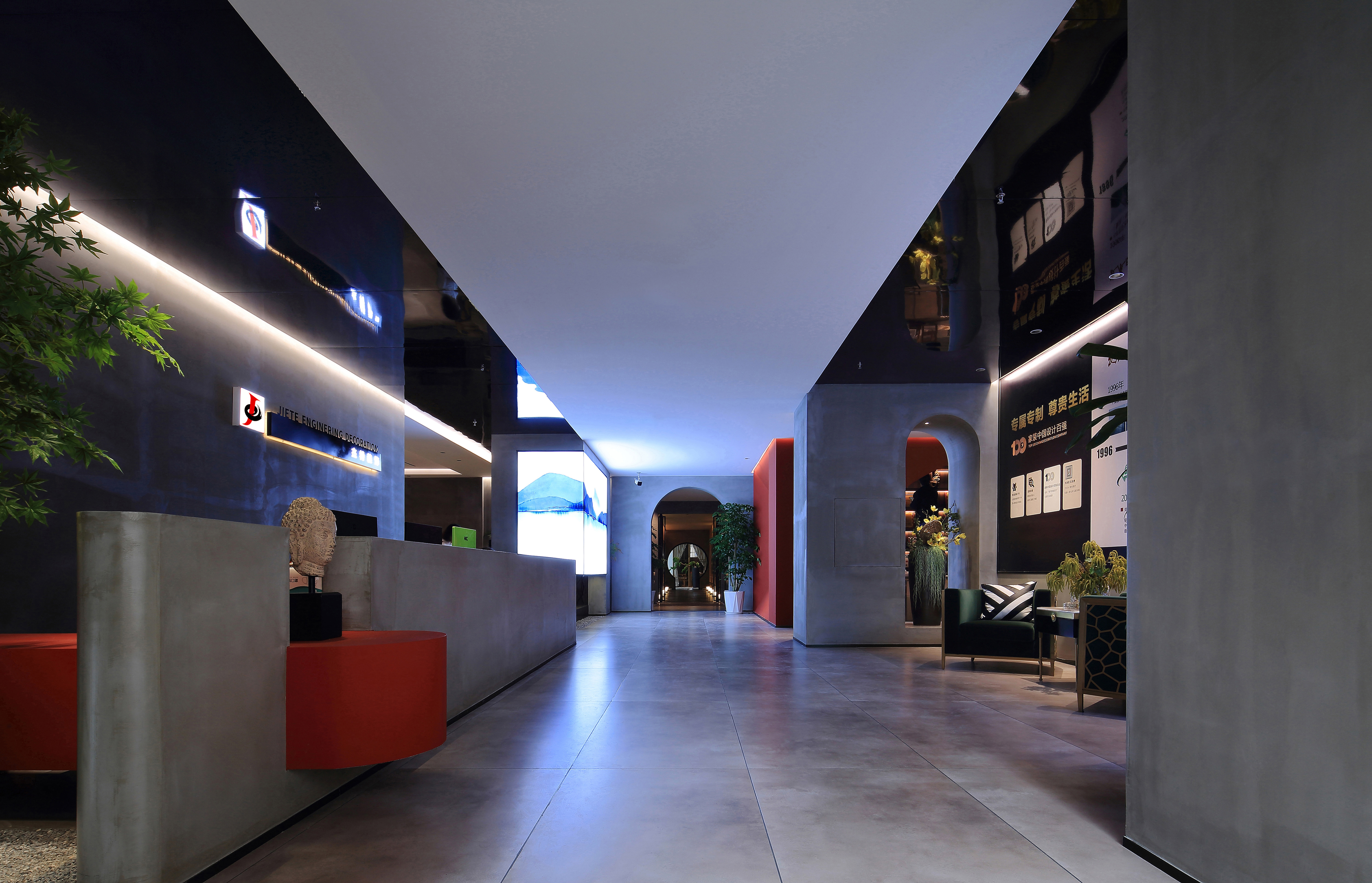 普通的材料一样能达到设计的高级感,大面积饰面采用抗裂砂浆只为表达那份原生态的质朴之情,低碳环保,红色乳胶漆的点赞提升视觉冲击力,打破沉闷的空间感,激发员工的热情和想象力,提高工作效率,顶面镜面板运用丰富了空间的层次,张弛有度,无限向上的精神激励着每一个员工。