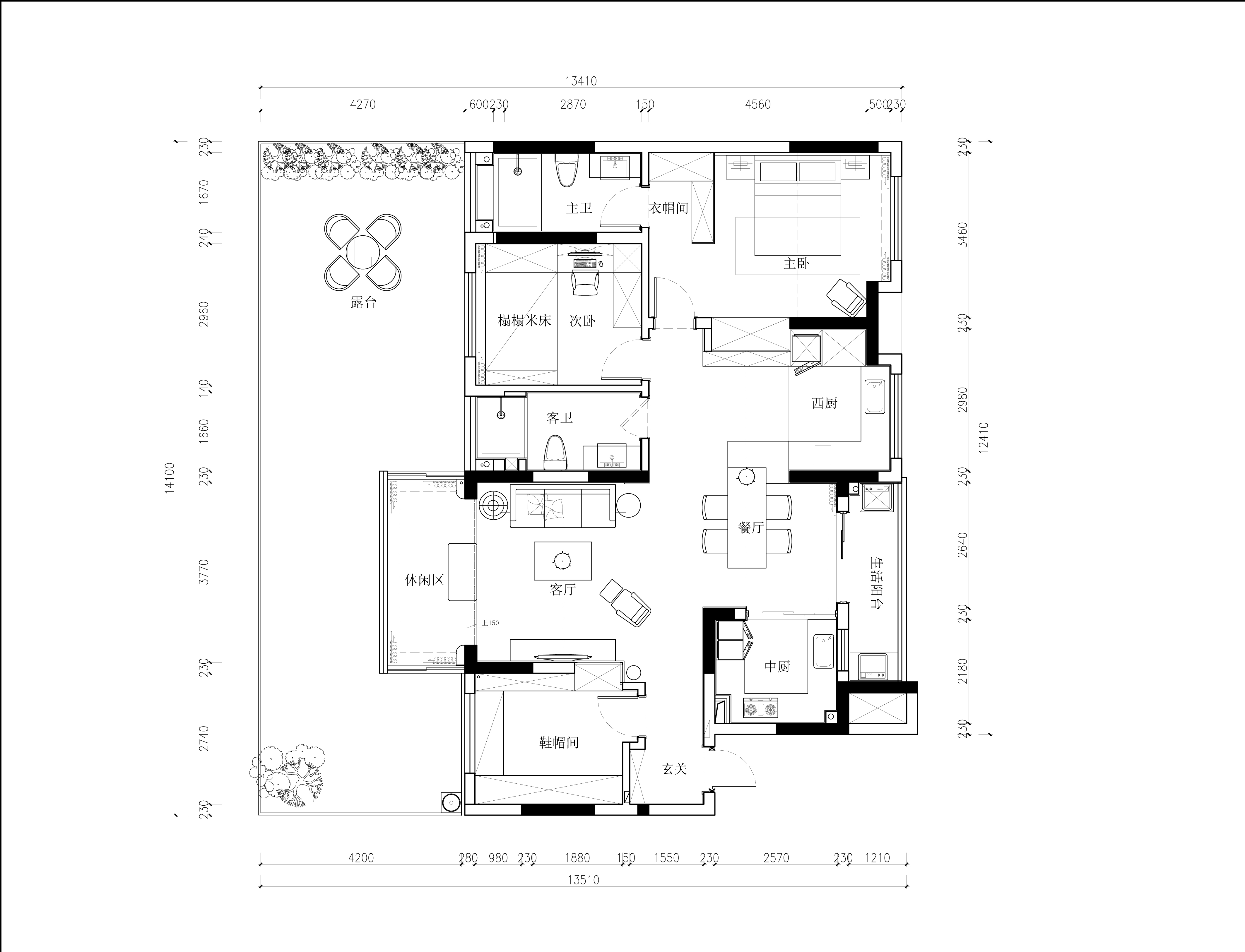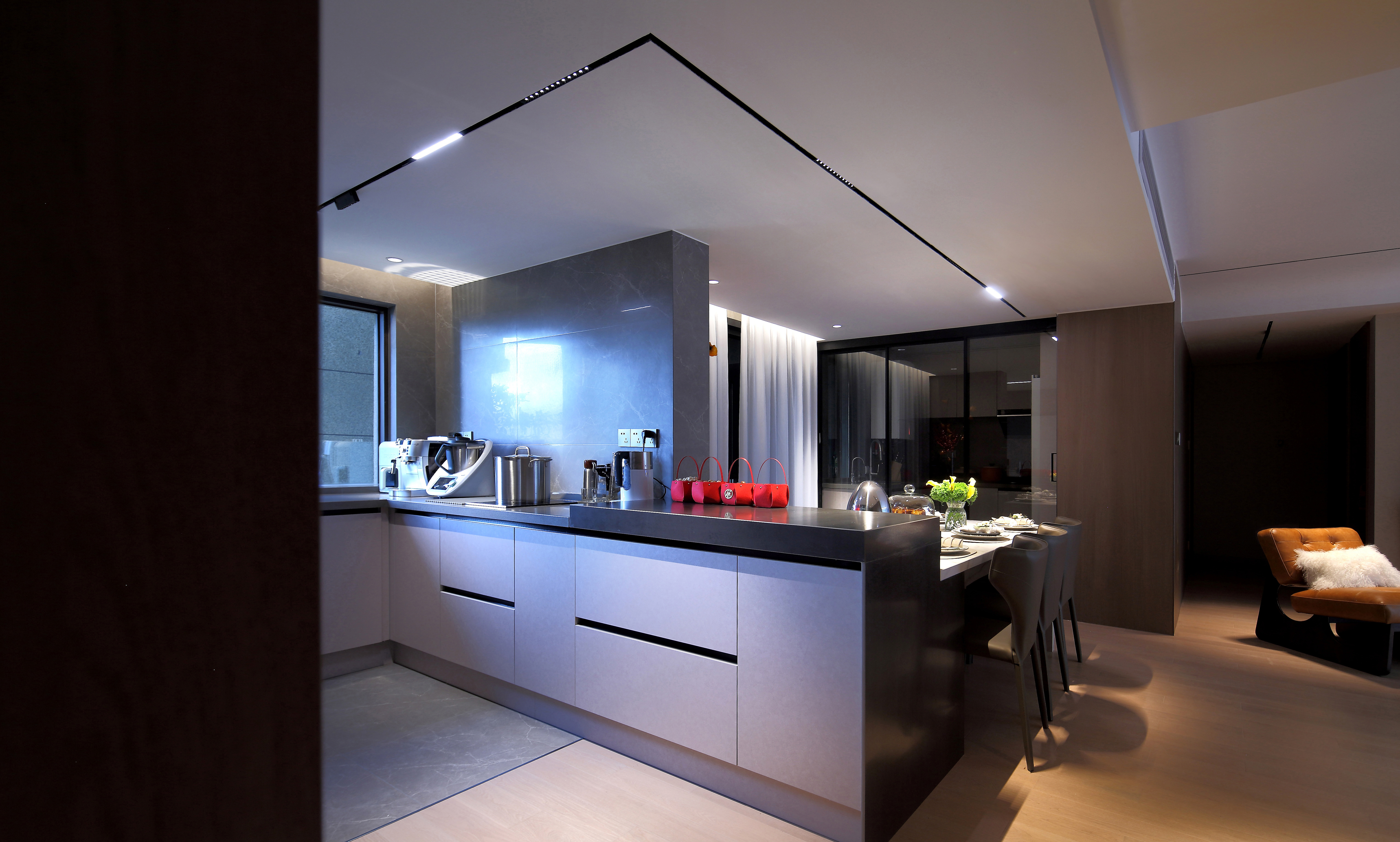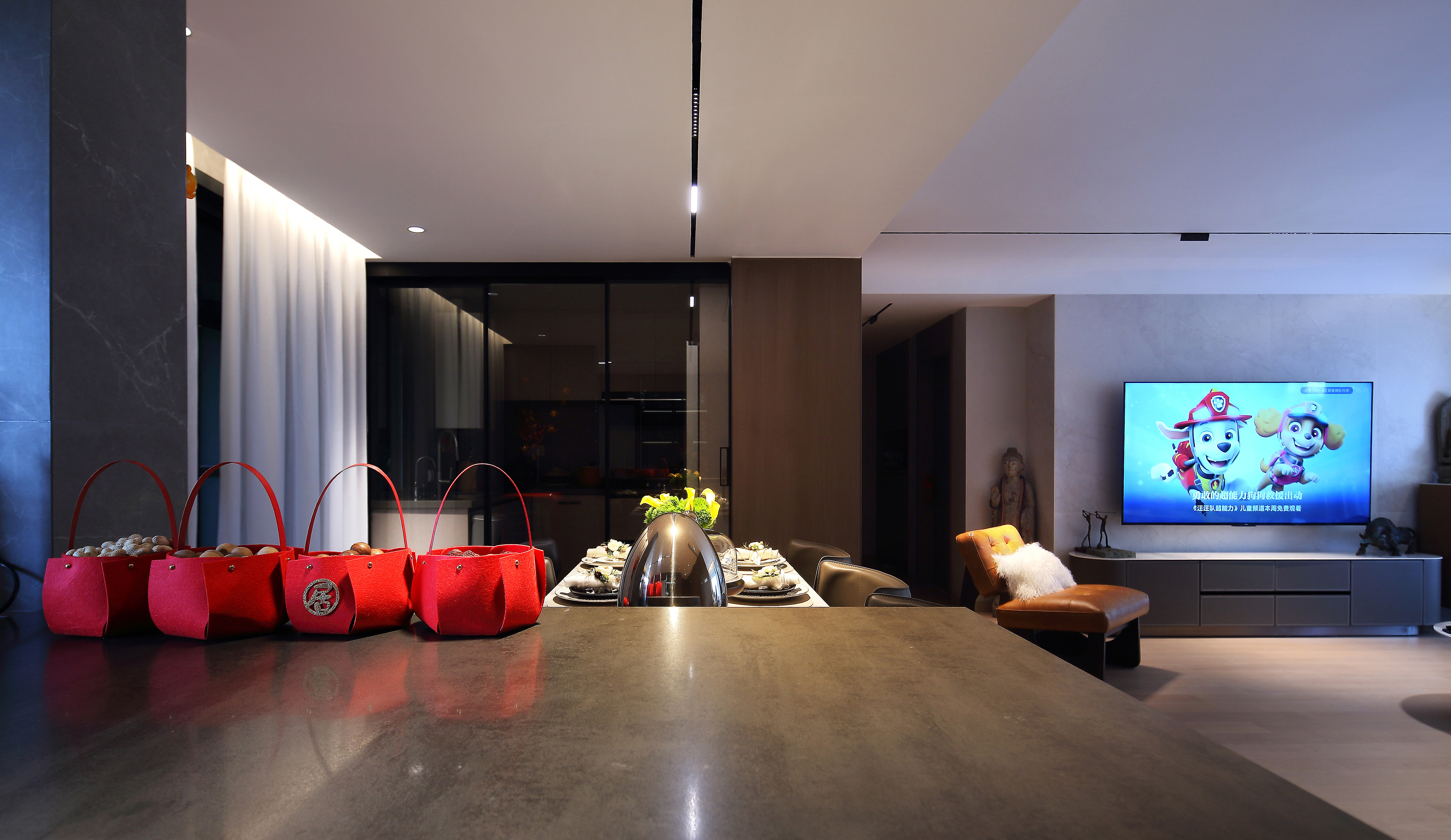 空间布局:对美食喜好要求厨房烹饪空间、储物空间足够宽敞,在保证基本功能外舍弃两个房间改为鞋帽间和西厨,开放式的西厨空间拓展了居家公区的视野,彰显大宅风范。