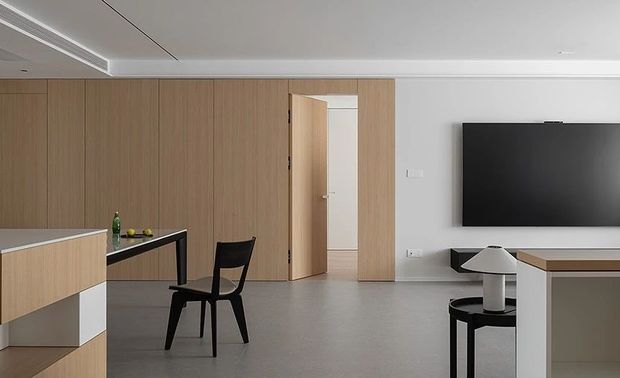 主卧延续了空间整体简洁素雅的感觉,让休息更加纯粹,木饰面与灰色硬包的组合,让空间更加柔和。
