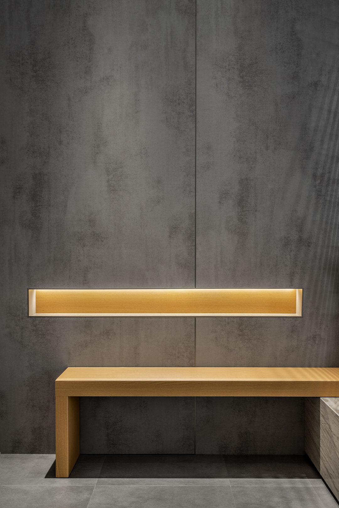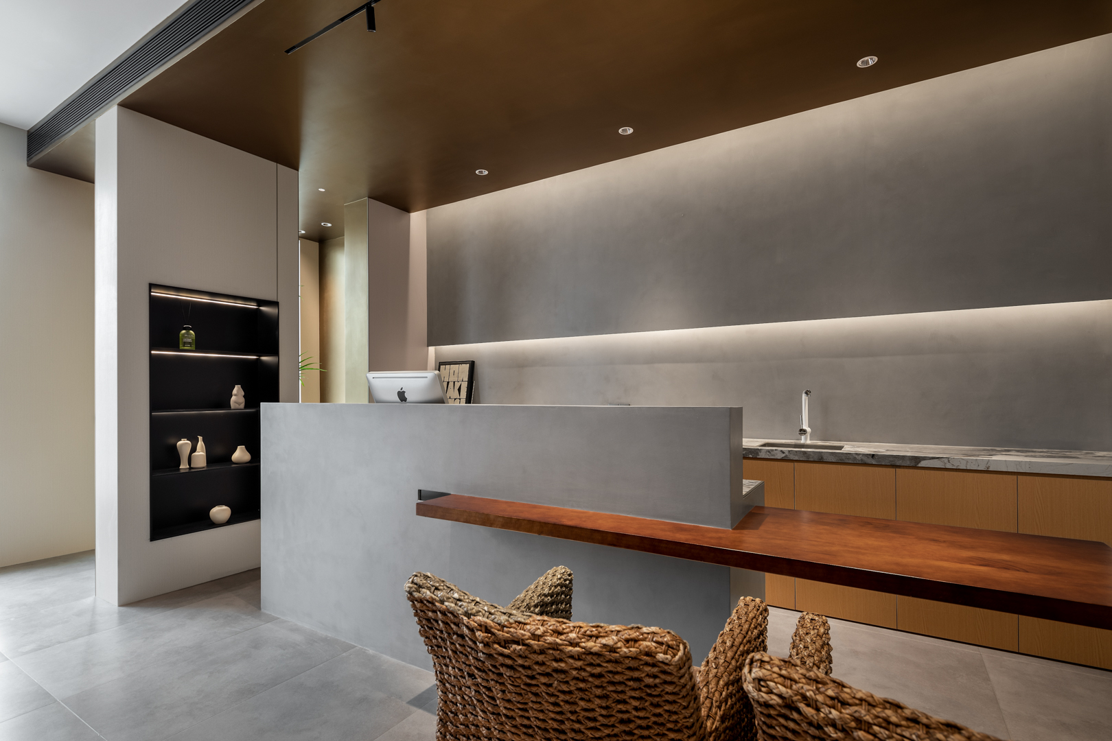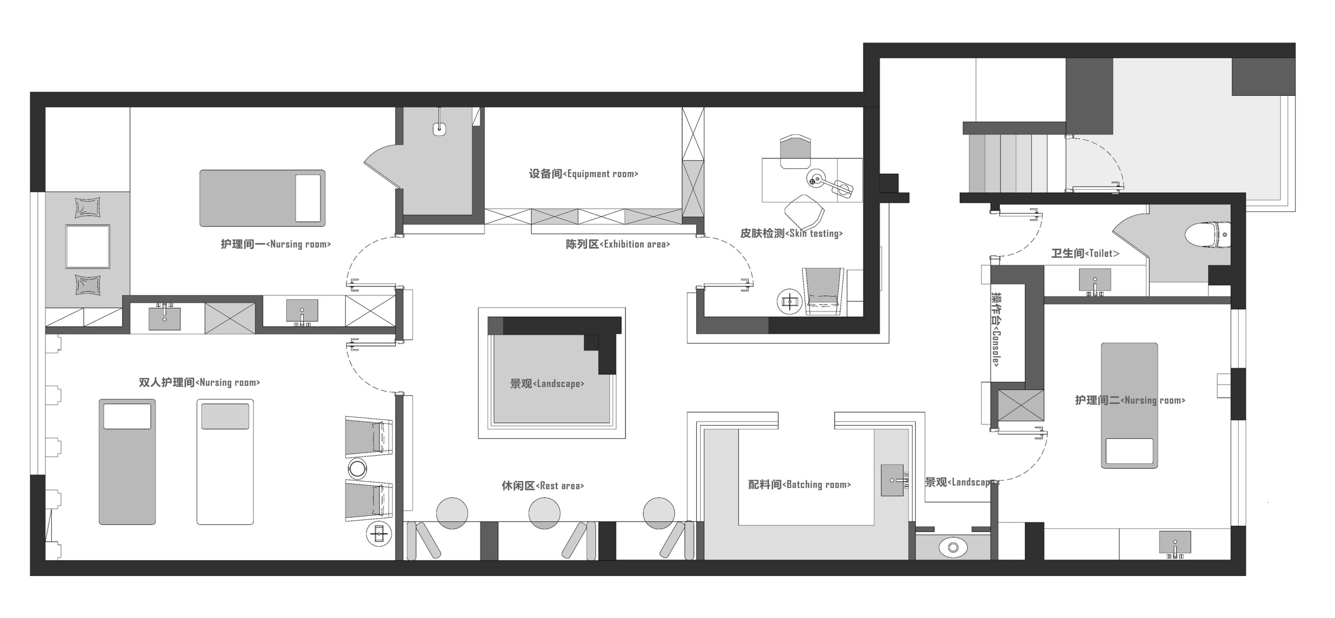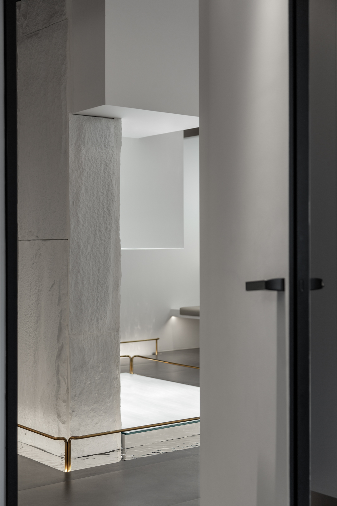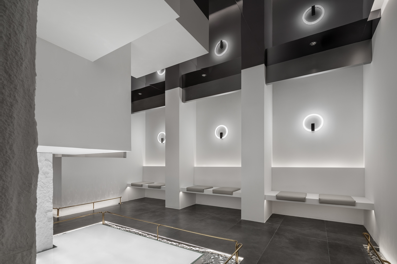 整体项目内部分为上下两层,设计师运用建筑群落的设计手法来营造内部空间体验,通过线的曲折、蜿蜒、生长与力量,打造出一个迂回变幻、趣味盎然的空间,渲染出美容店面的意绪。而这种有畅通、有阻隔、富于变化又出人意料的空间体验,如“柳暗花明又一村”,正是中国古人亲近自然山林的建筑美。