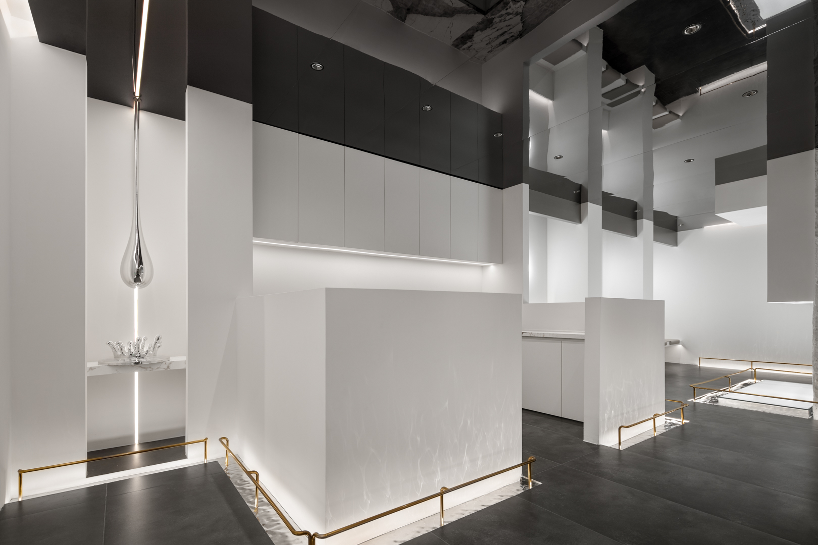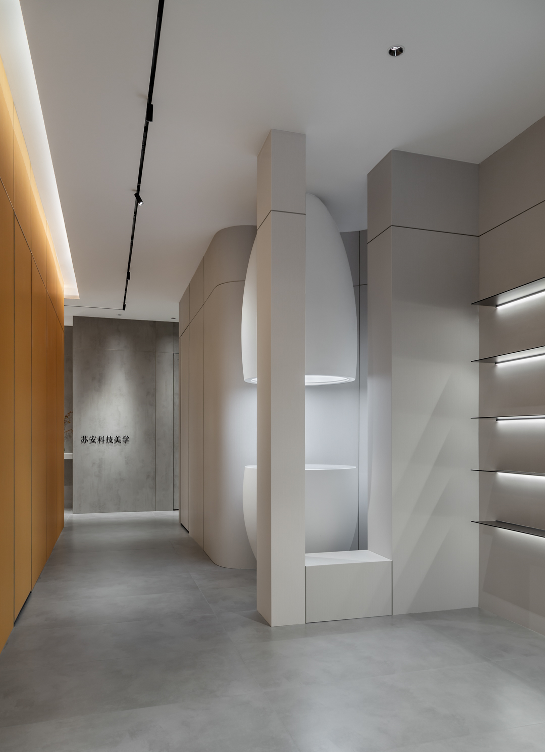 空间布局:设计师运用建筑群落的设计手法来营造内部空间体验,通过线的曲折、蜿蜒、生长与力量,打造出一个迂回变幻、趣味盎然的空间,渲染出美容店面的意绪。而这种有畅通、有阻隔、富于变化又出人意料的空间体验,如“柳暗花明又一村”,正是中国古人亲近自然山林的建筑美。