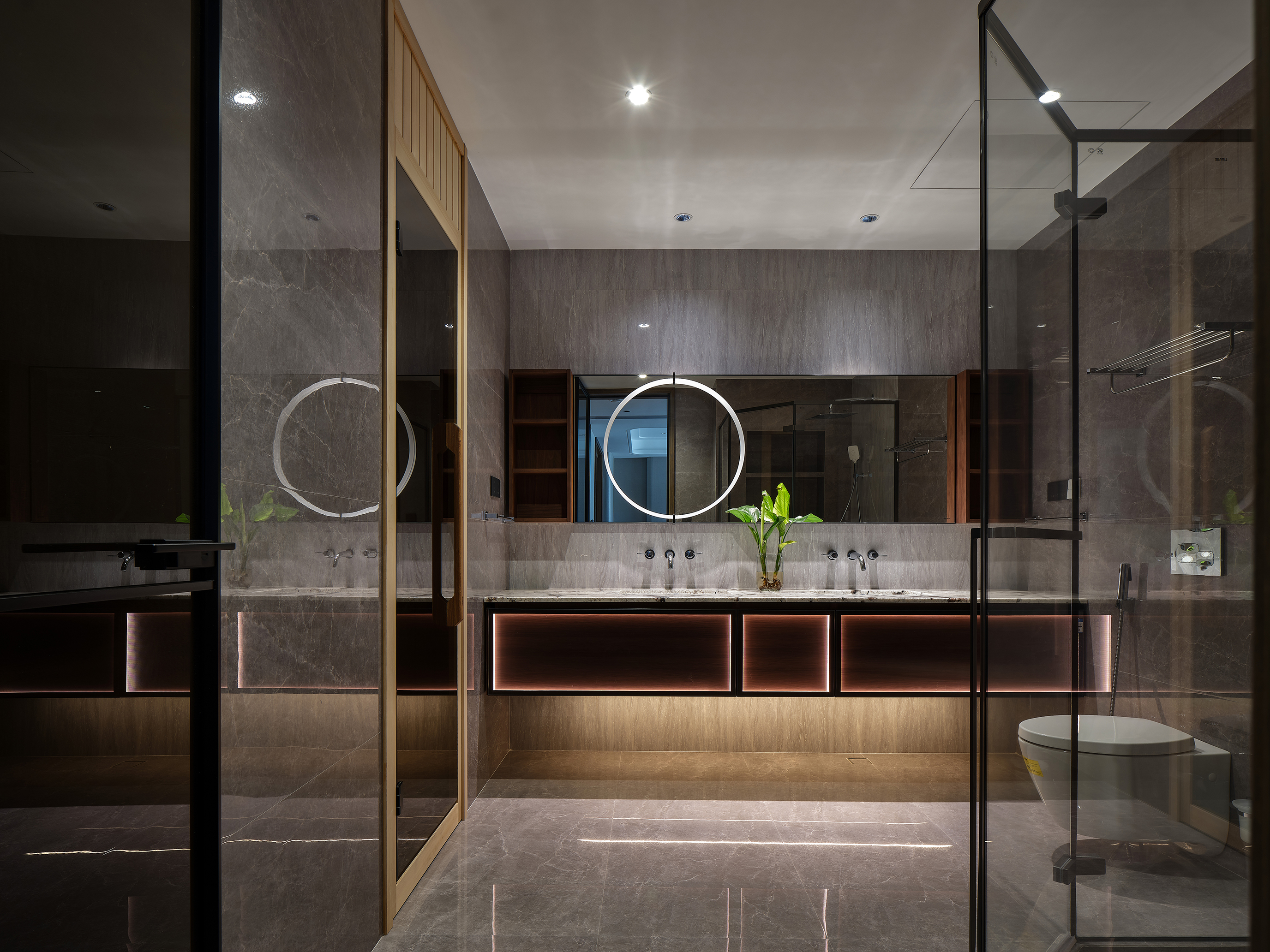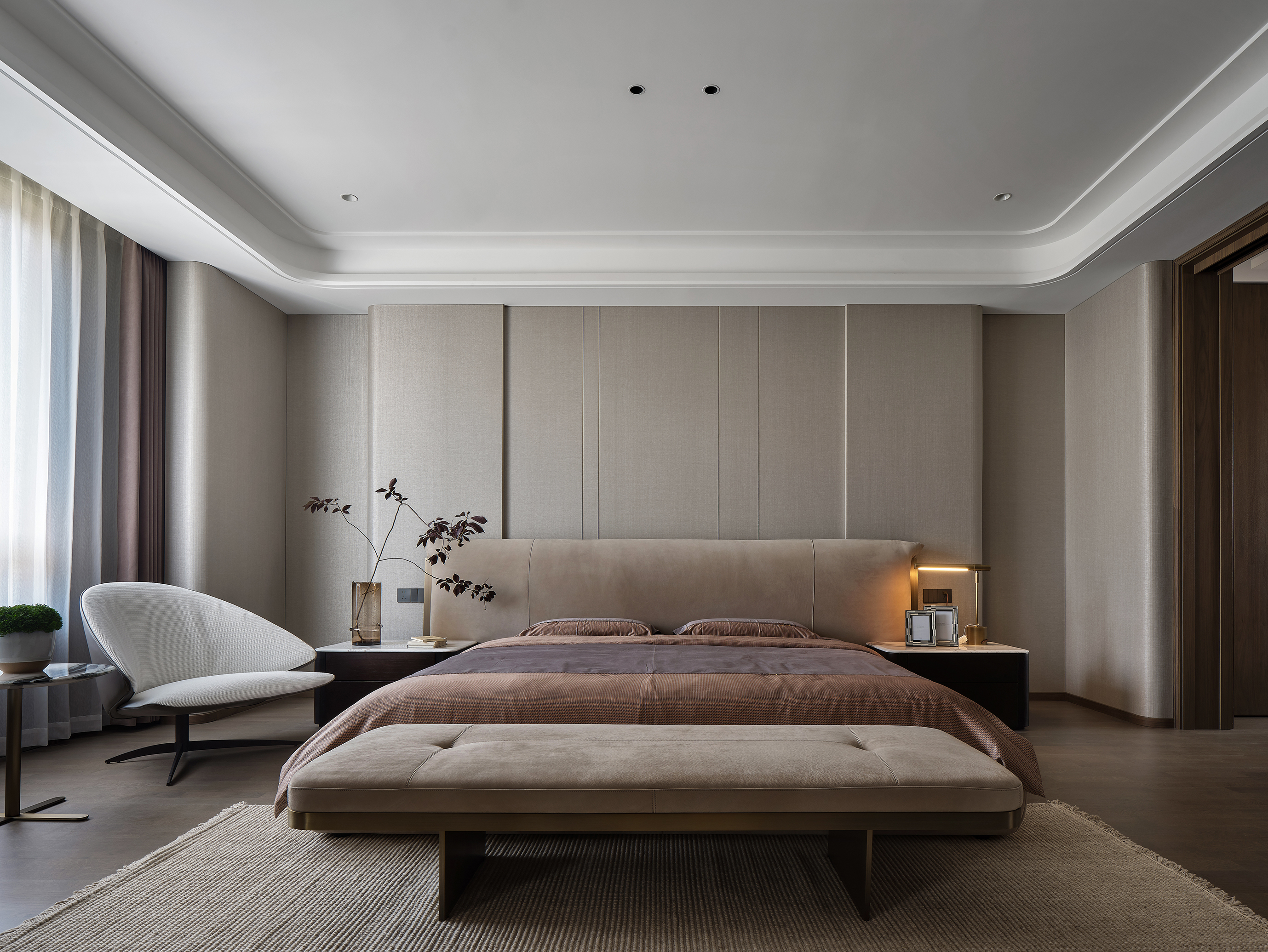 设计选材:自然的木纹理和细腻的皮包墙面,安静中注入自然的元素,少量的金属及玻璃加入其中,哑面的包容感,亮面的反射,给生活一点精致和灵动,使身在其中的人可以更放松不拘谨。卧室空间更以弱对比度的色彩搭配,体现柔和感受,通过材质面料纹理的细腻变化,丰富视觉,统一中有变化,低调奢华。