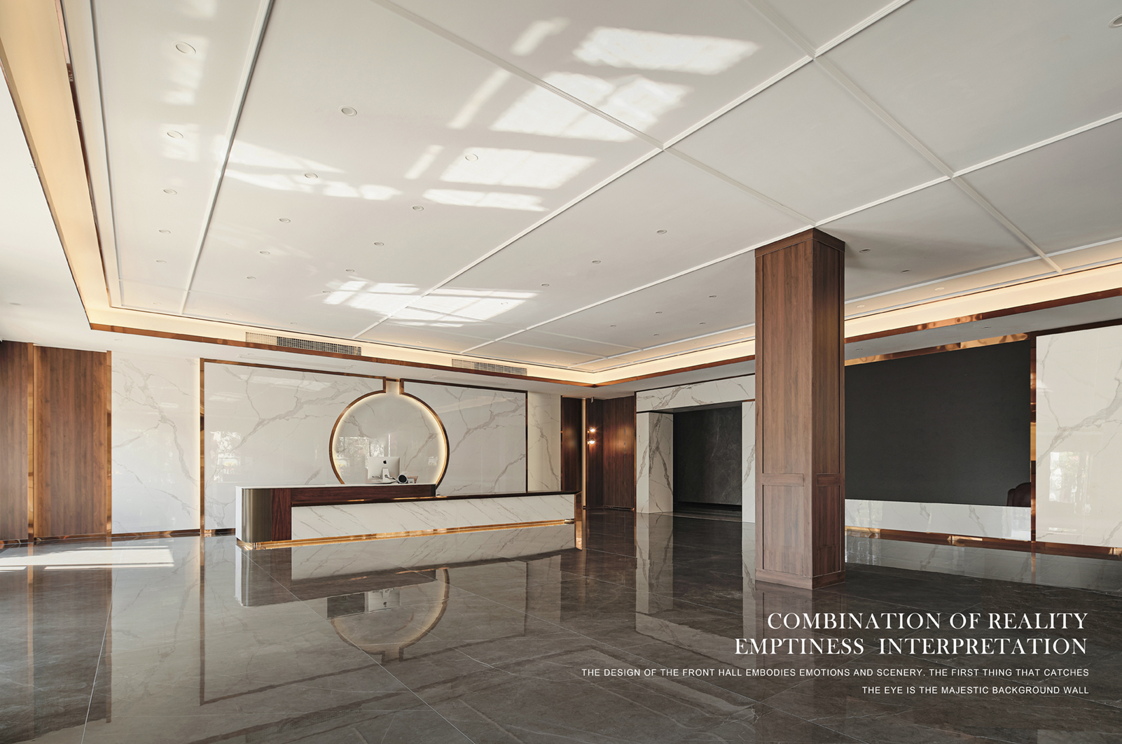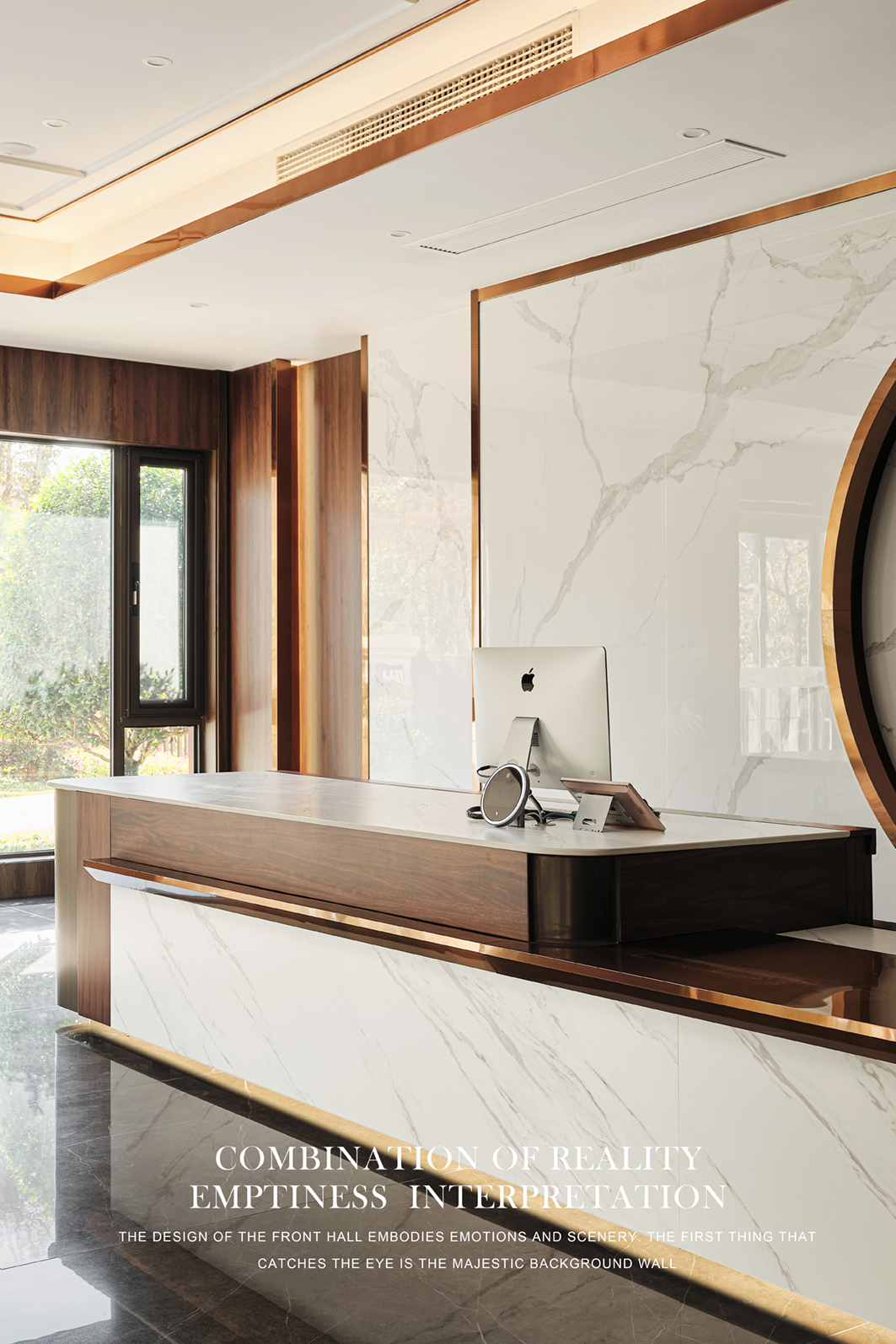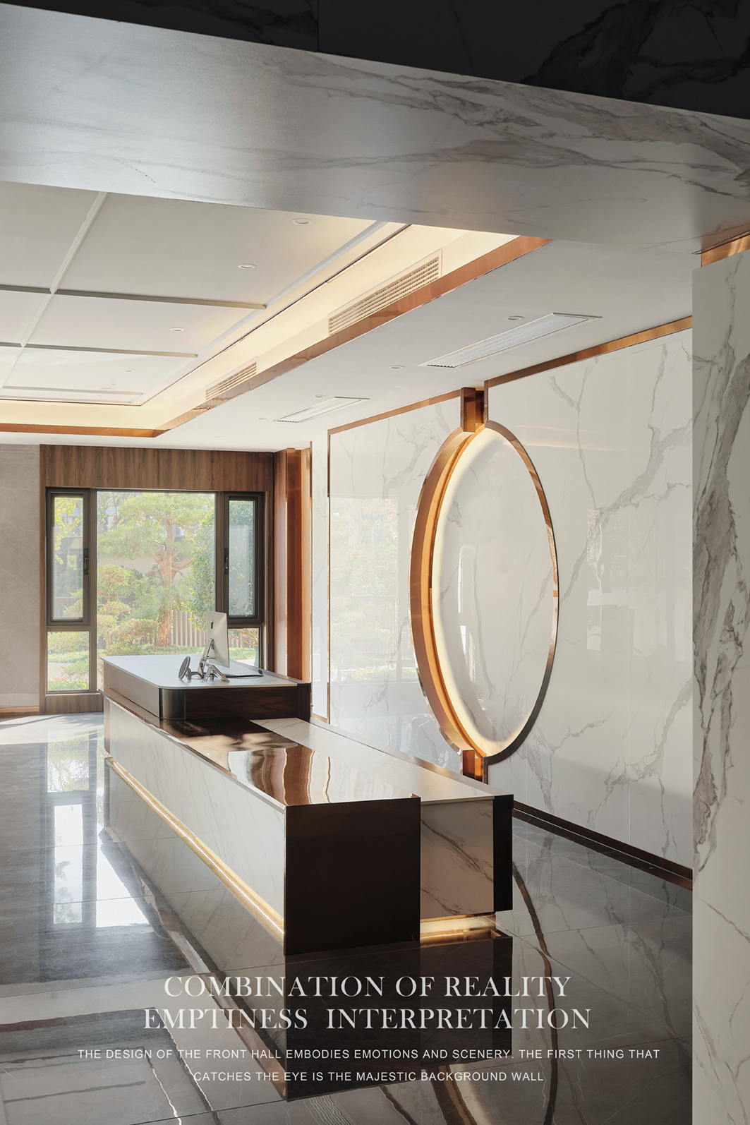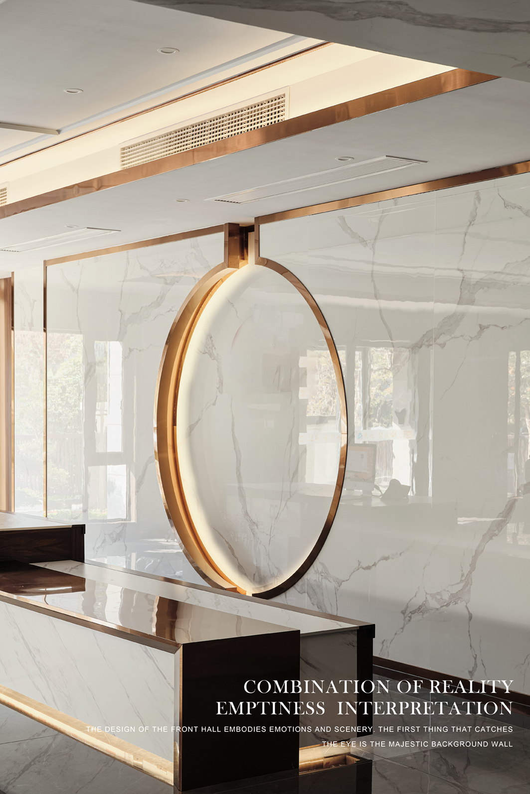 前厅的设计寓情与景,首先映入眼帘的是气势磅礴的背景墙月洞造型,勾勒出典雅的人文意境,前台为白色的石材与金属和木纹搭配,在增添质感与格调同时,传达出时尚的艺术品味。