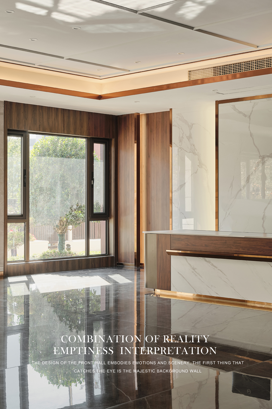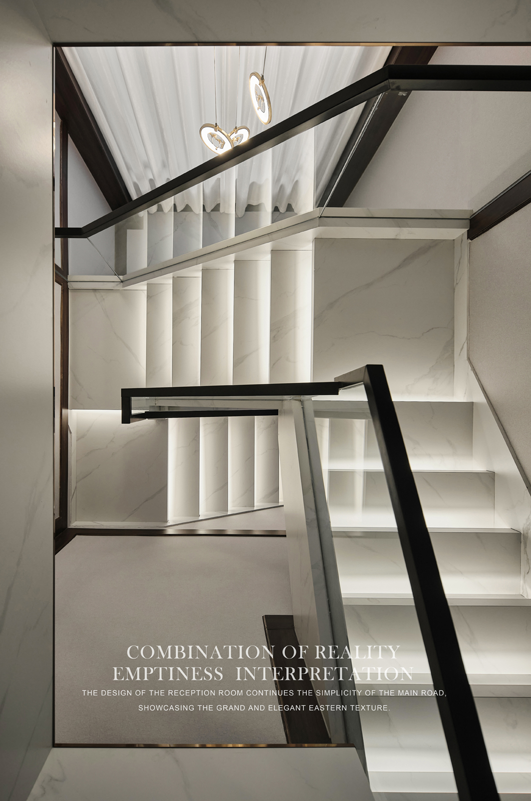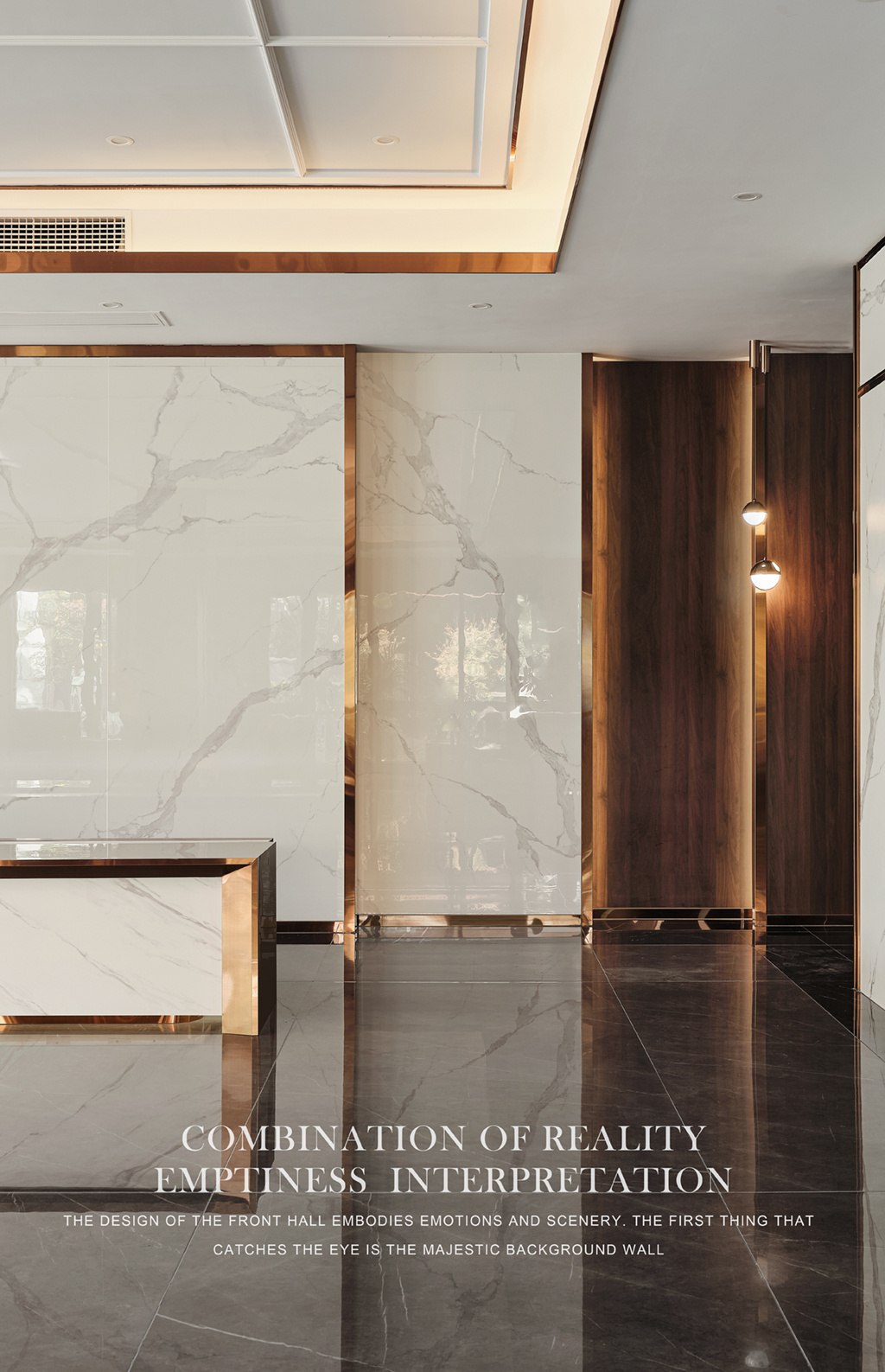 前厅的设计寓情与景,首先映入眼帘的是气势磅礴的背景墙月洞造型,勾勒出典雅的人文意境,前台为白色的石材与金属和木纹搭配,在增添质感与格调同时,传达出时尚的艺术品味。