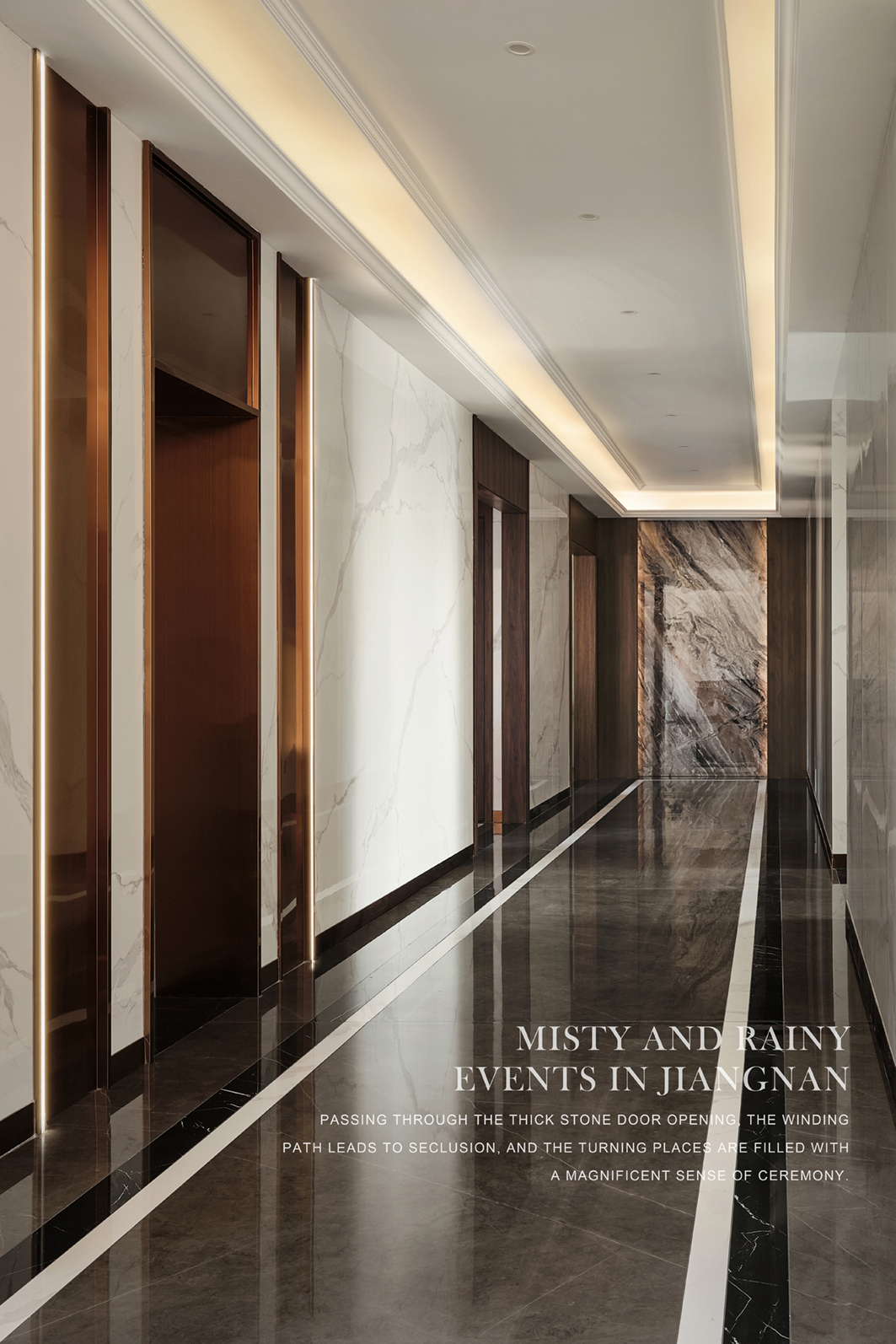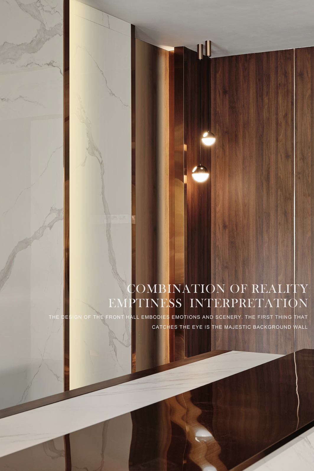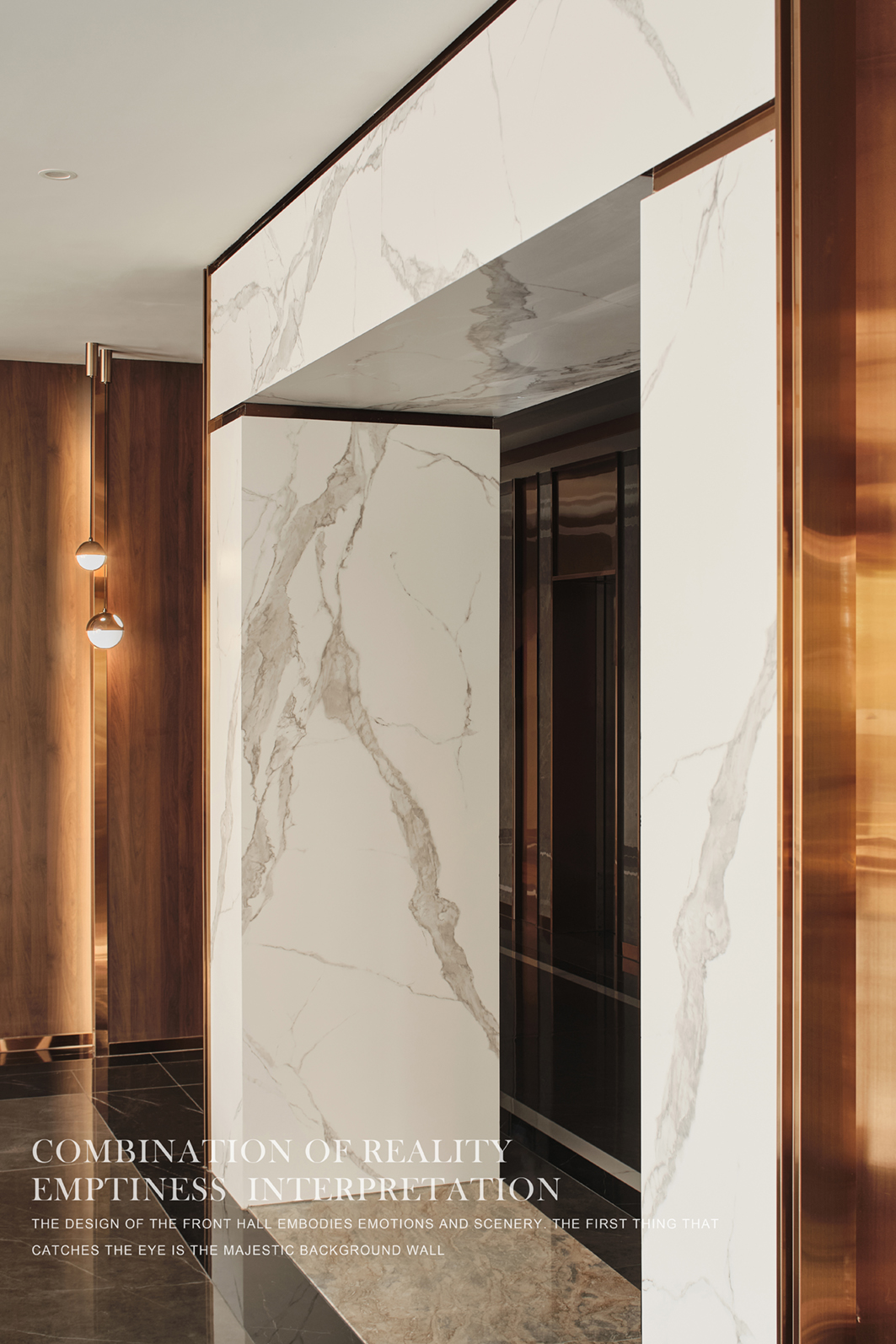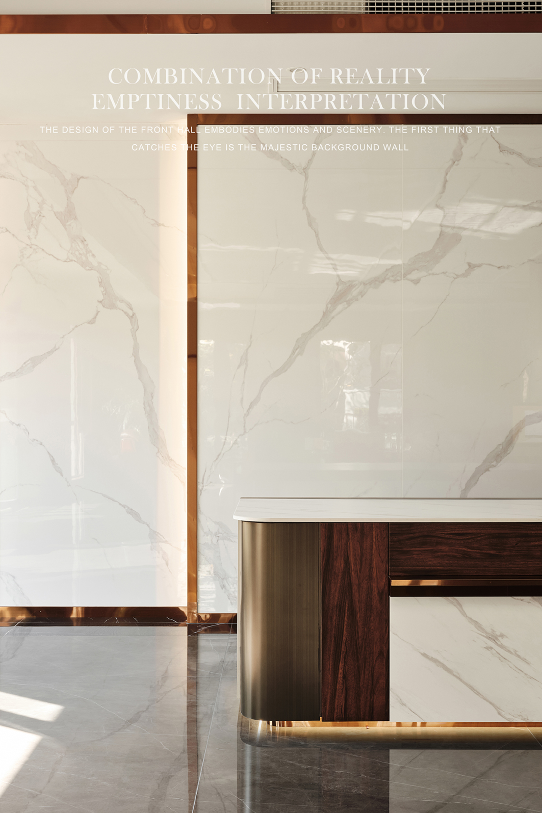 前厅的设计寓情与景,首先映入眼帘的是气势磅礴的背景墙月洞造型,勾勒出典雅的人文意境,前台为白色的石材与金属和木纹搭配,在增添质感与格调同时,传达出时尚的艺术品味。