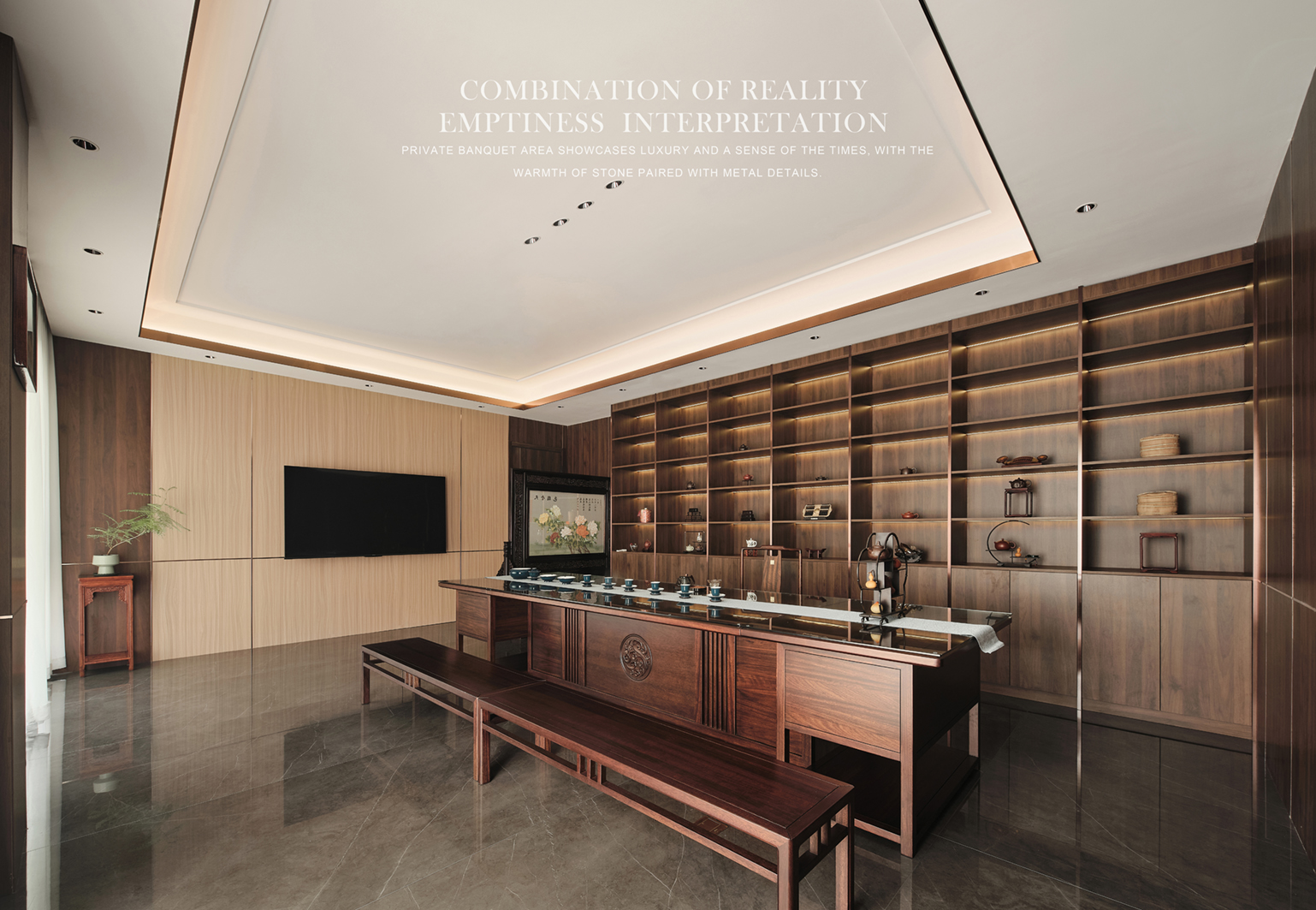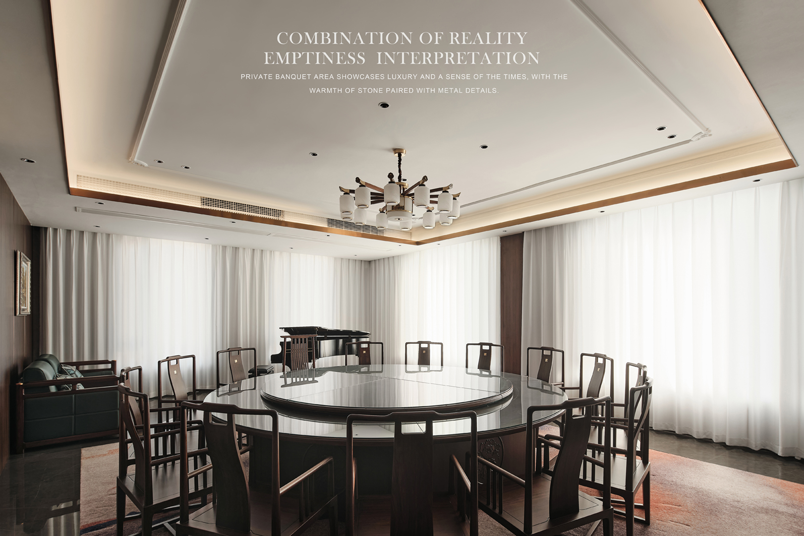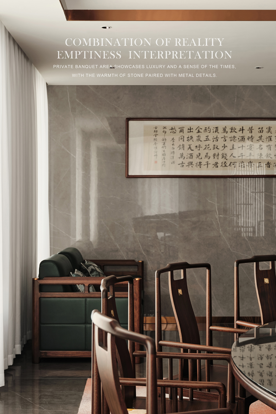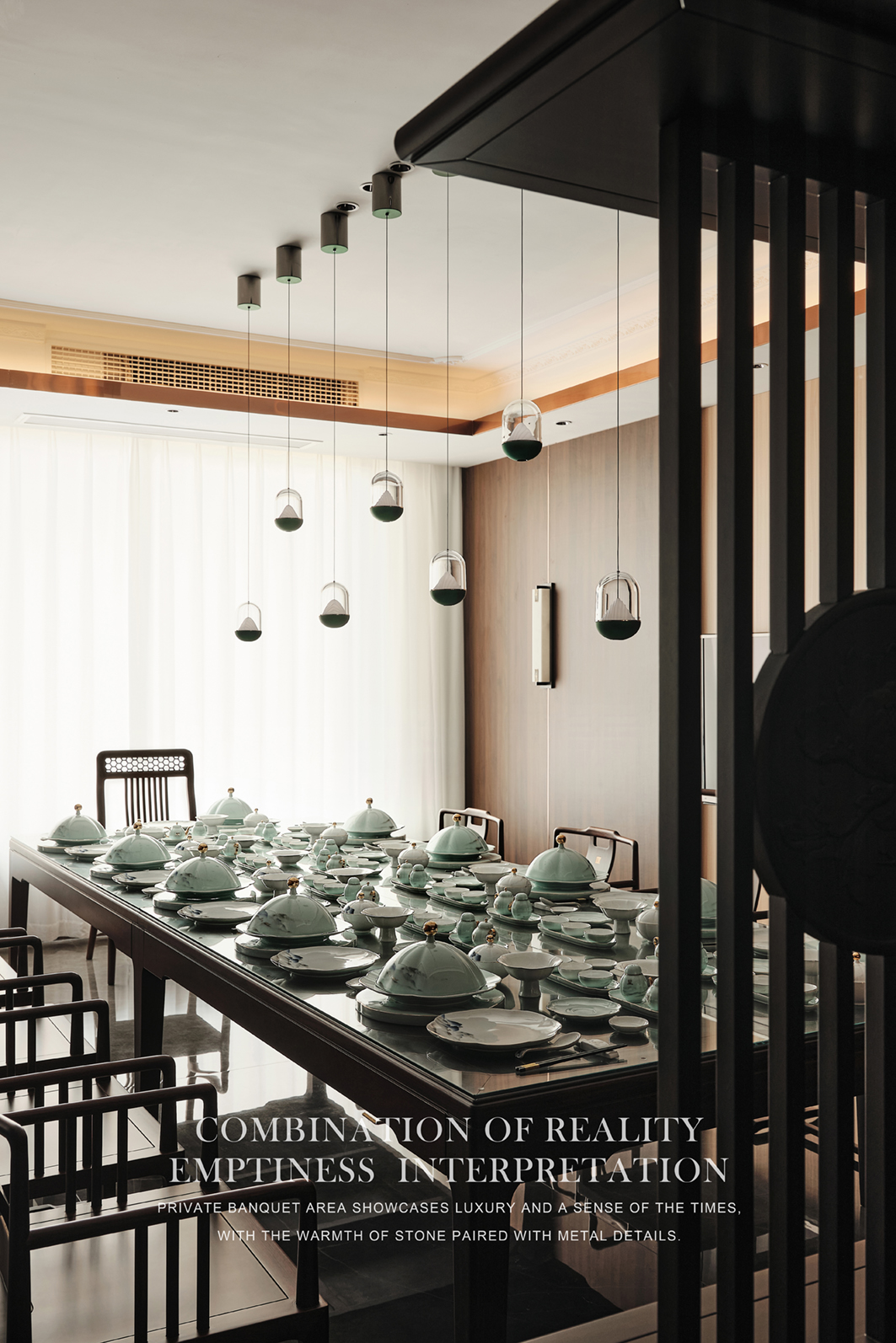私宴区彰显豪华与时代感,石材的温润与金属的细节搭配,镂空的屏风将山峦的形与意镌刻于此,体验尊贵之感受。