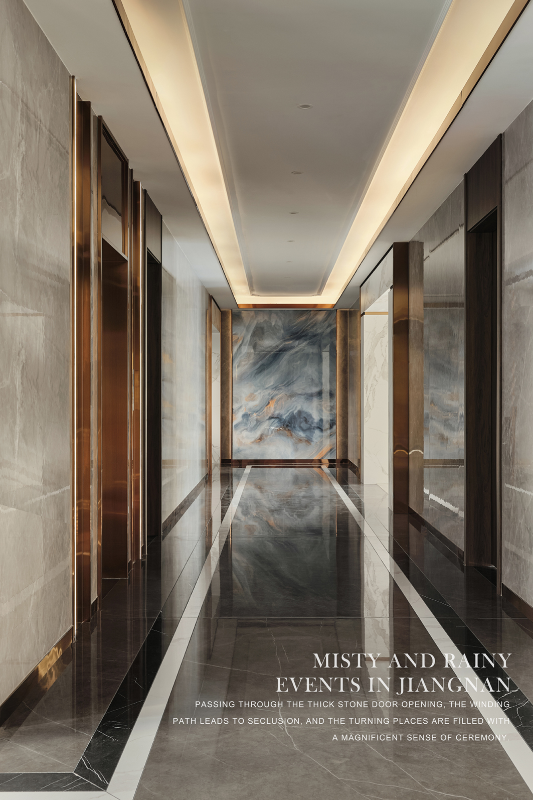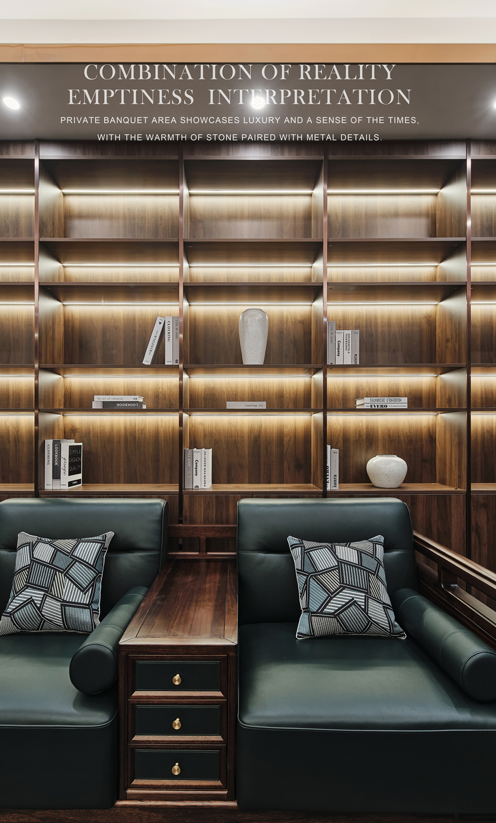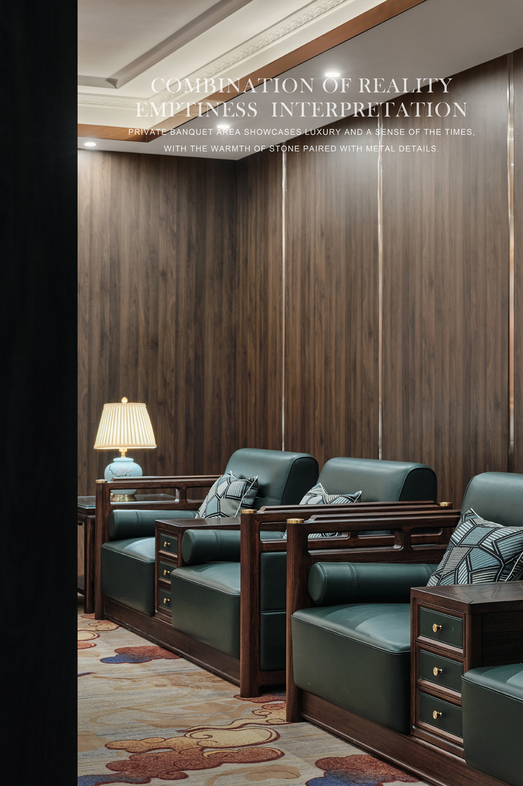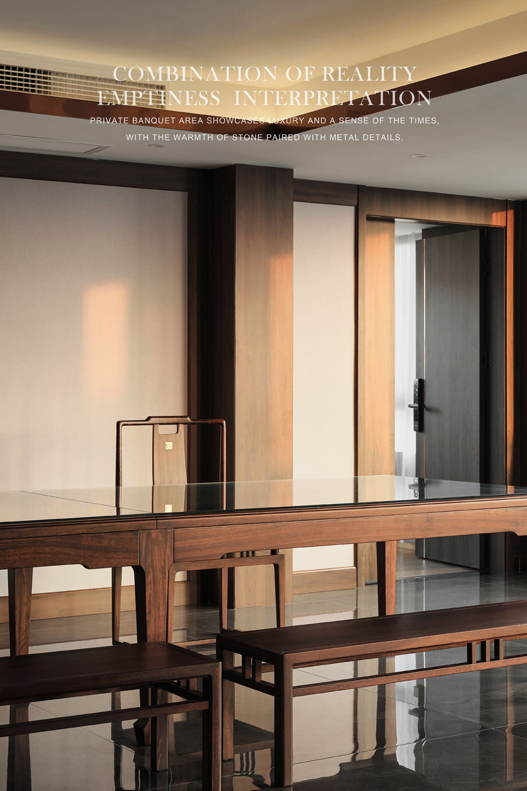 私宴区彰显豪华与时代感,石材的温润与金属的细节搭配,镂空的屏风将山峦的形与意镌刻于此,体验尊贵之感受。