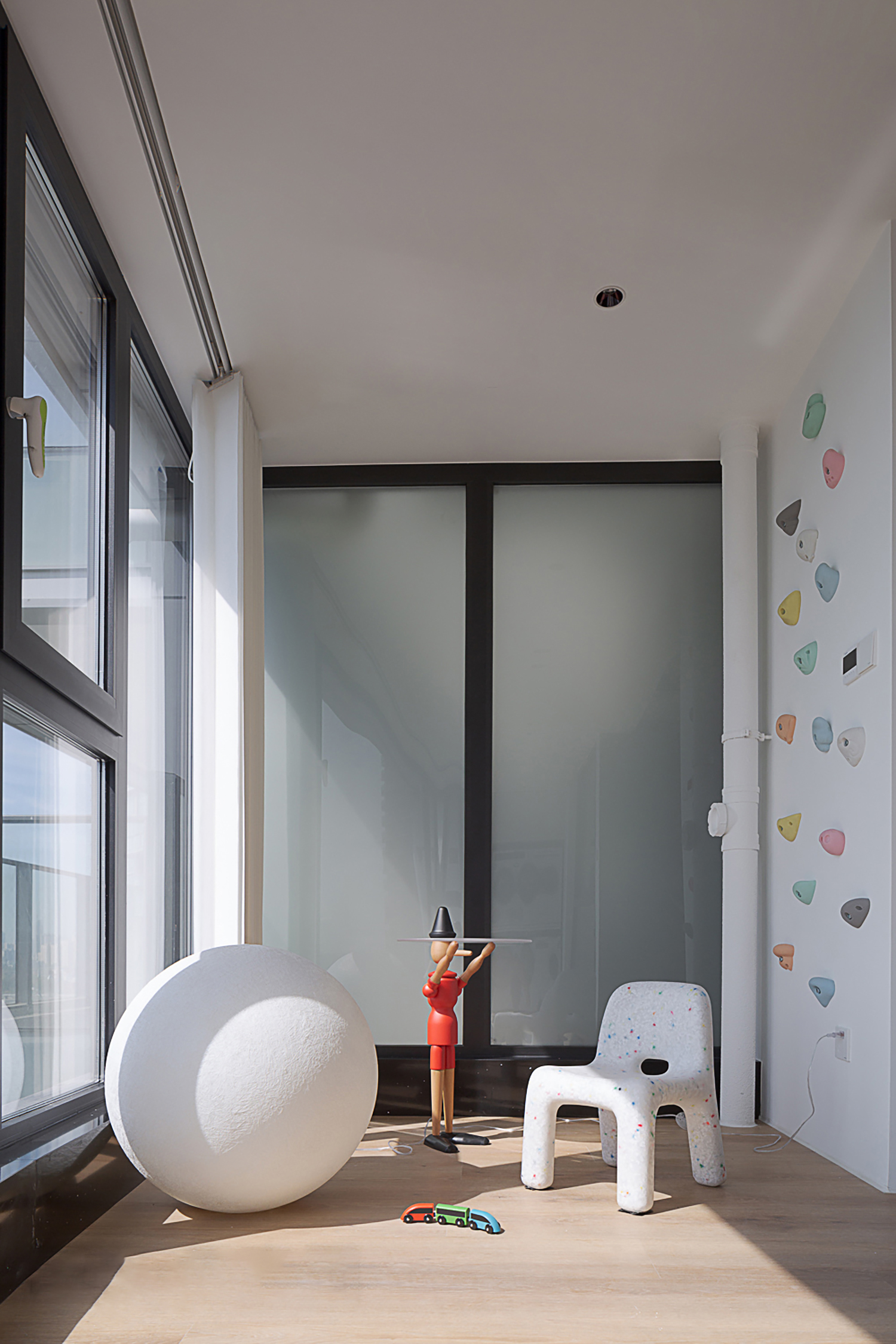 空间布局:这个案子的主角:MR吴与MRS吴.非常偏爱黑白灰的简约风格.希望家是悠闲安逸的.还有两位宝贝即将在这个房子度过整个童年.所以希望它能不那么“冷”而能带一些“趣”.所以.简约与童趣.成为本案的主题.