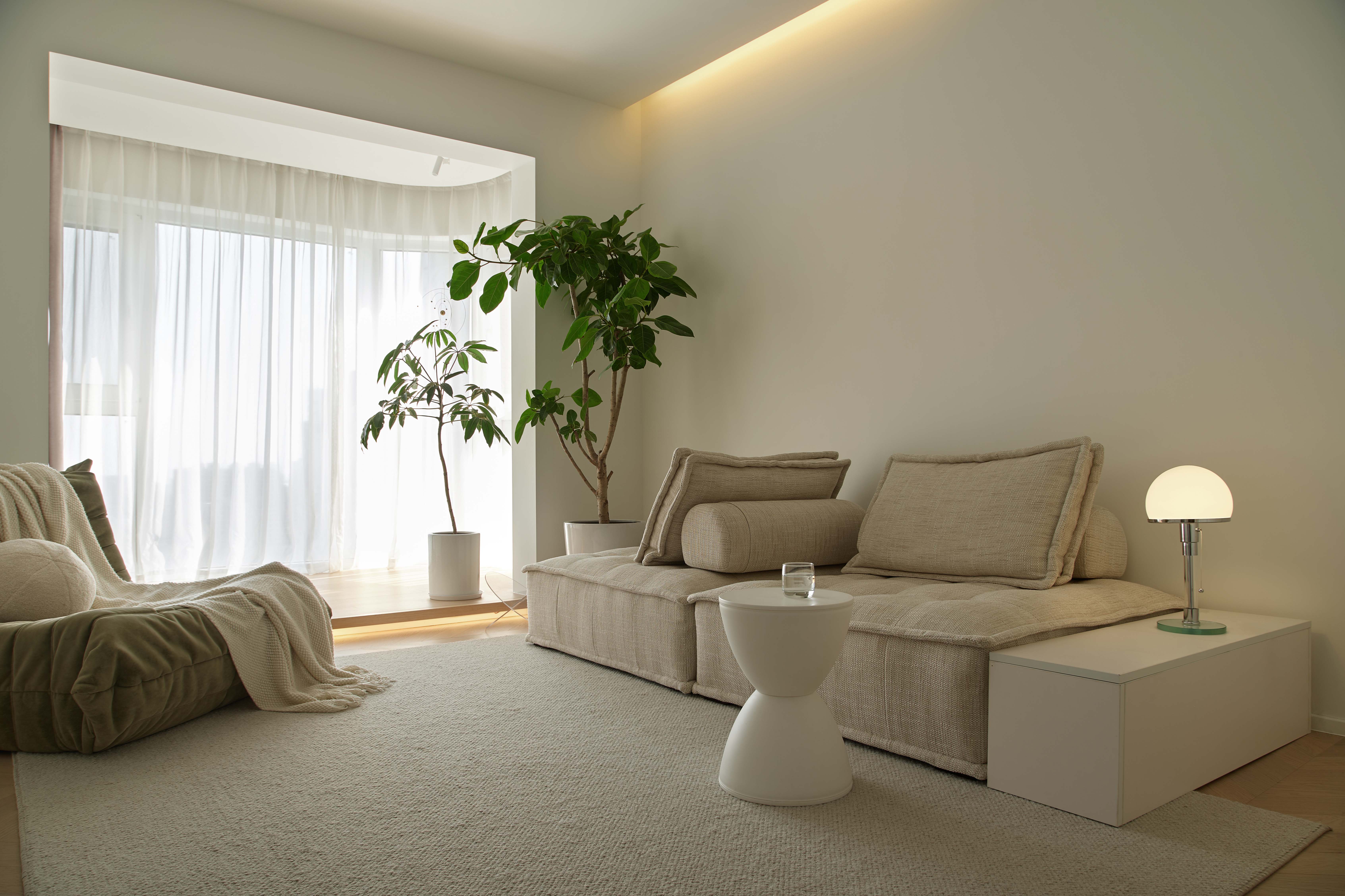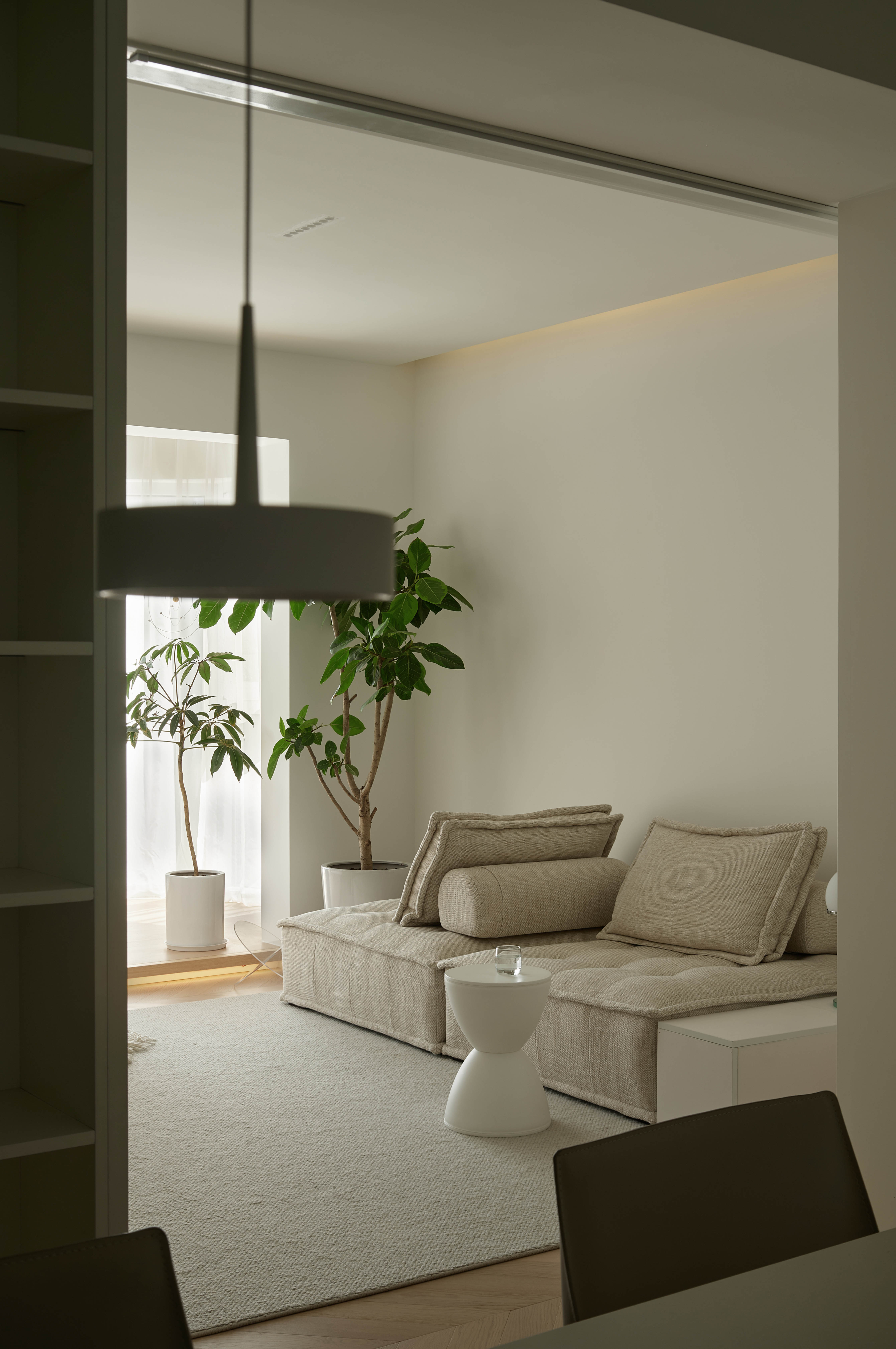 客厅并没有放茶几,让空间宽敞些,平时小边几也能满足需要,沙发是模块的豆腐沙发,多样性使用