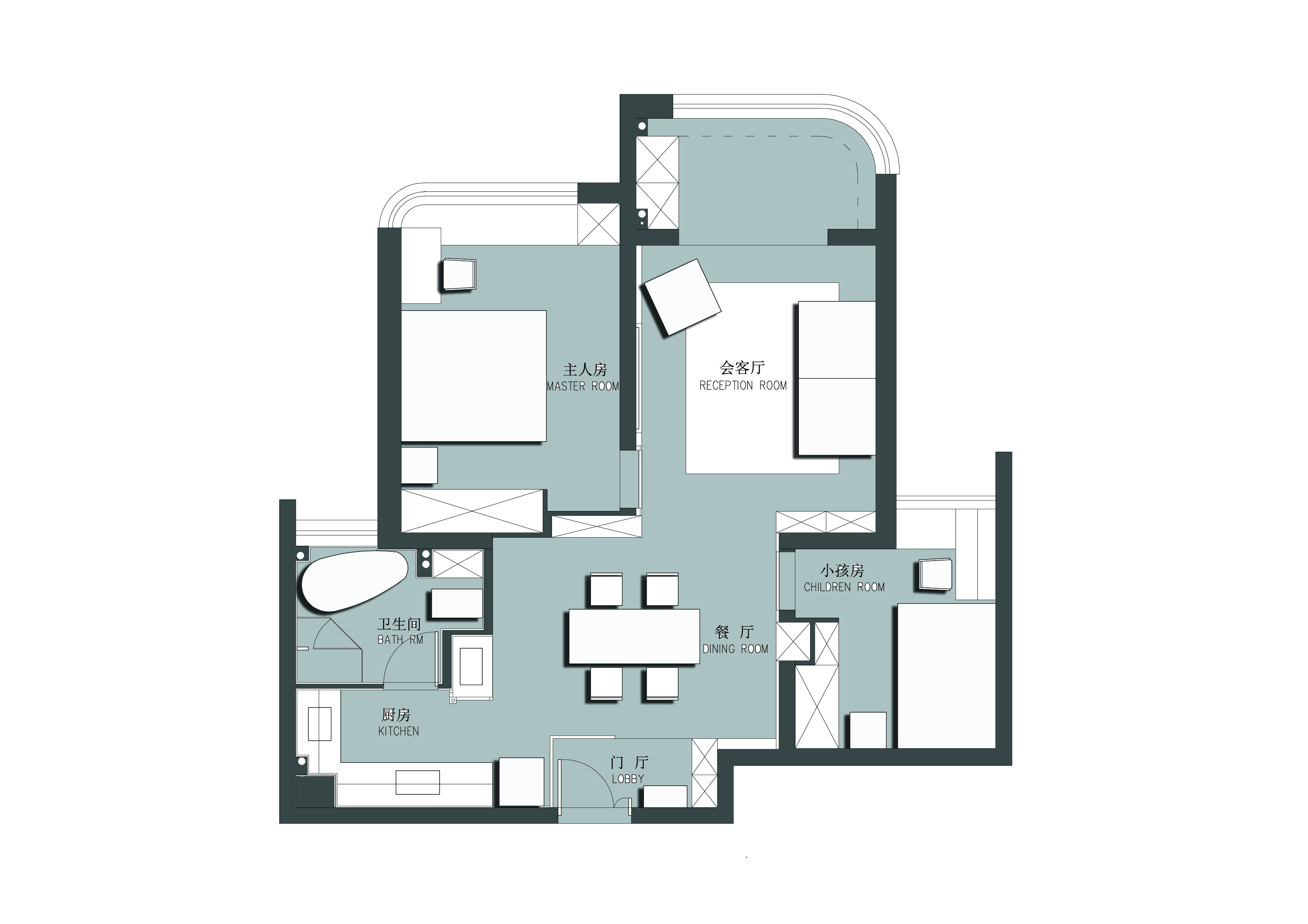 用户体验:动线上餐厅扩大后四周都可以走动,视觉上也变大了,阳台扩进到客厅,尽量把属于公共区域的面积都变大了