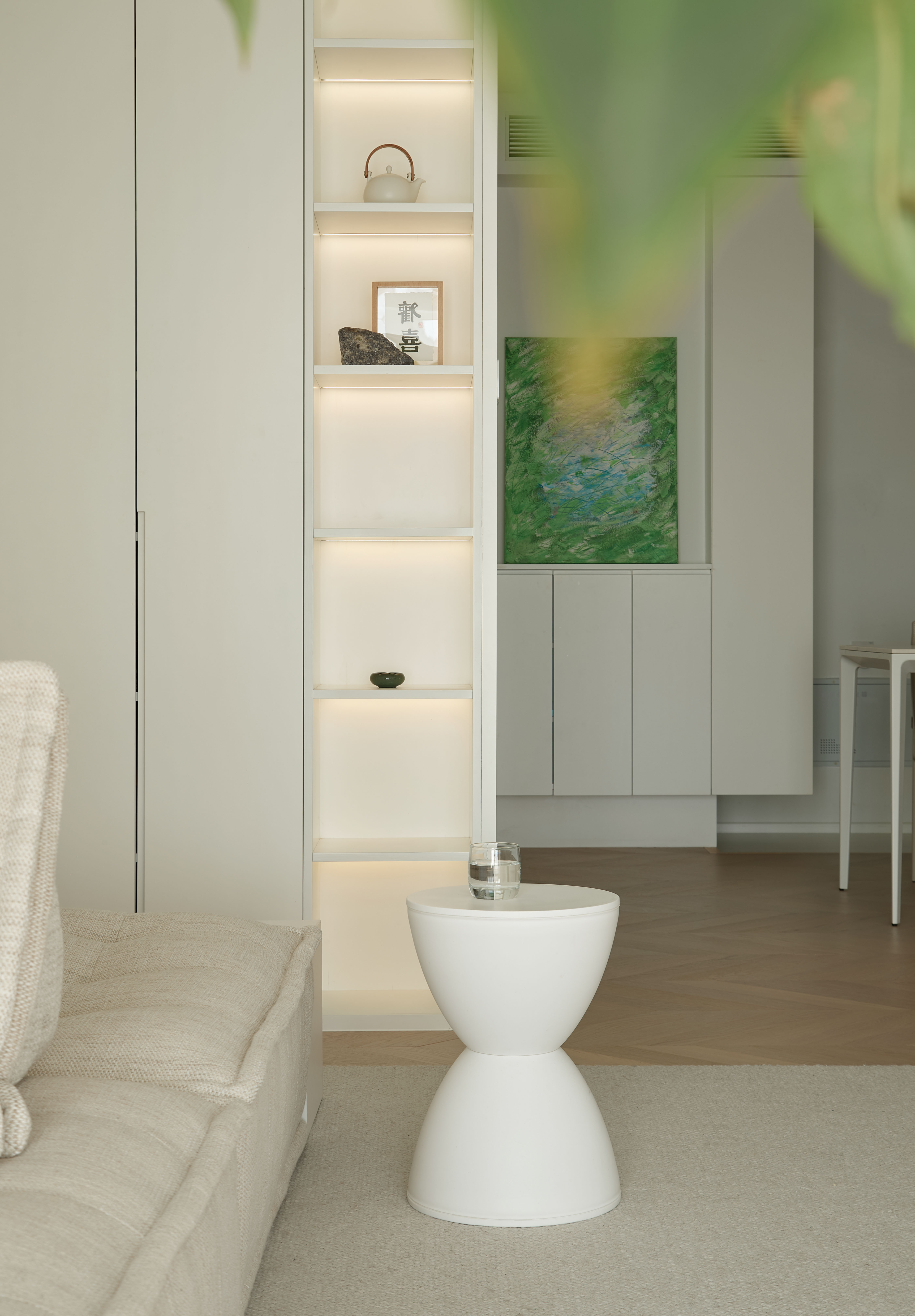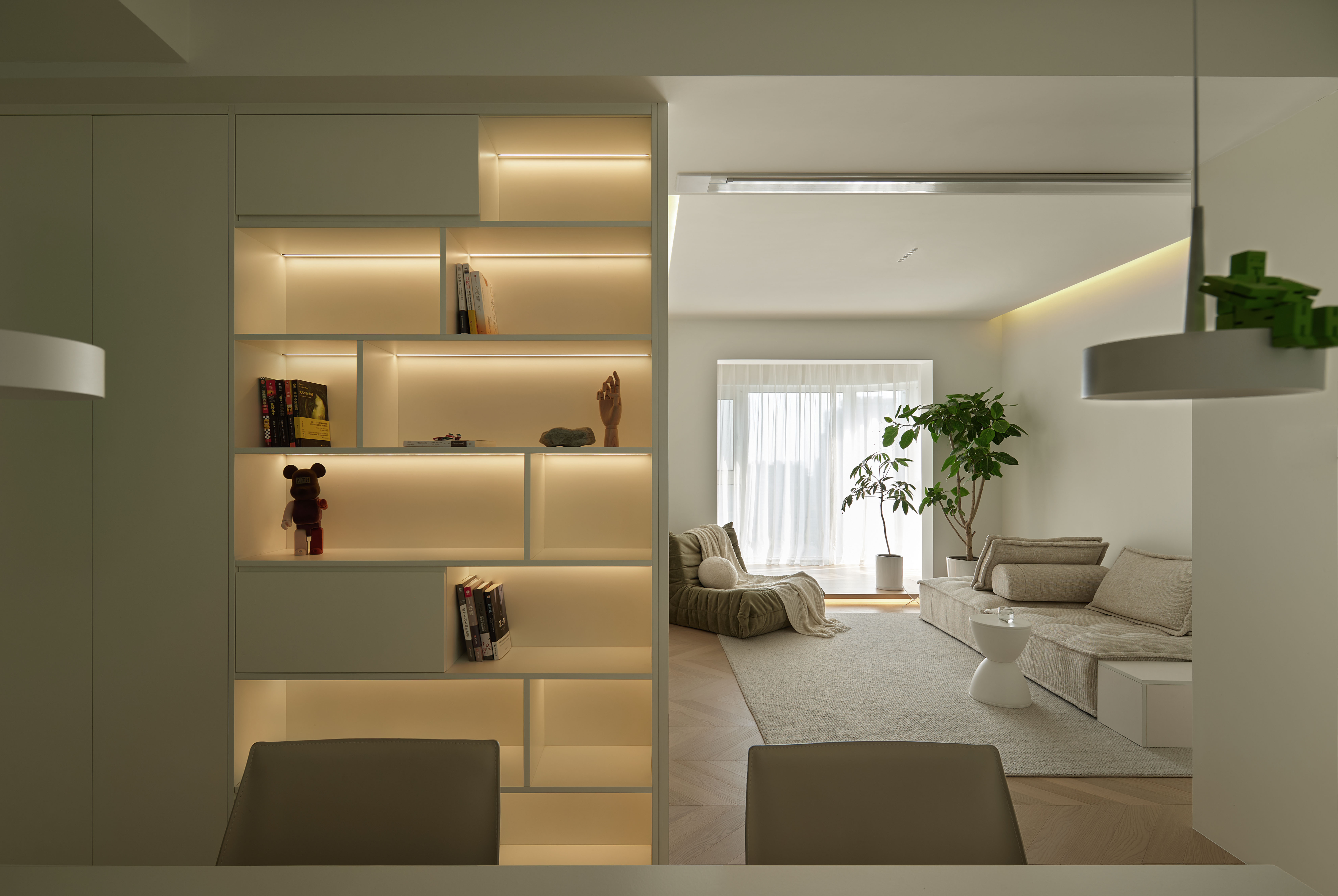 客厅旁做了储物柜,零食柜,旁边小部分敞开形式,摆件及随手拿取物件的需要