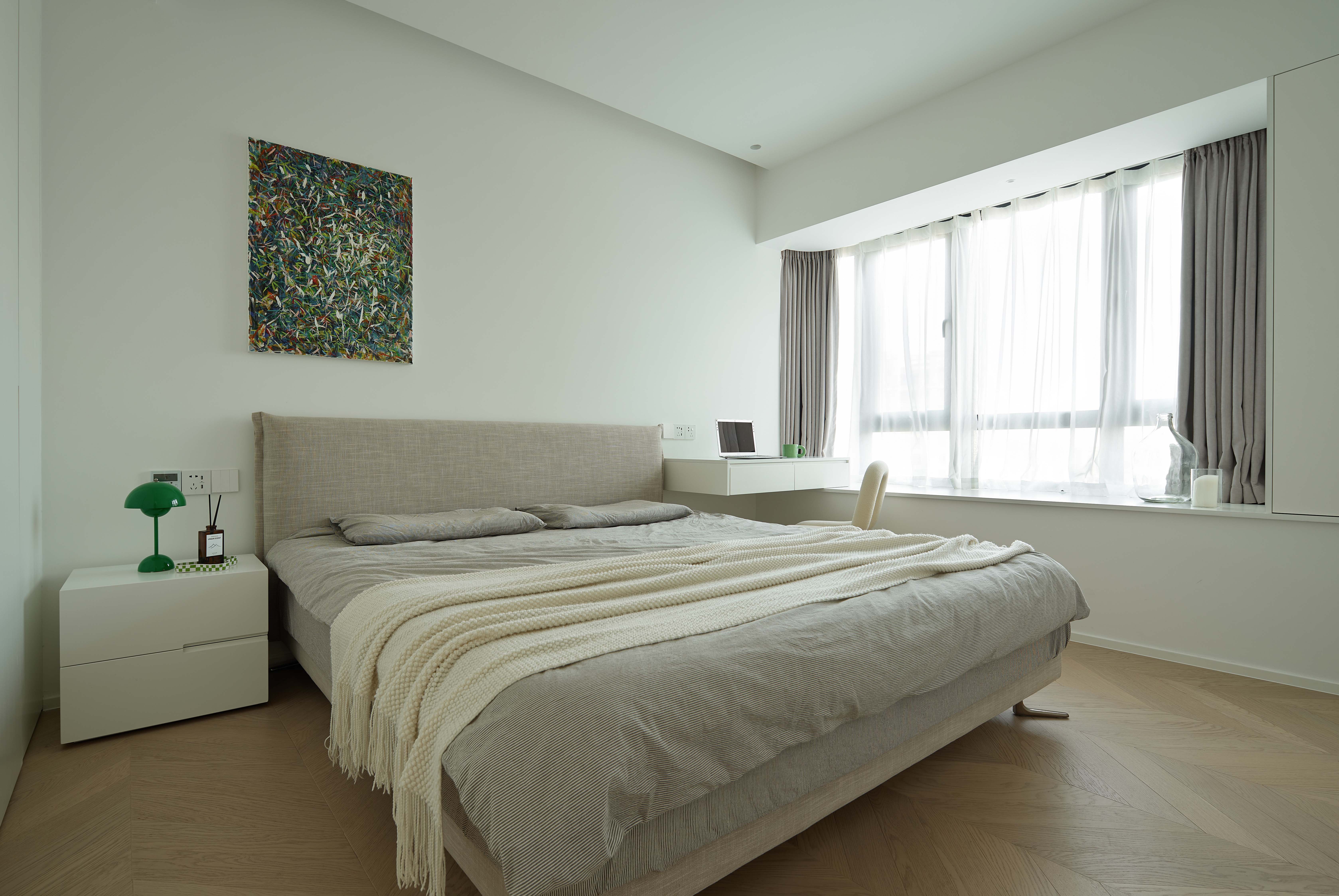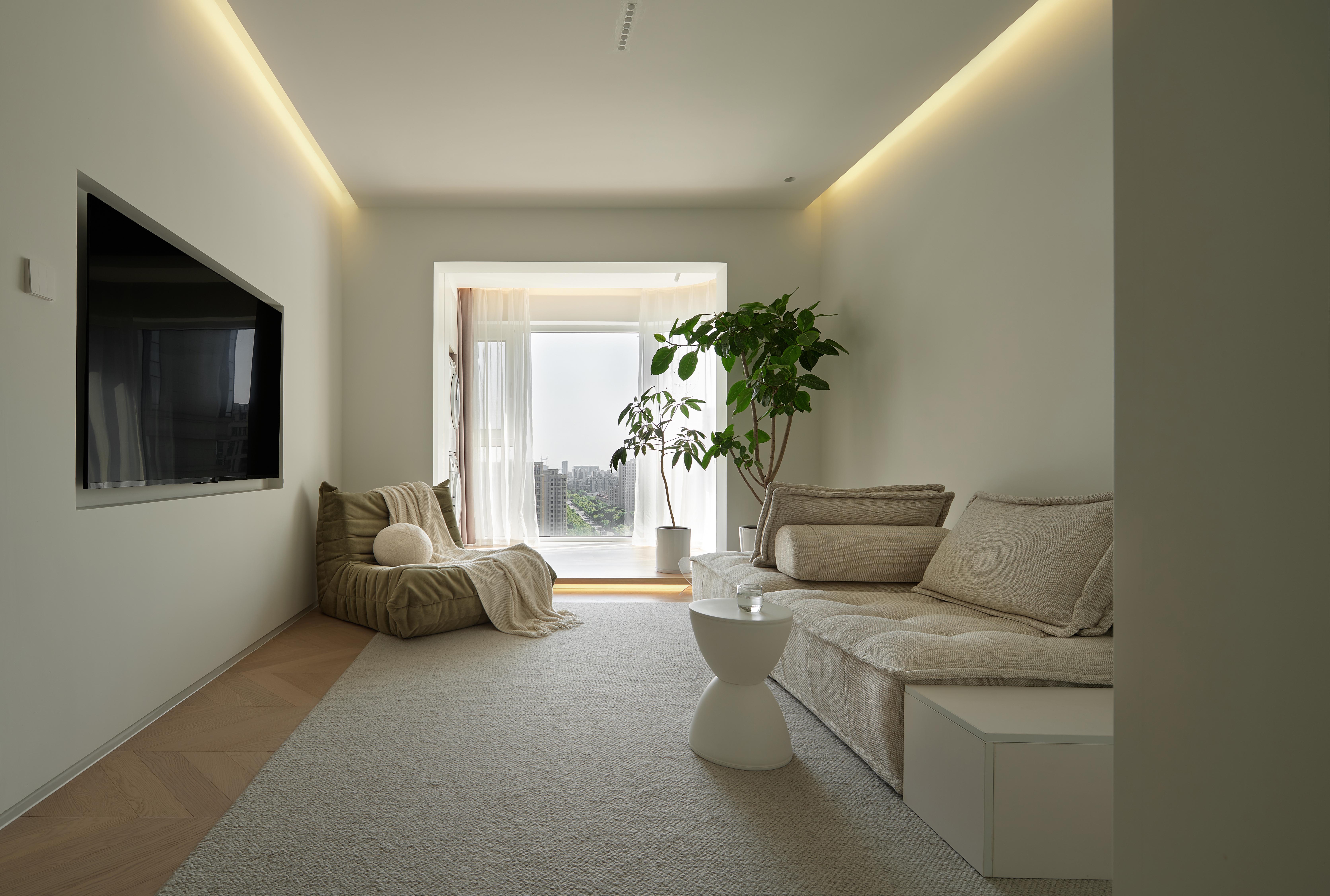 原阳台包进了客厅,做了整面玻璃的内白色系统窗,地台的地板是直拼,区别于公共区域的鱼骨拼,营造单独区域感,按公共区域定制的同色地板,电视墙整体突出后内嵌电视,电视墙下面用了内嵌型材踢脚线
