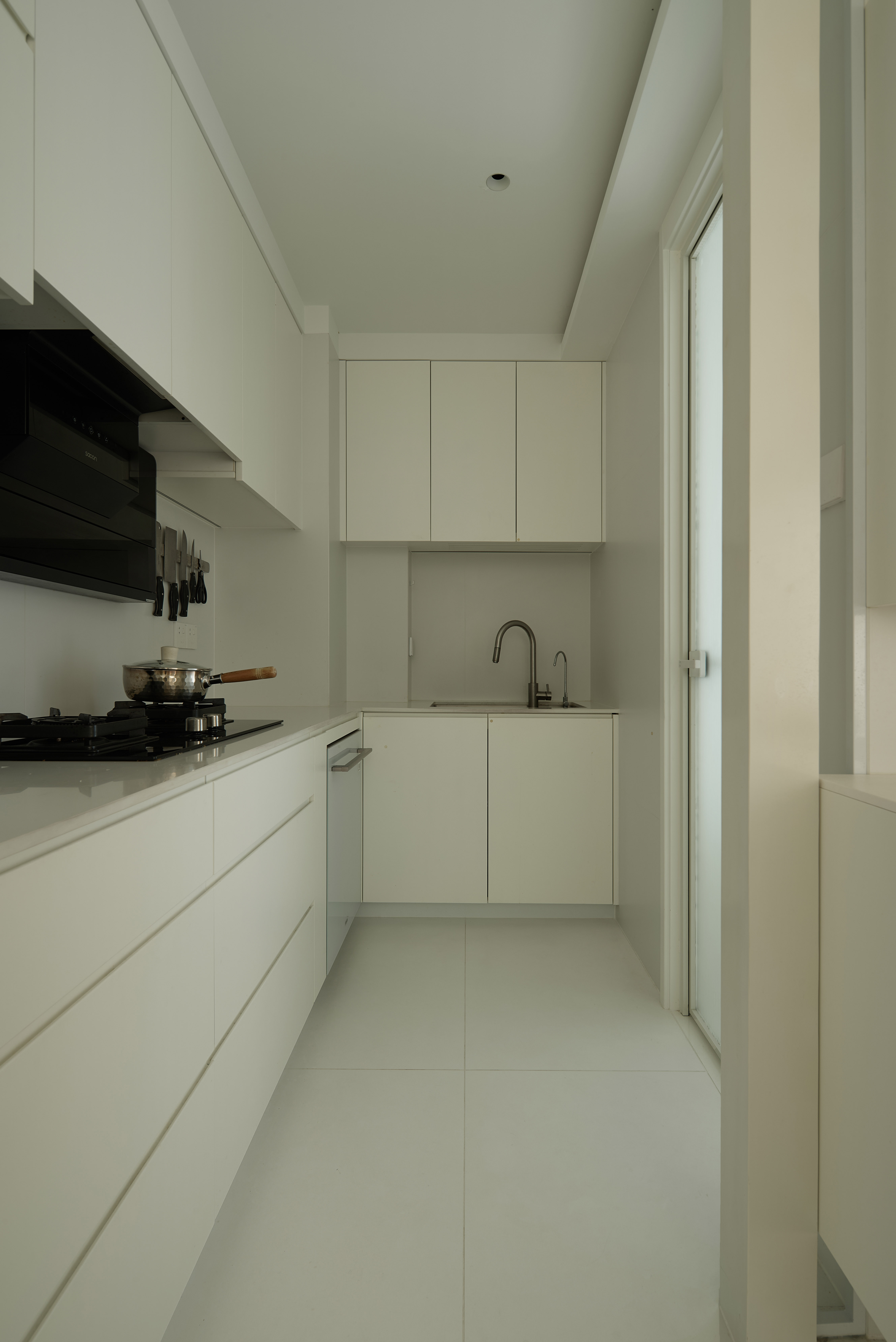 白色厨房,台面石英石找了很久才找到基本看不出颗粒的白
