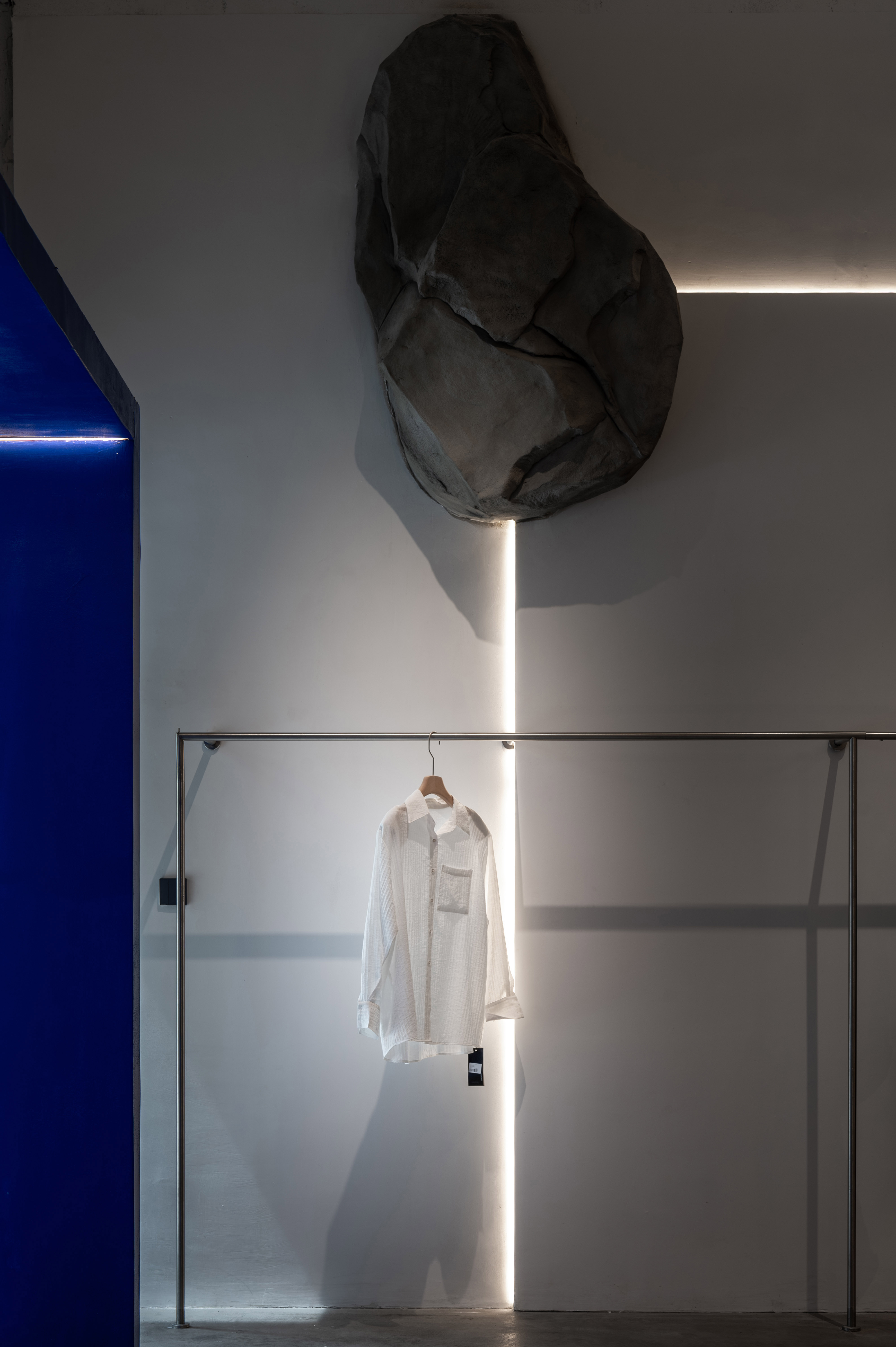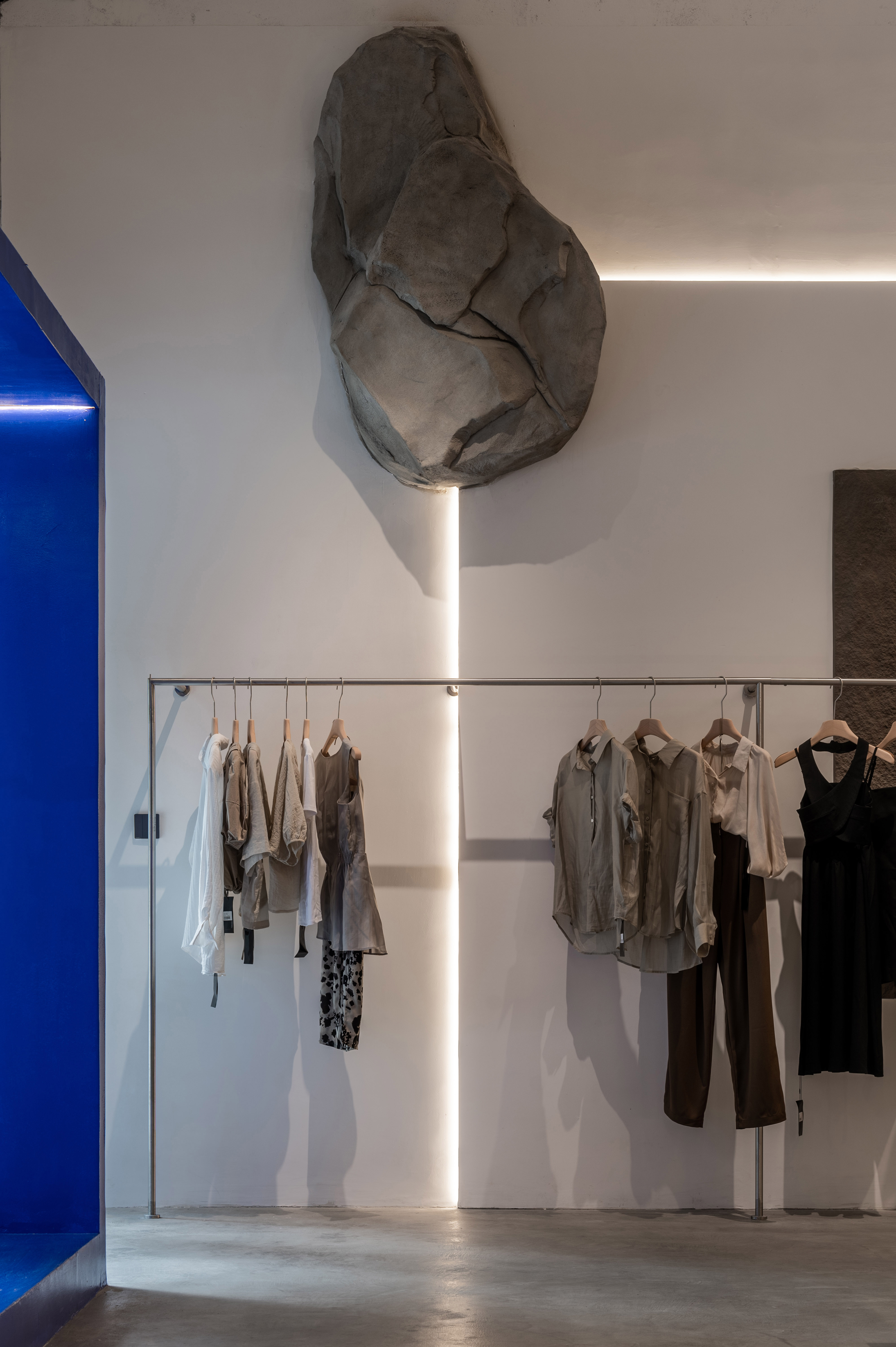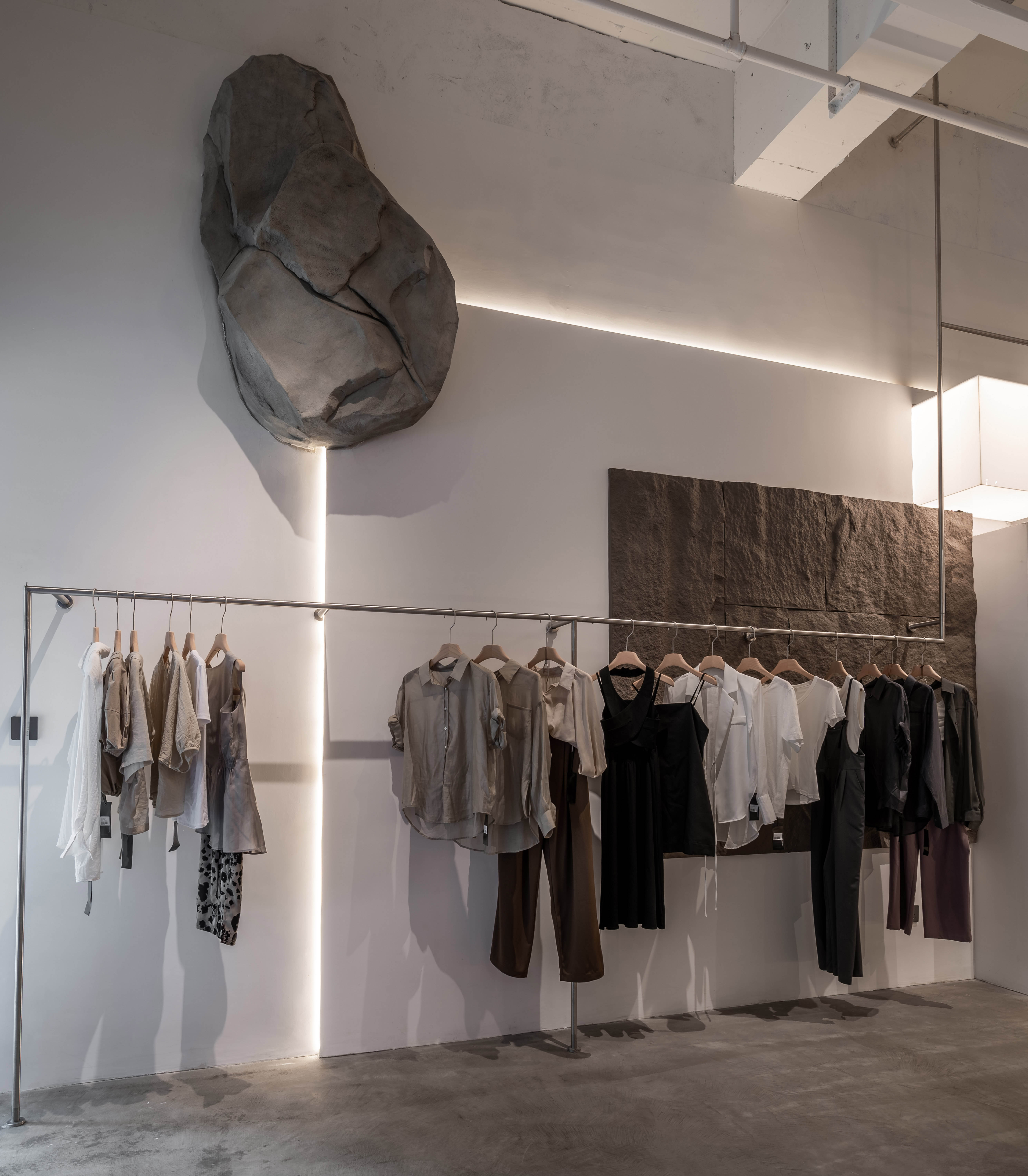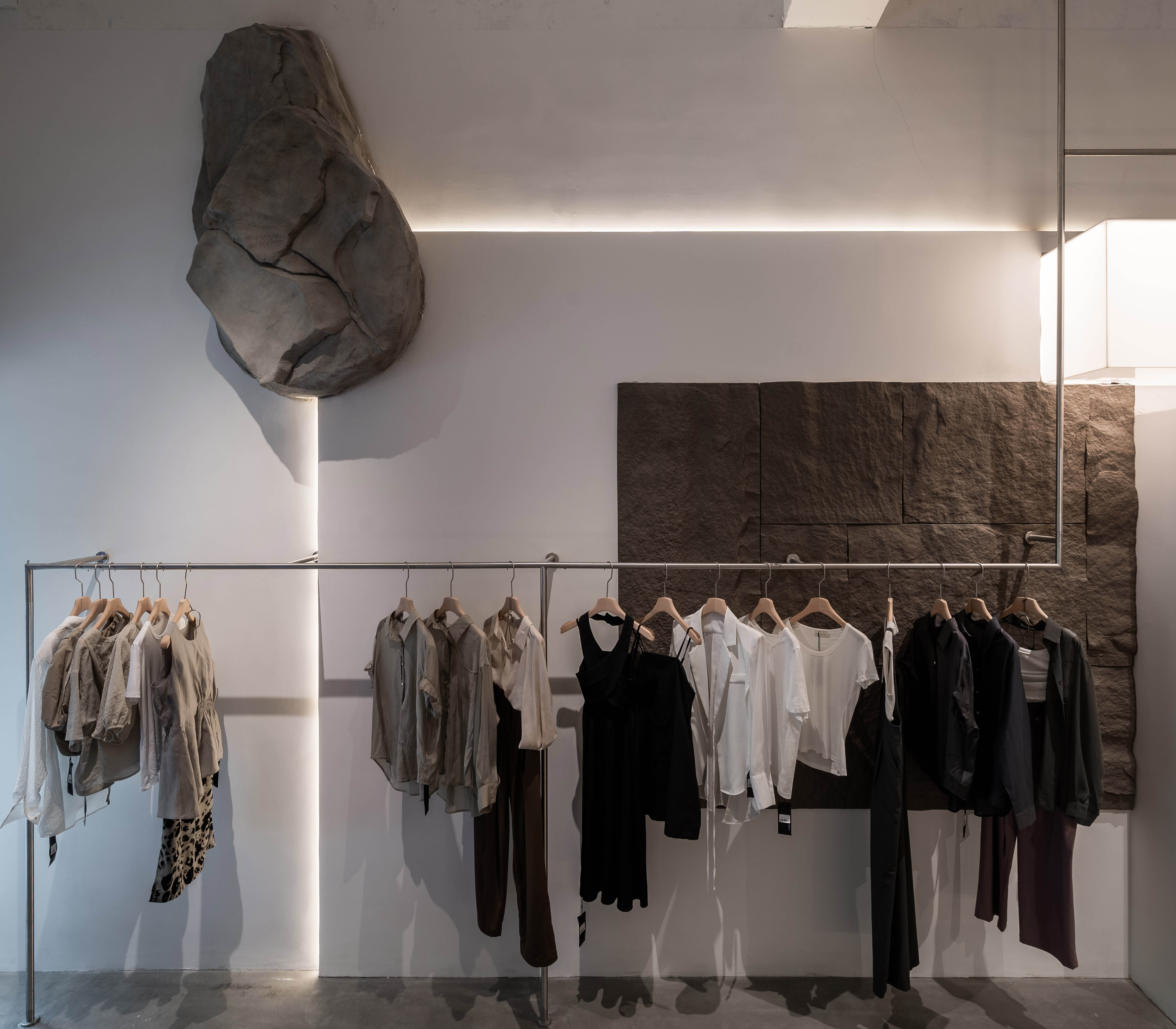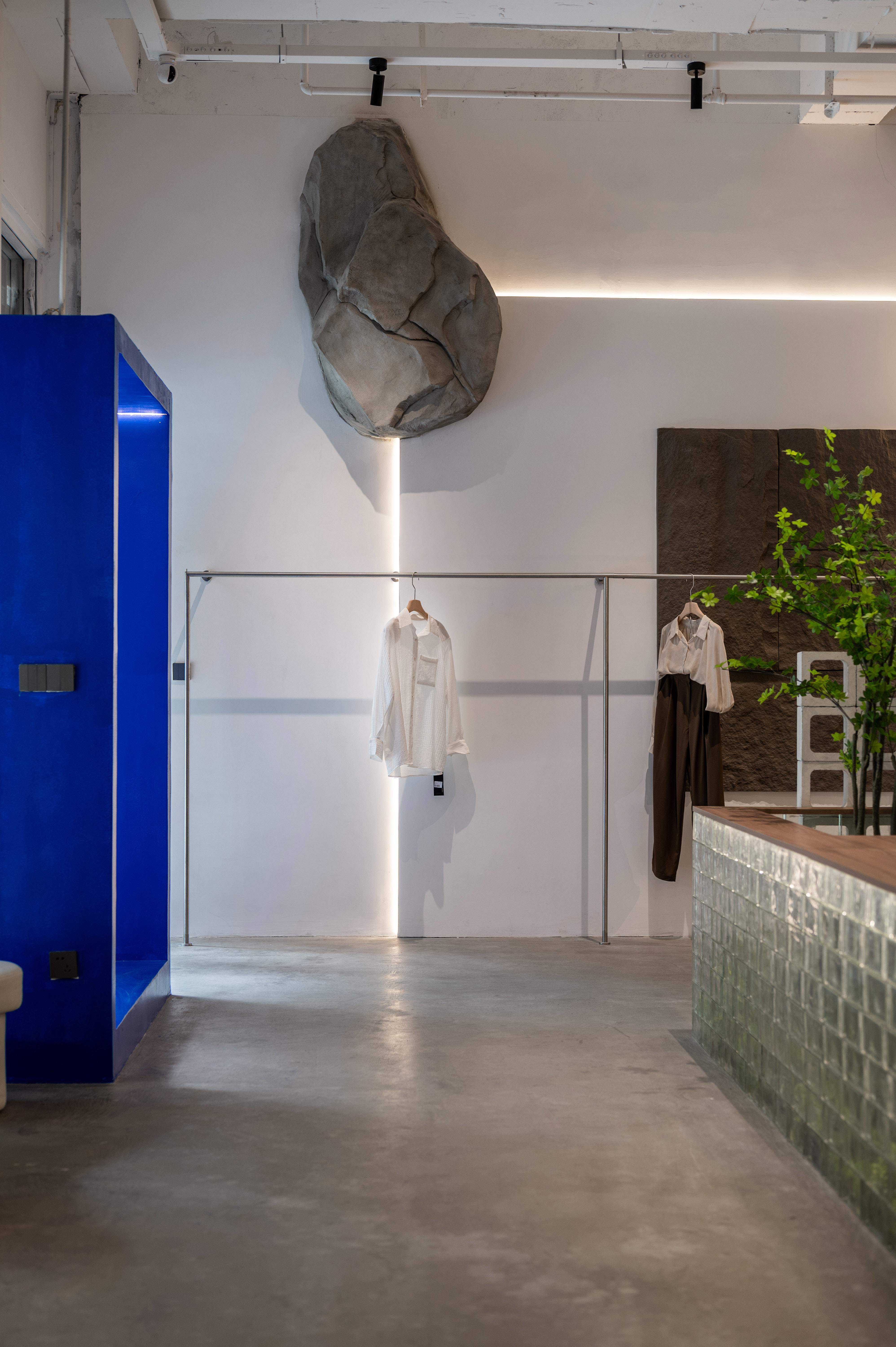 地面是水泥质感,墙面顶面白色大面积的弱化,自然,简洁,进门左手边的墙上,是一块大石头。 树木,石头,自然,万物,还有服饰,在万物诞生,展示。