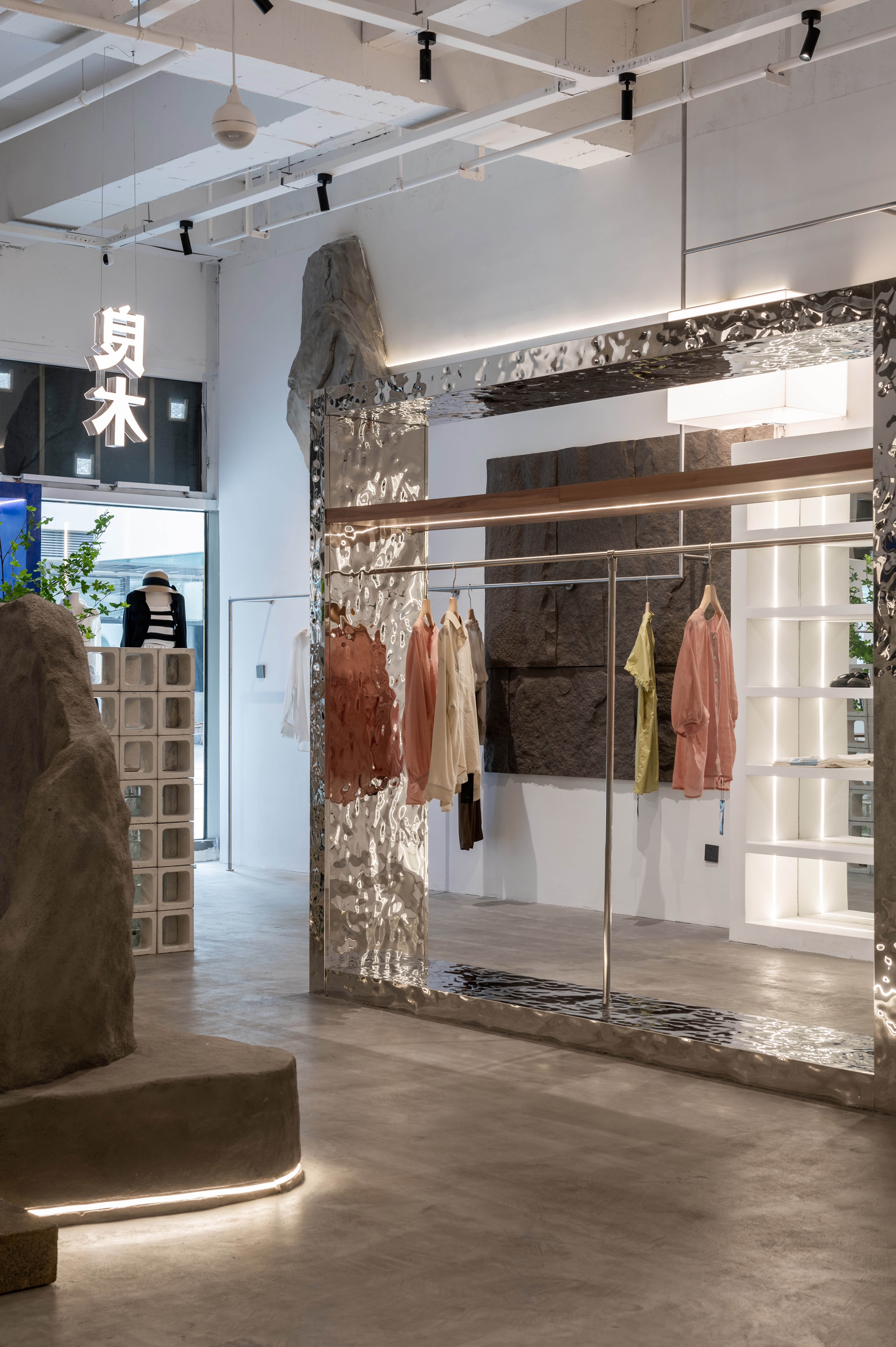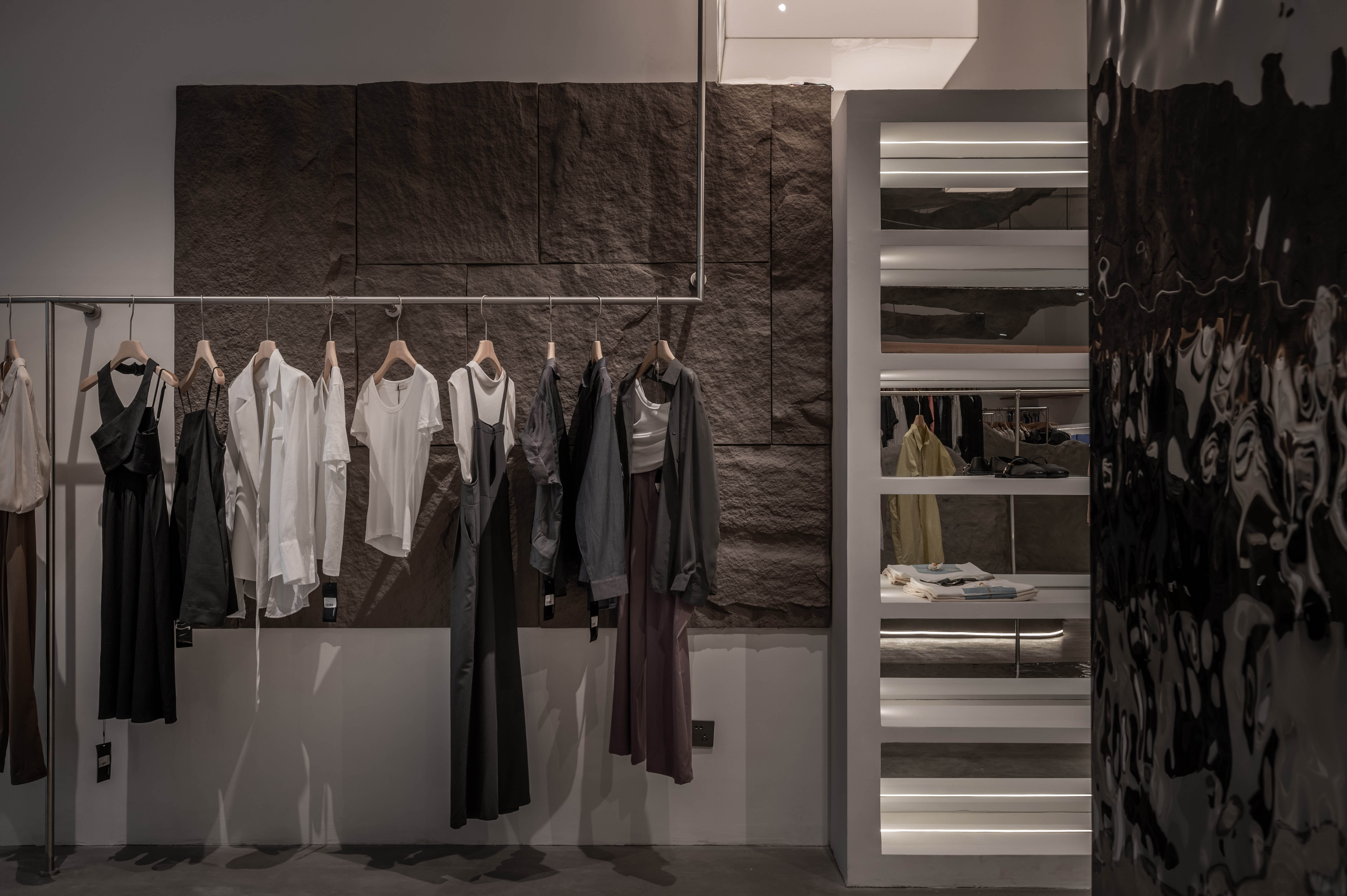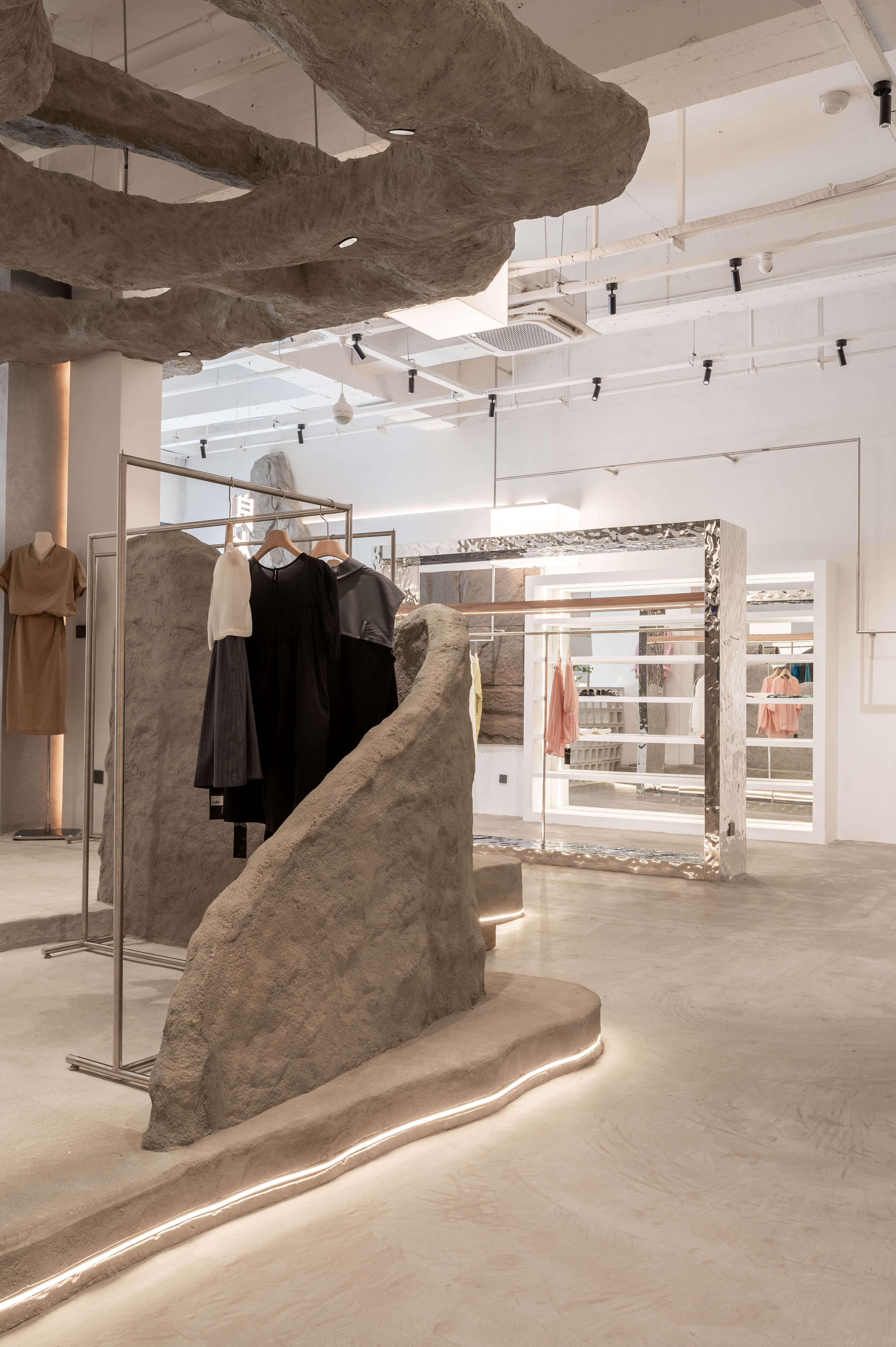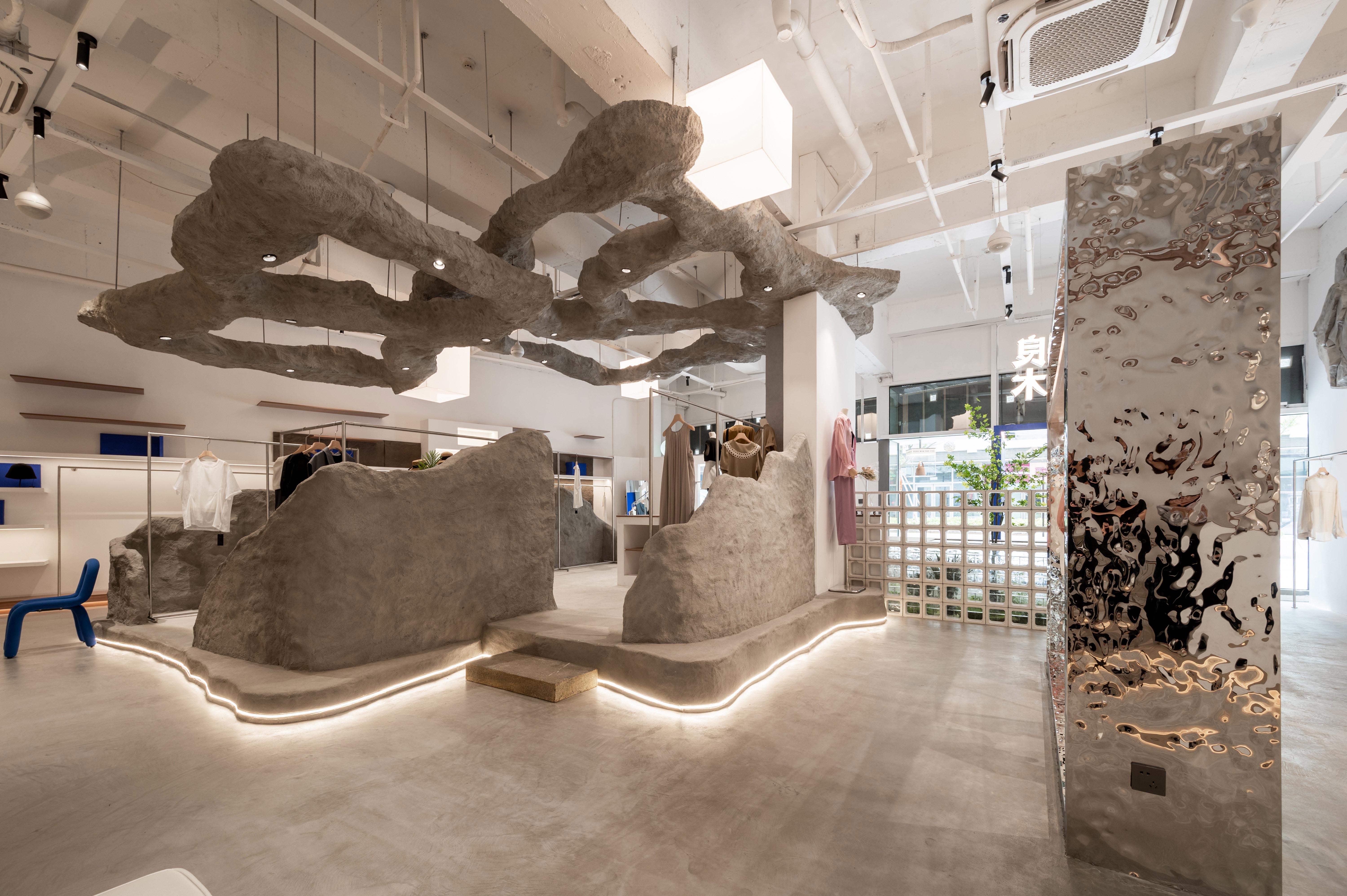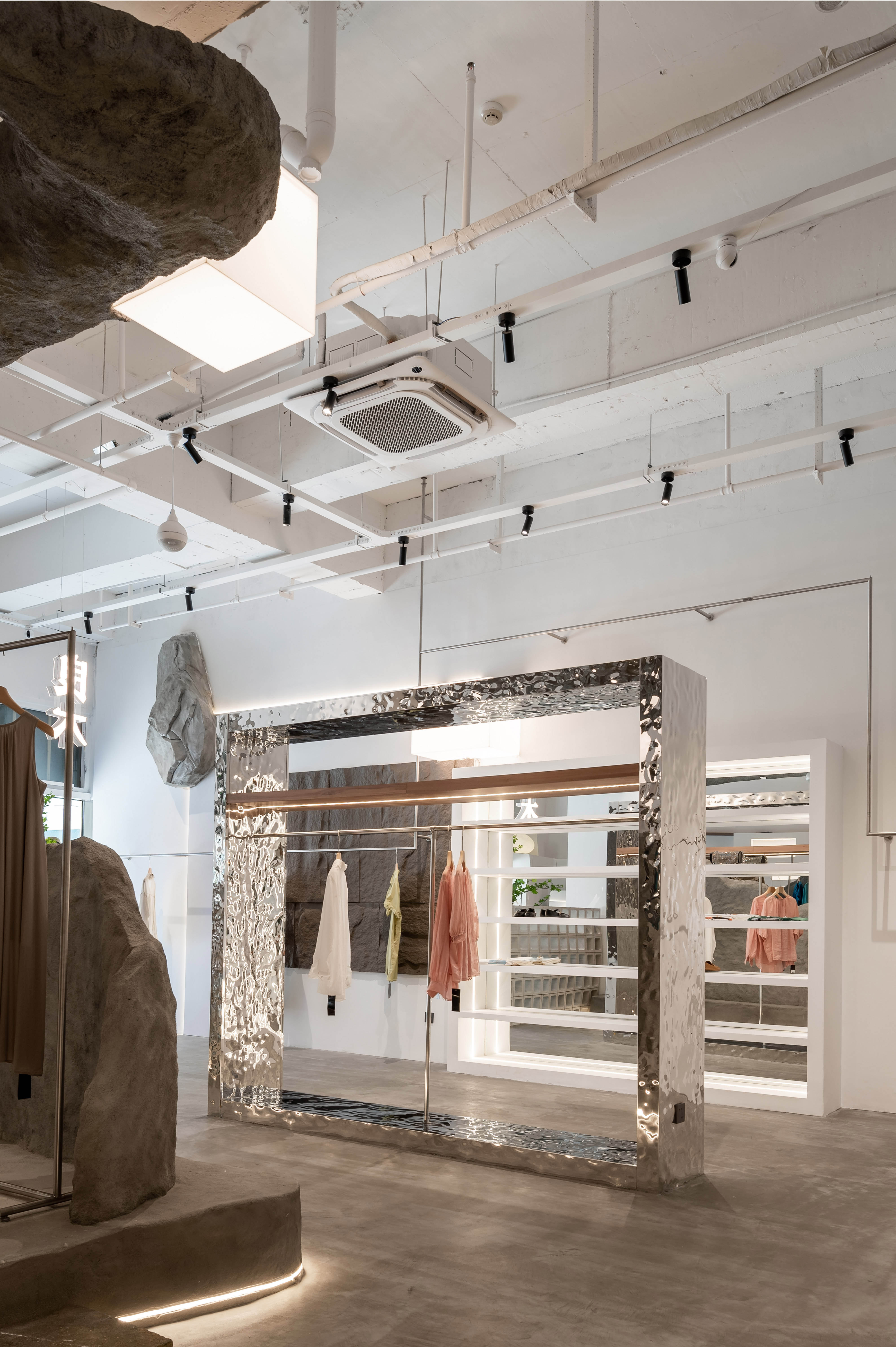 地面是水泥质感,墙面顶面白色大面积的弱化,自然,简洁,进门左手边的墙上,是一块大石头。 树木,石头,自然,万物,还有服饰,在万物诞生,展示。
