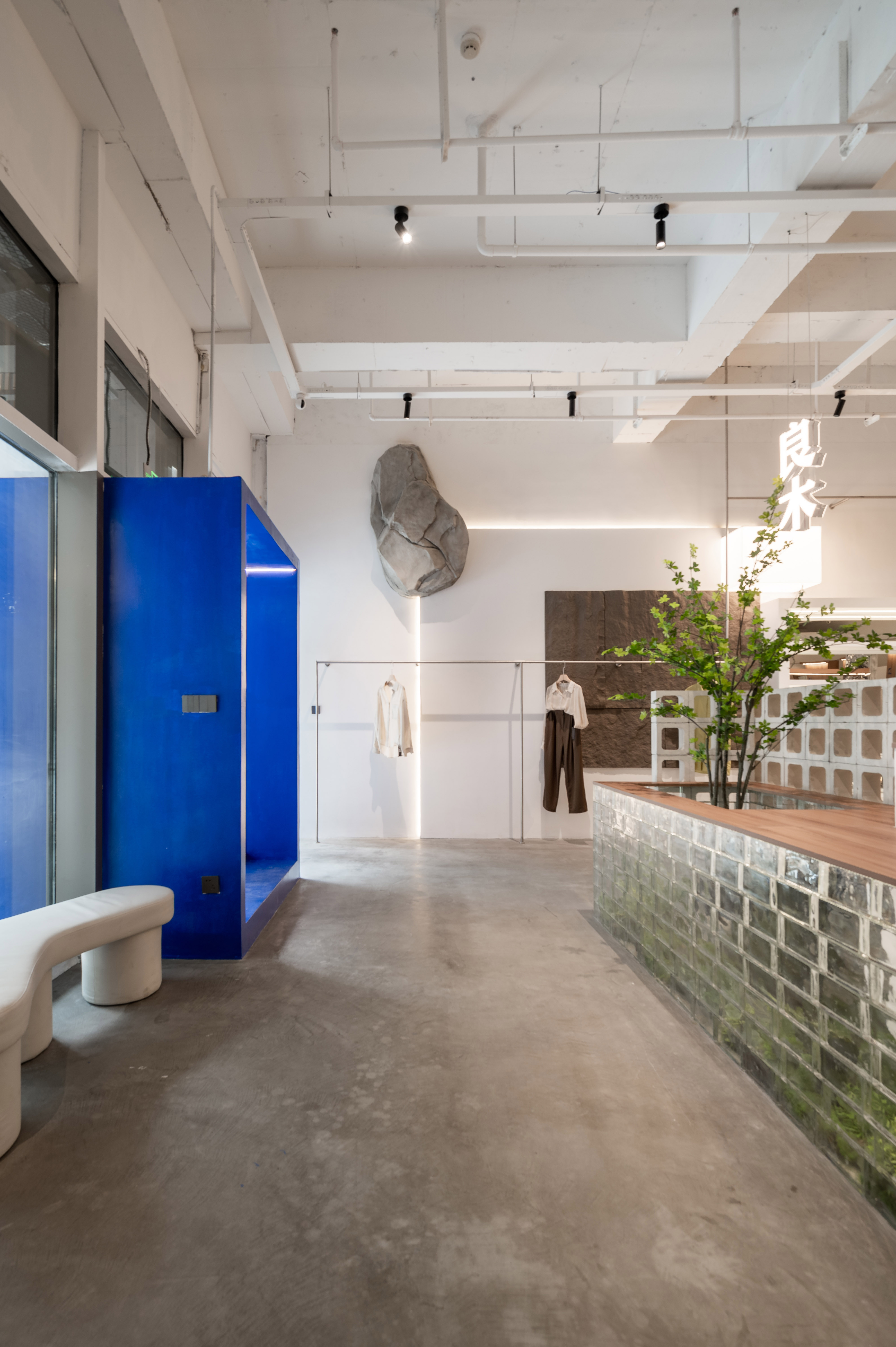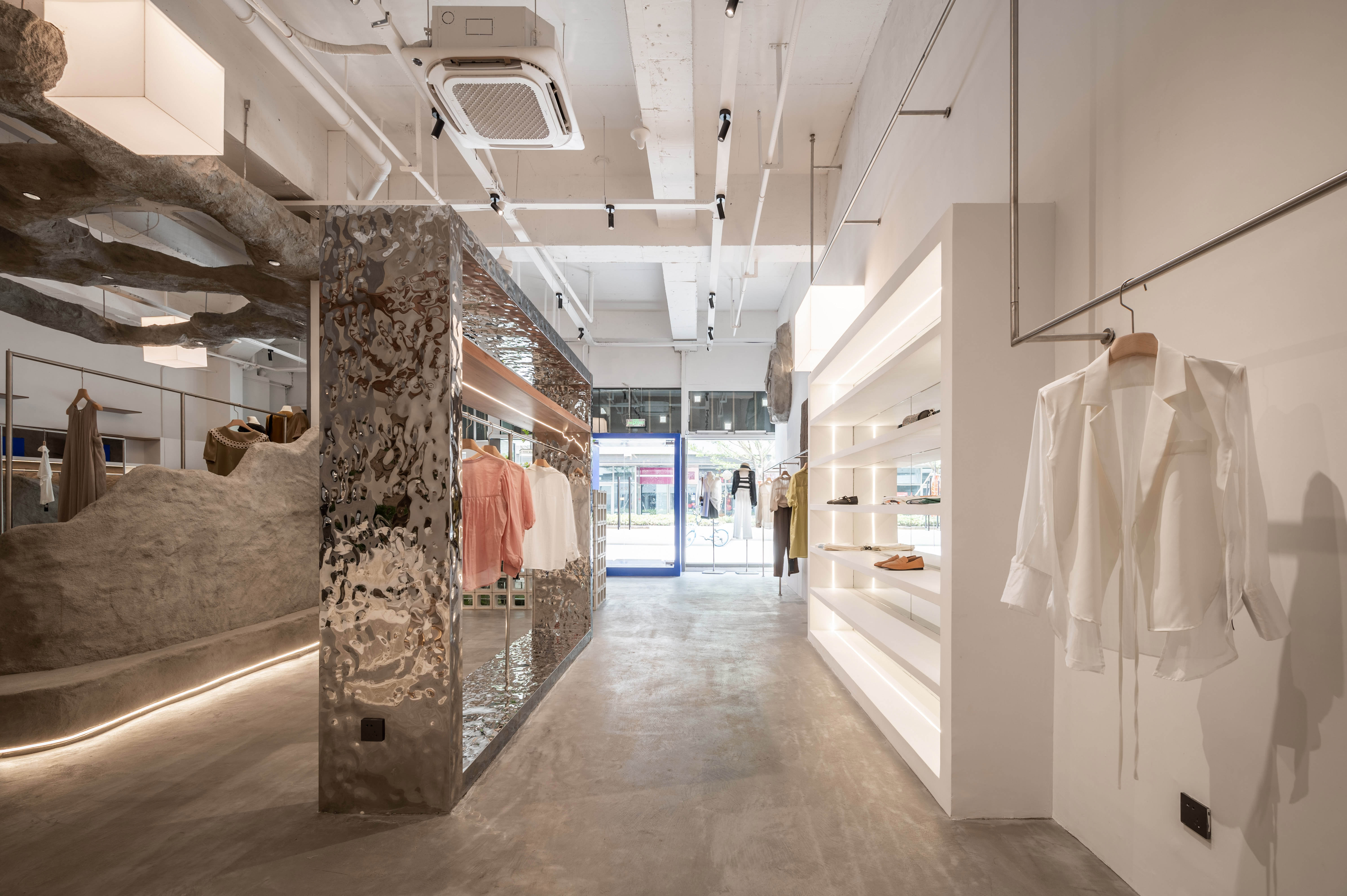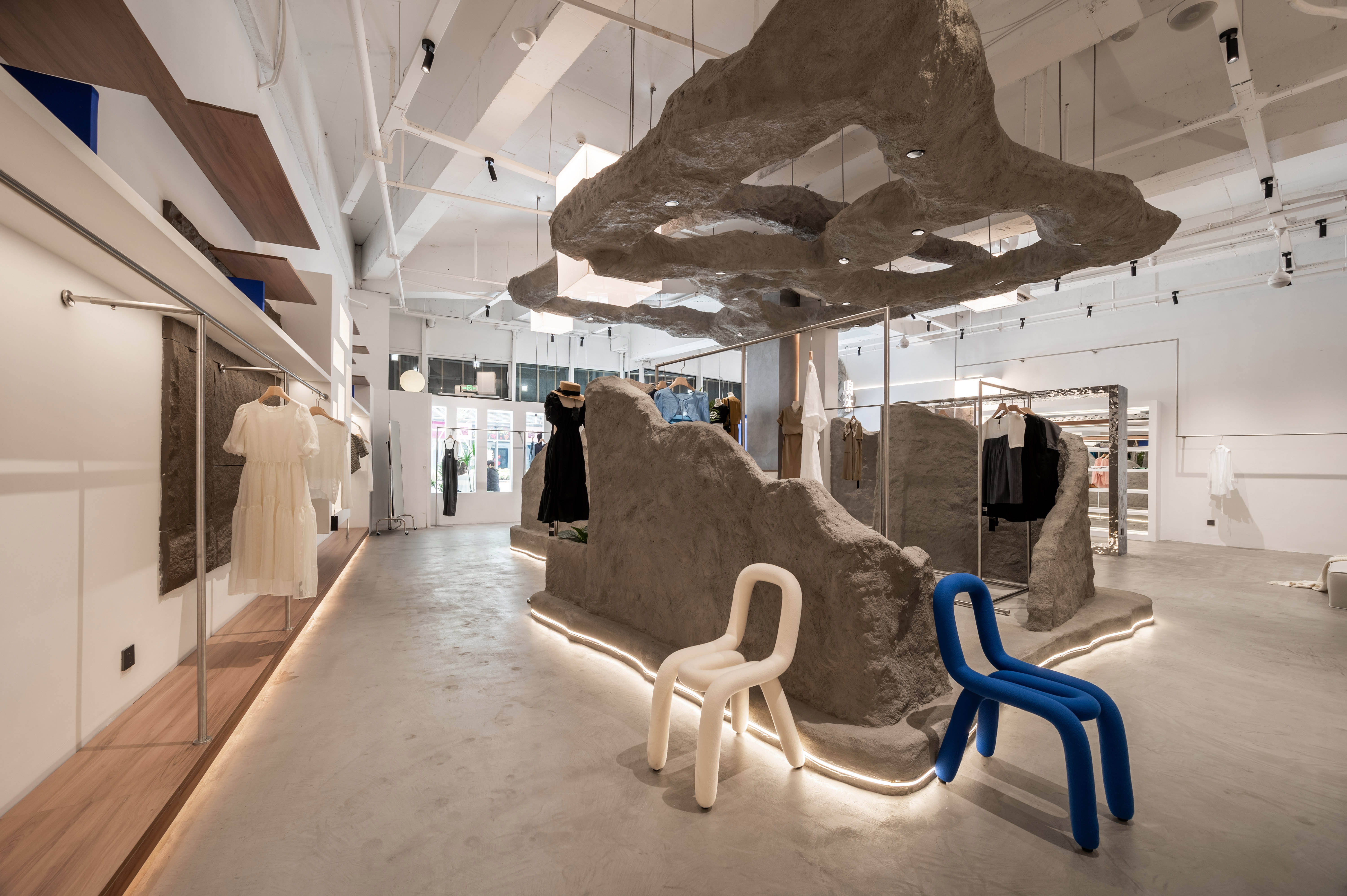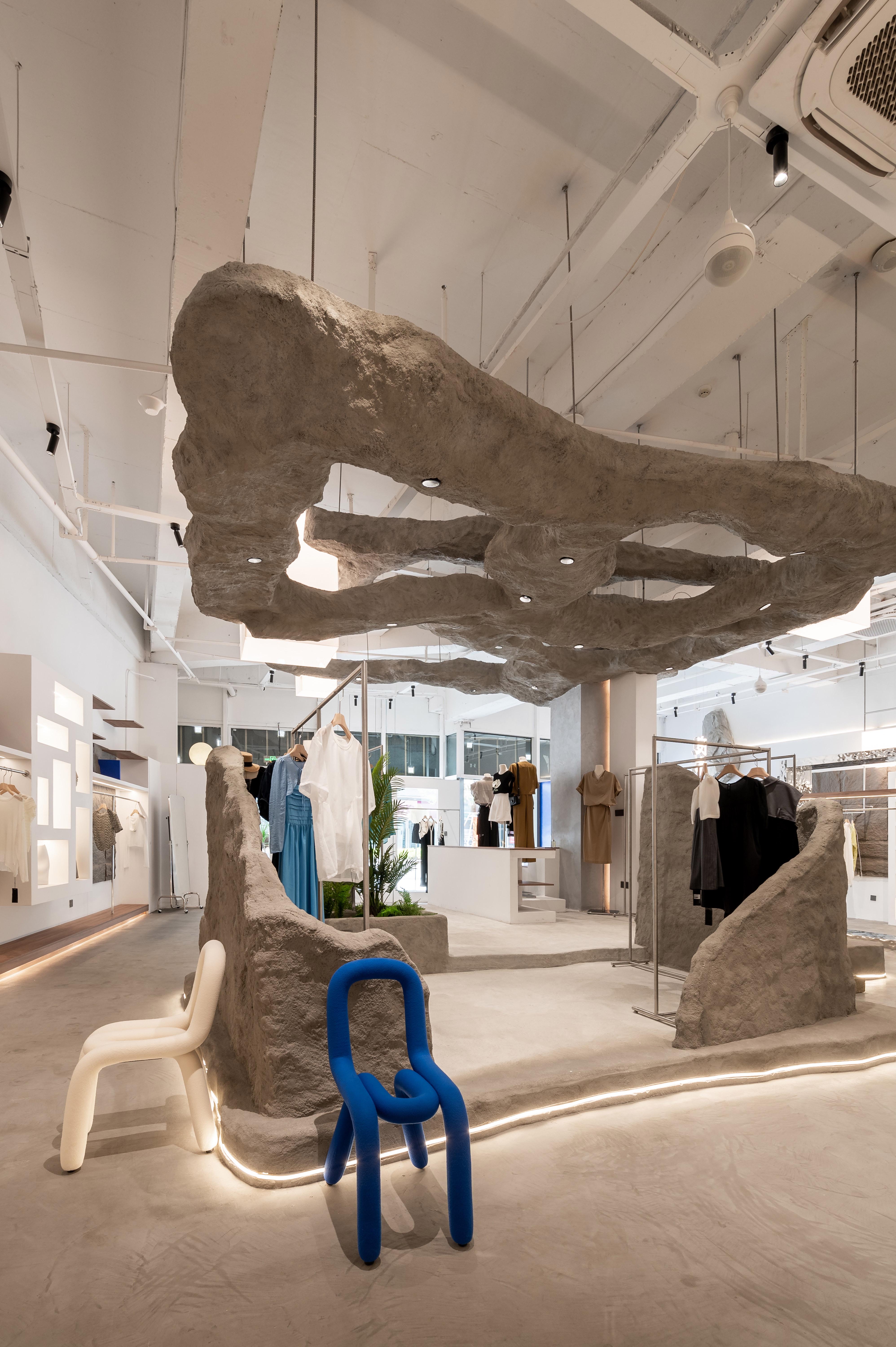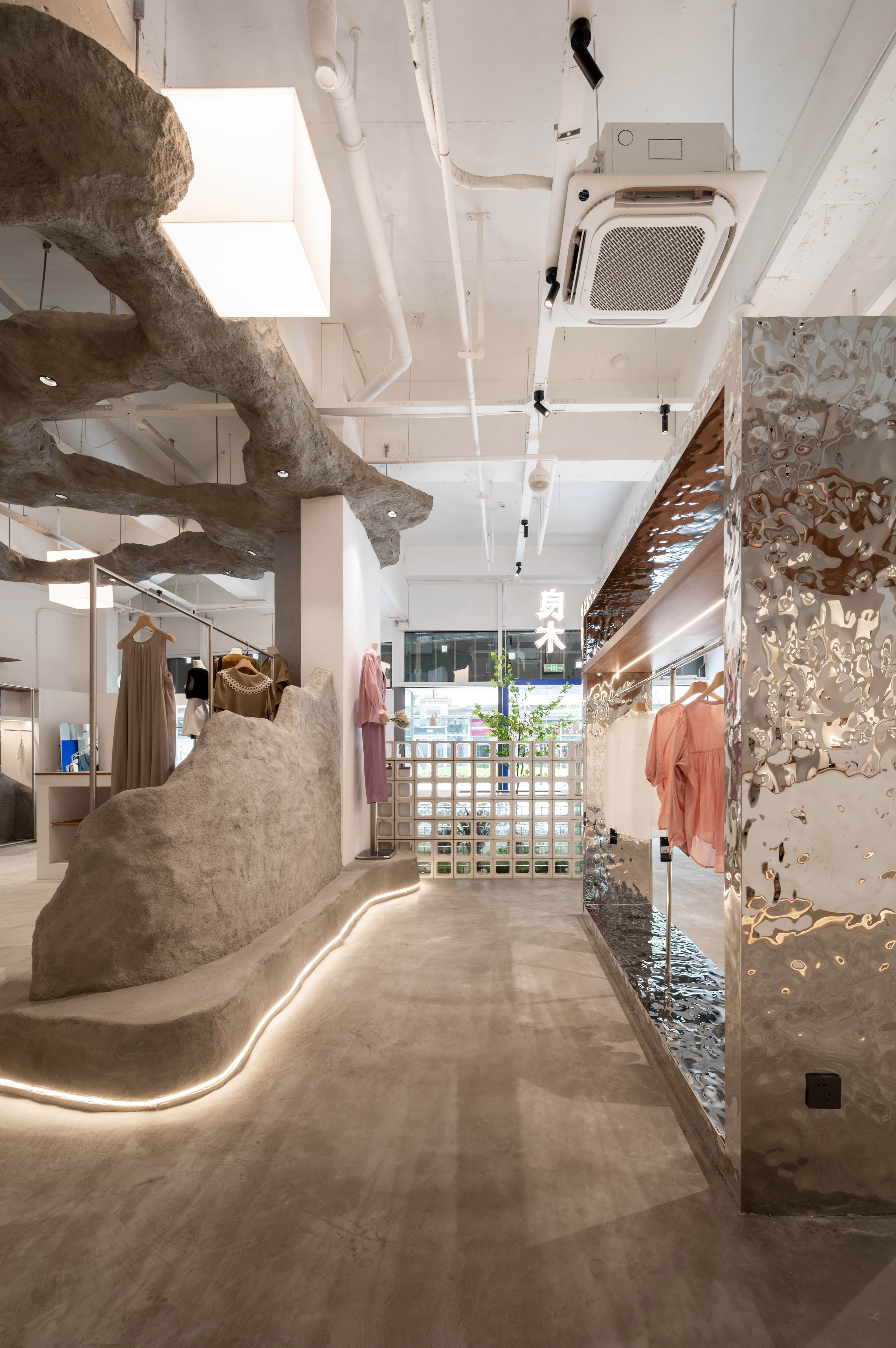 地面是水泥质感,墙面顶面白色大面积的弱化,自然,简洁,进门左手边的墙上,是一块大石头。 树木,石头,自然,万物,还有服饰,在万物诞生,展示。