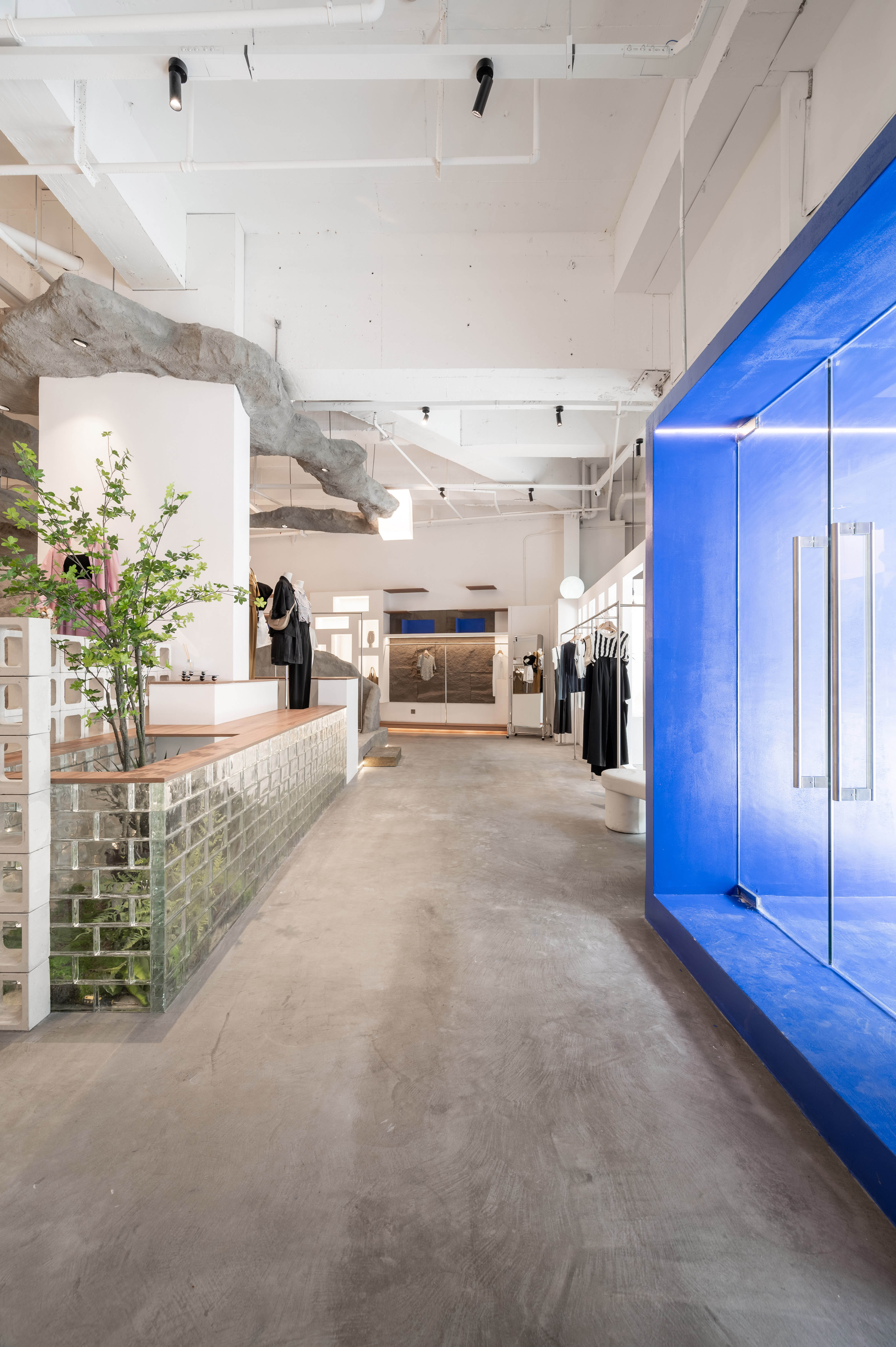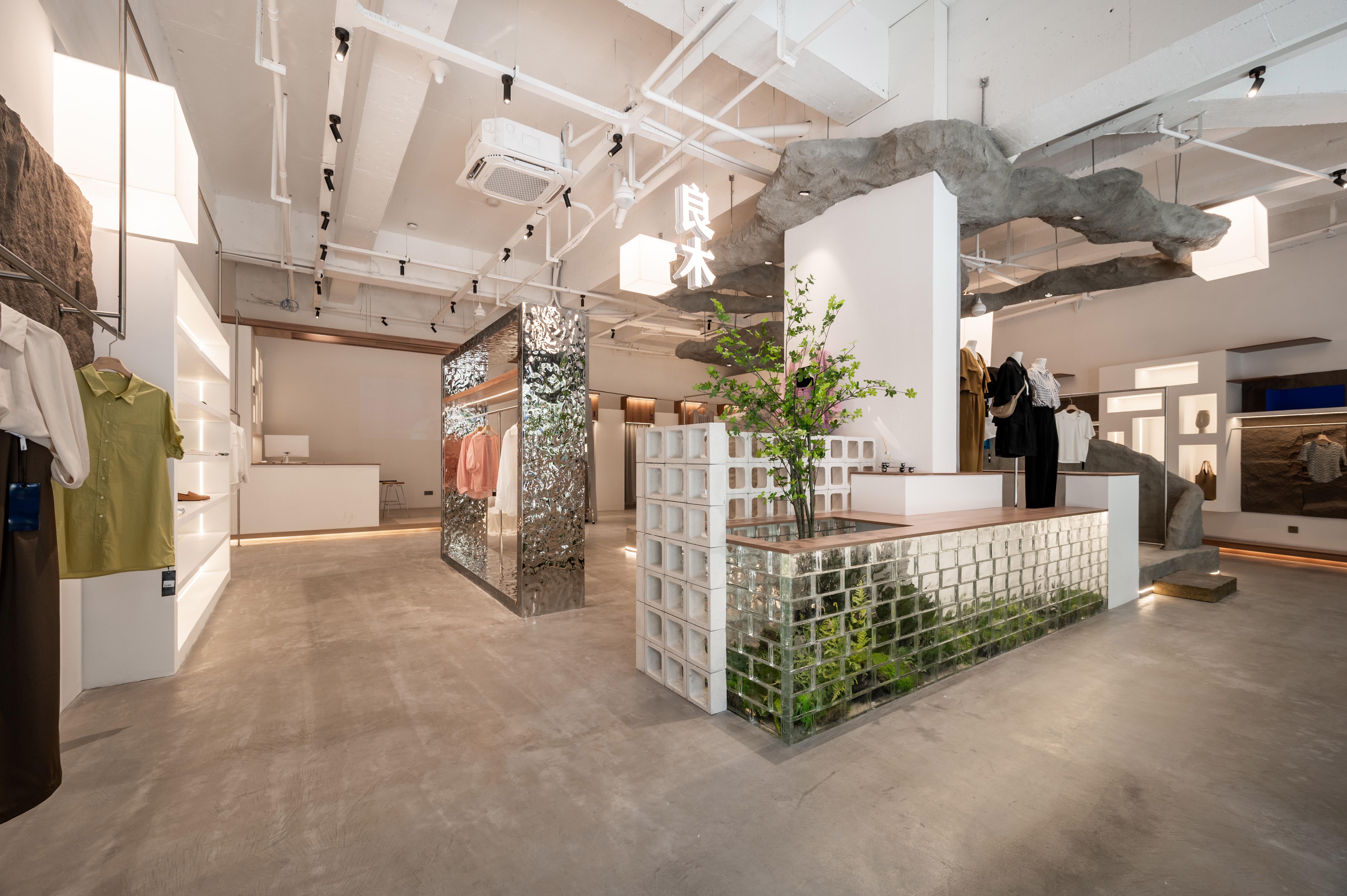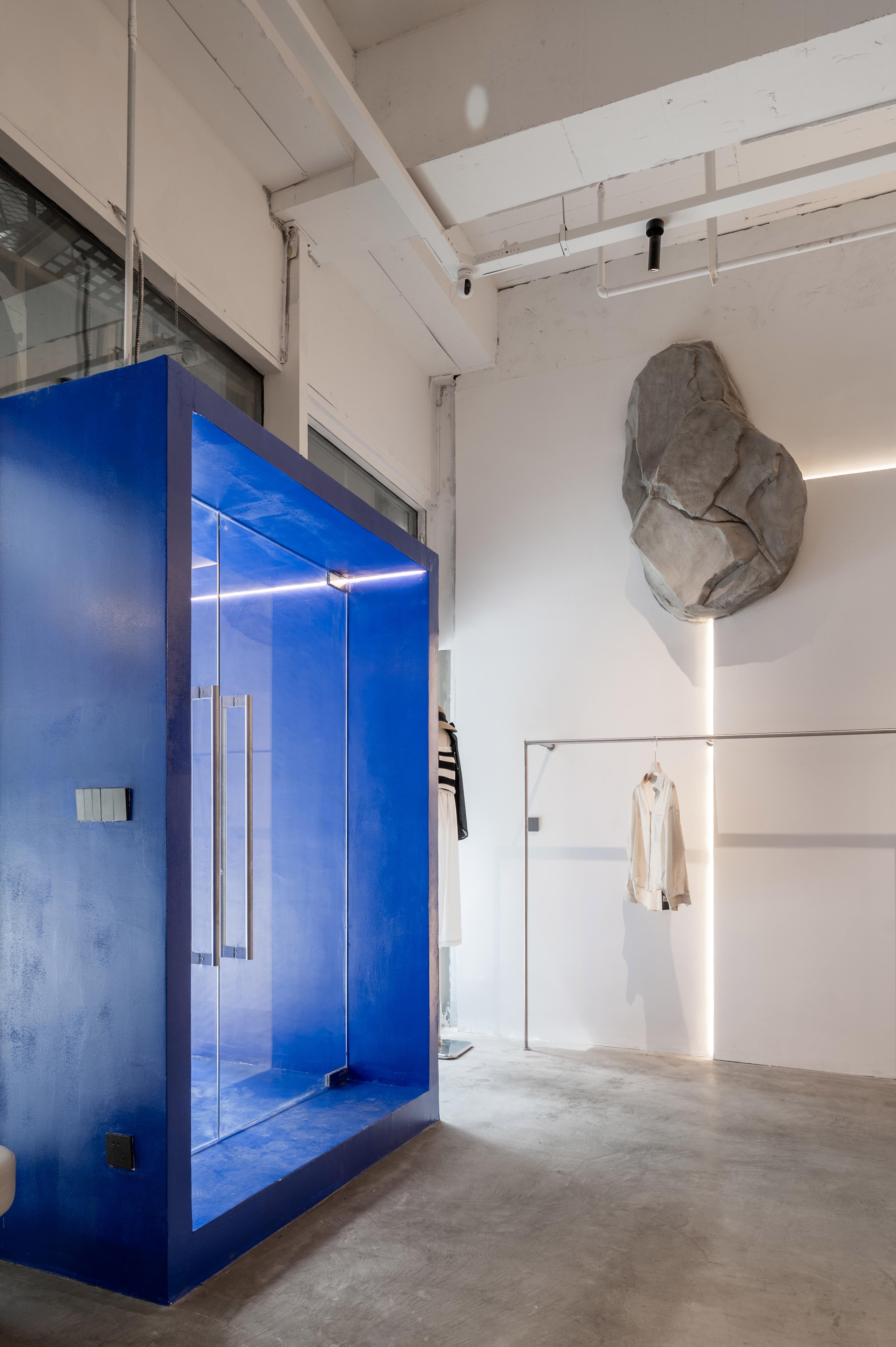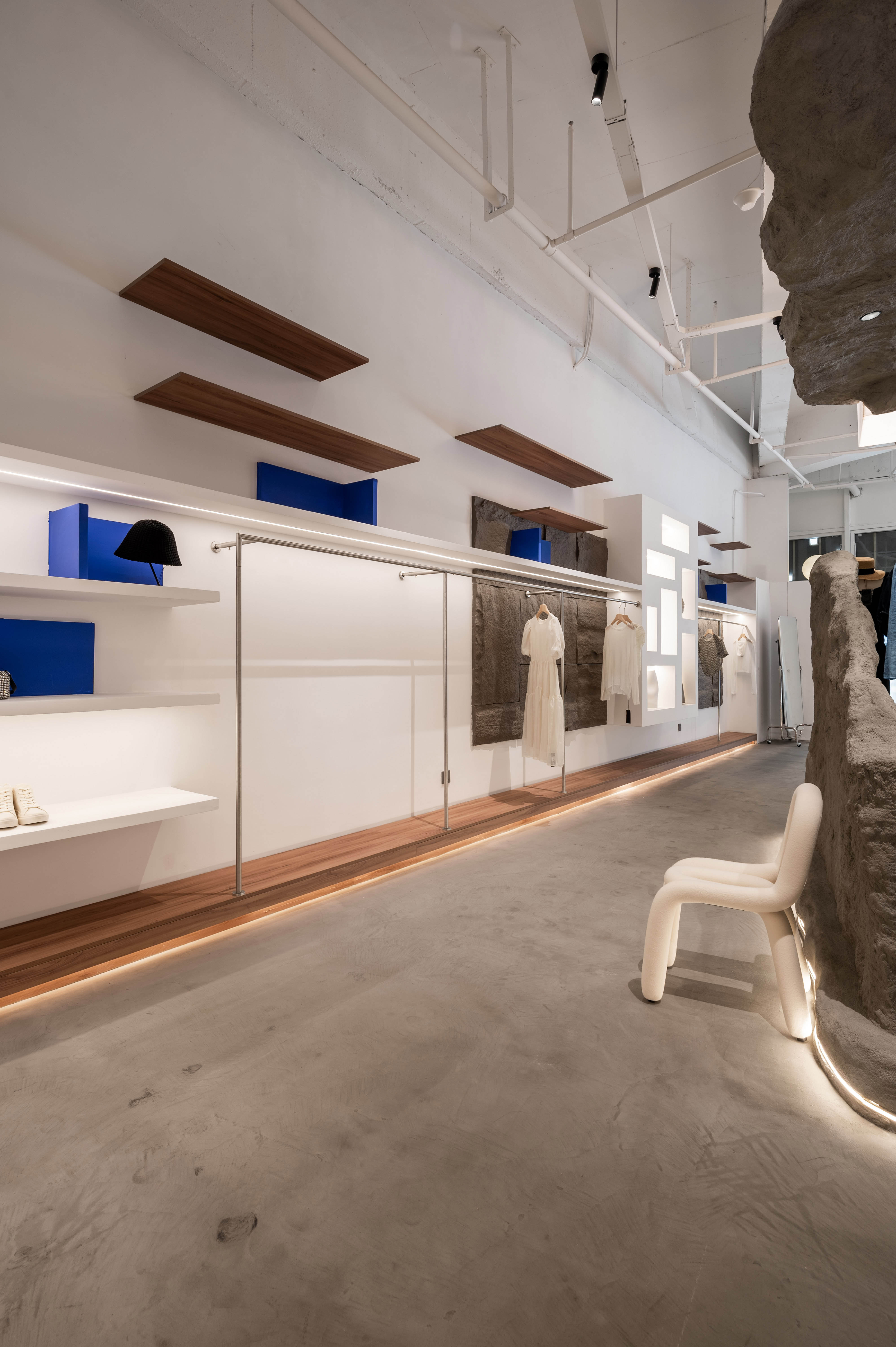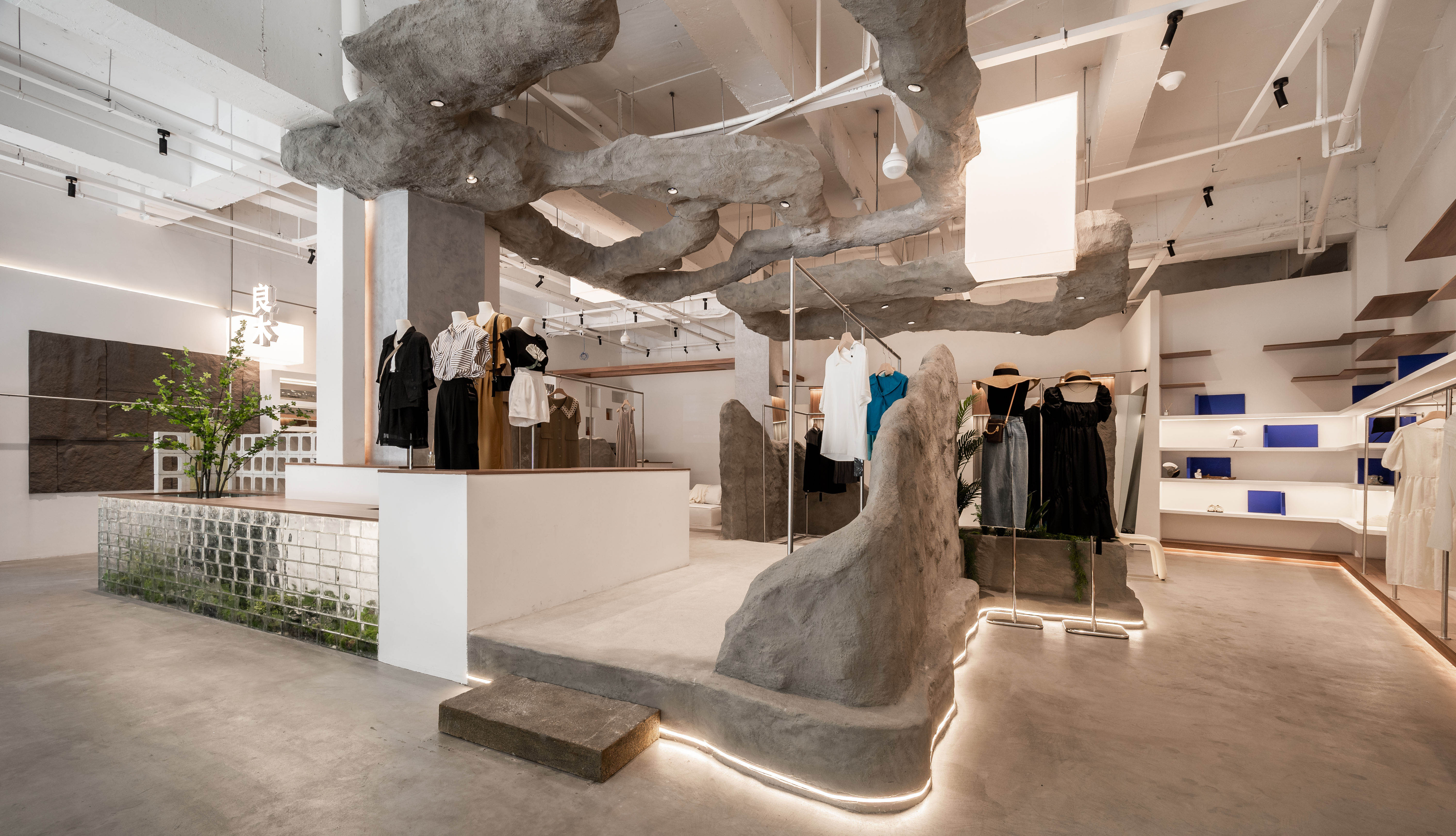 地面是水泥质感,墙面顶面白色大面积的弱化,自然,简洁,进门左手边的墙上,是一块大石头。 树木,石头,自然,万物,还有服饰,在万物诞生,展示。