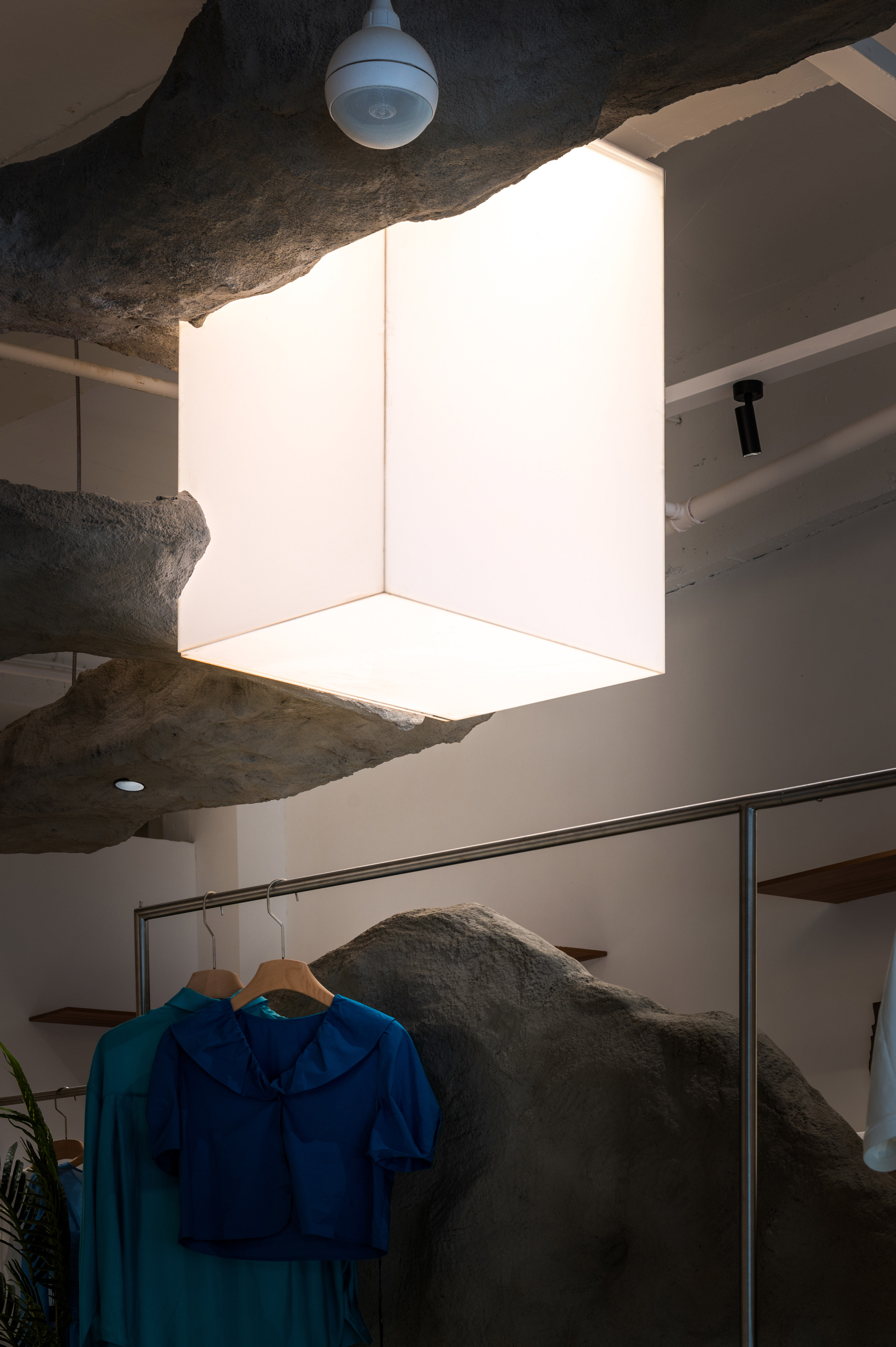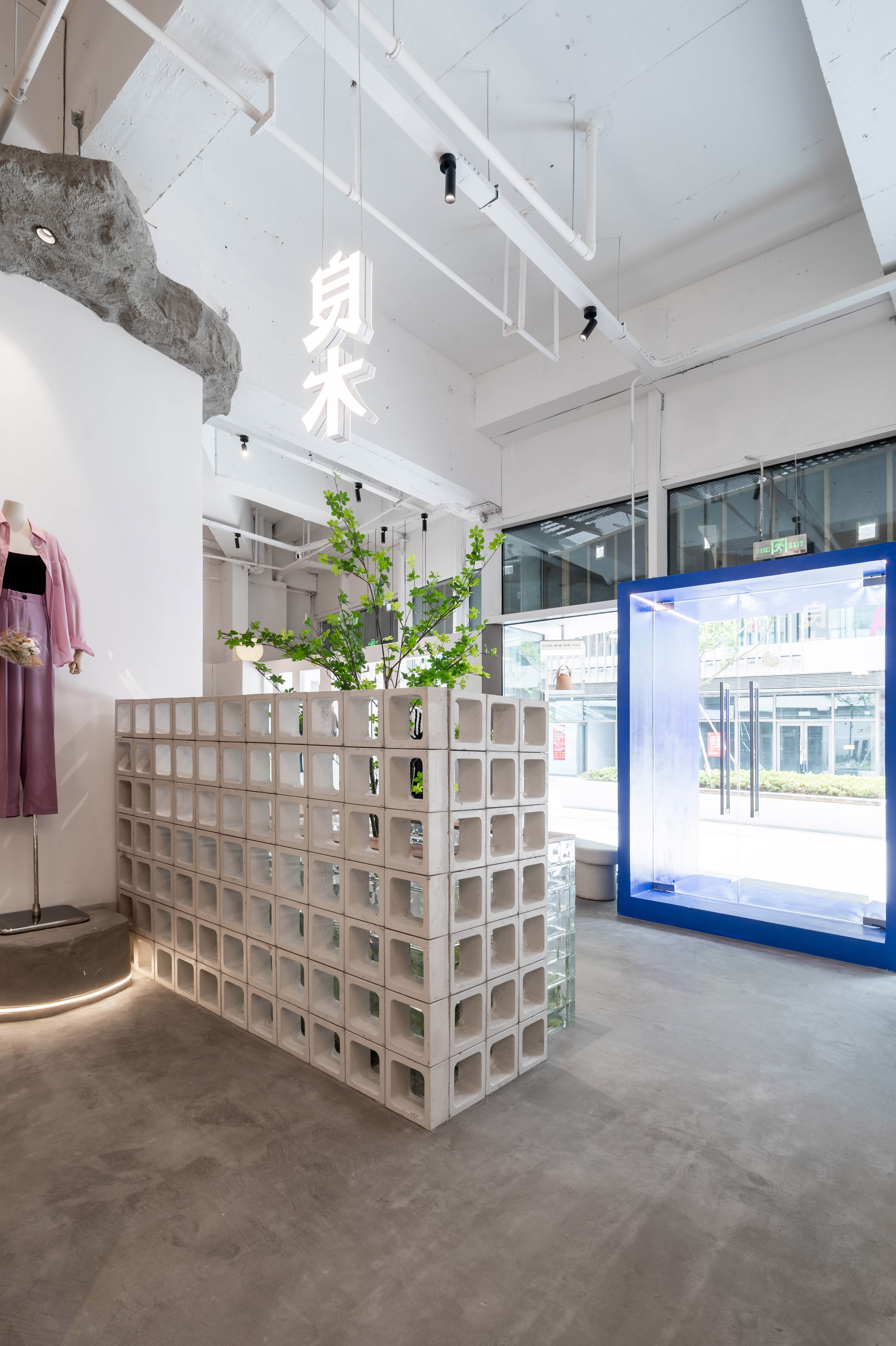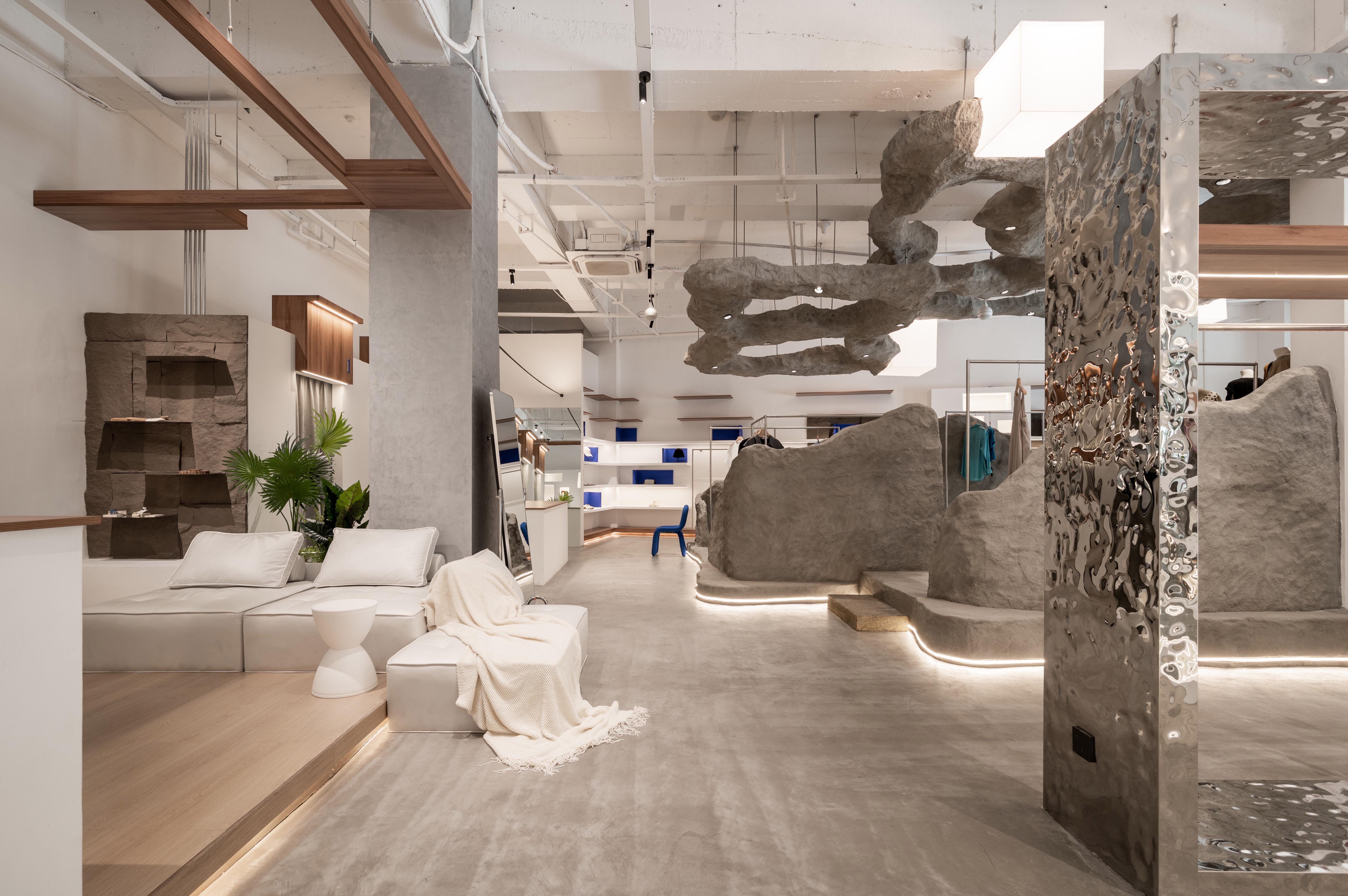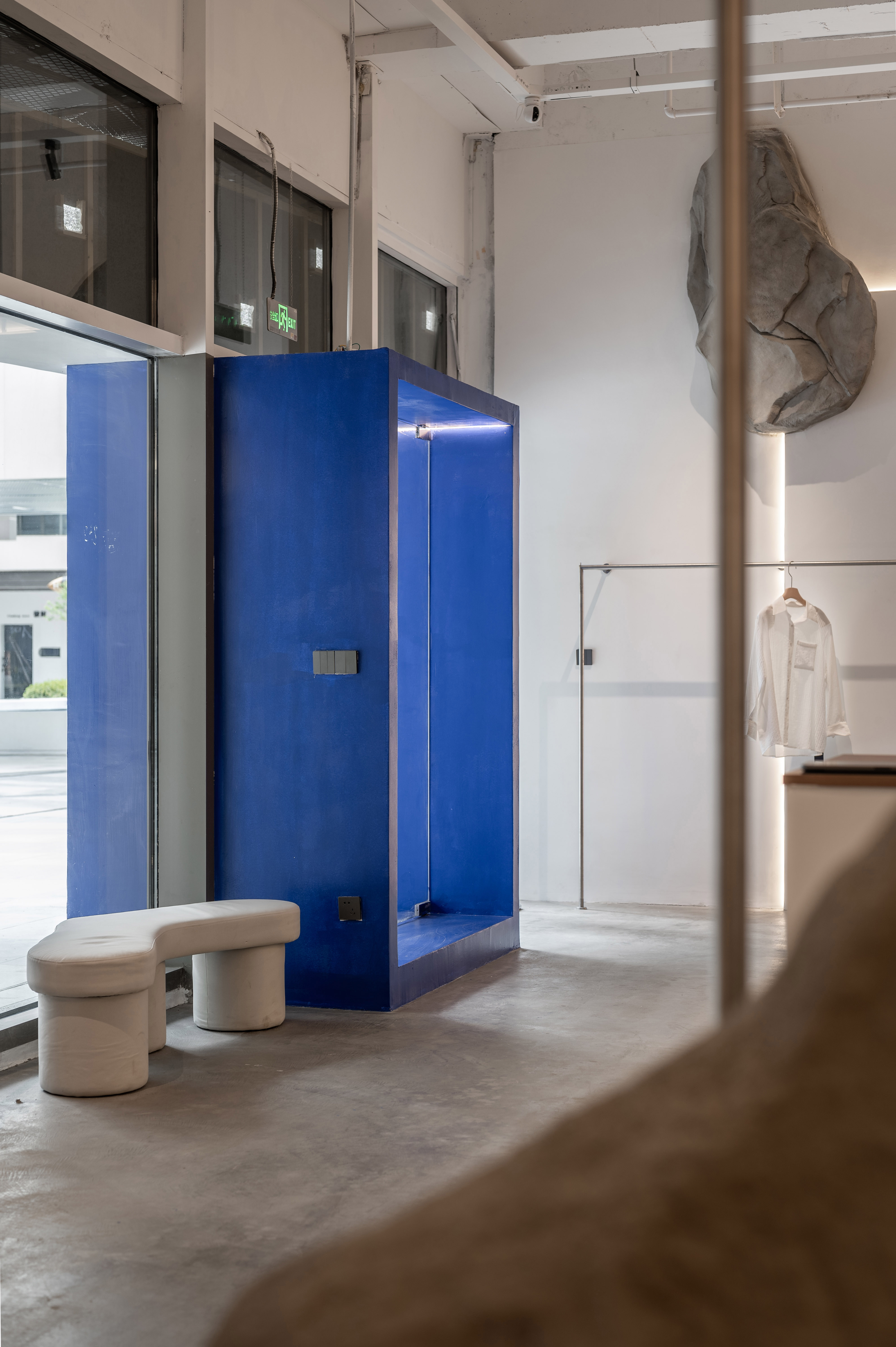 地面是水泥质感,墙面顶面白色大面积的弱化,自然,简洁,进门左手边的墙上,是一块大石头。 树木,石头,自然,万物,还有服饰,在万物诞生,展示。