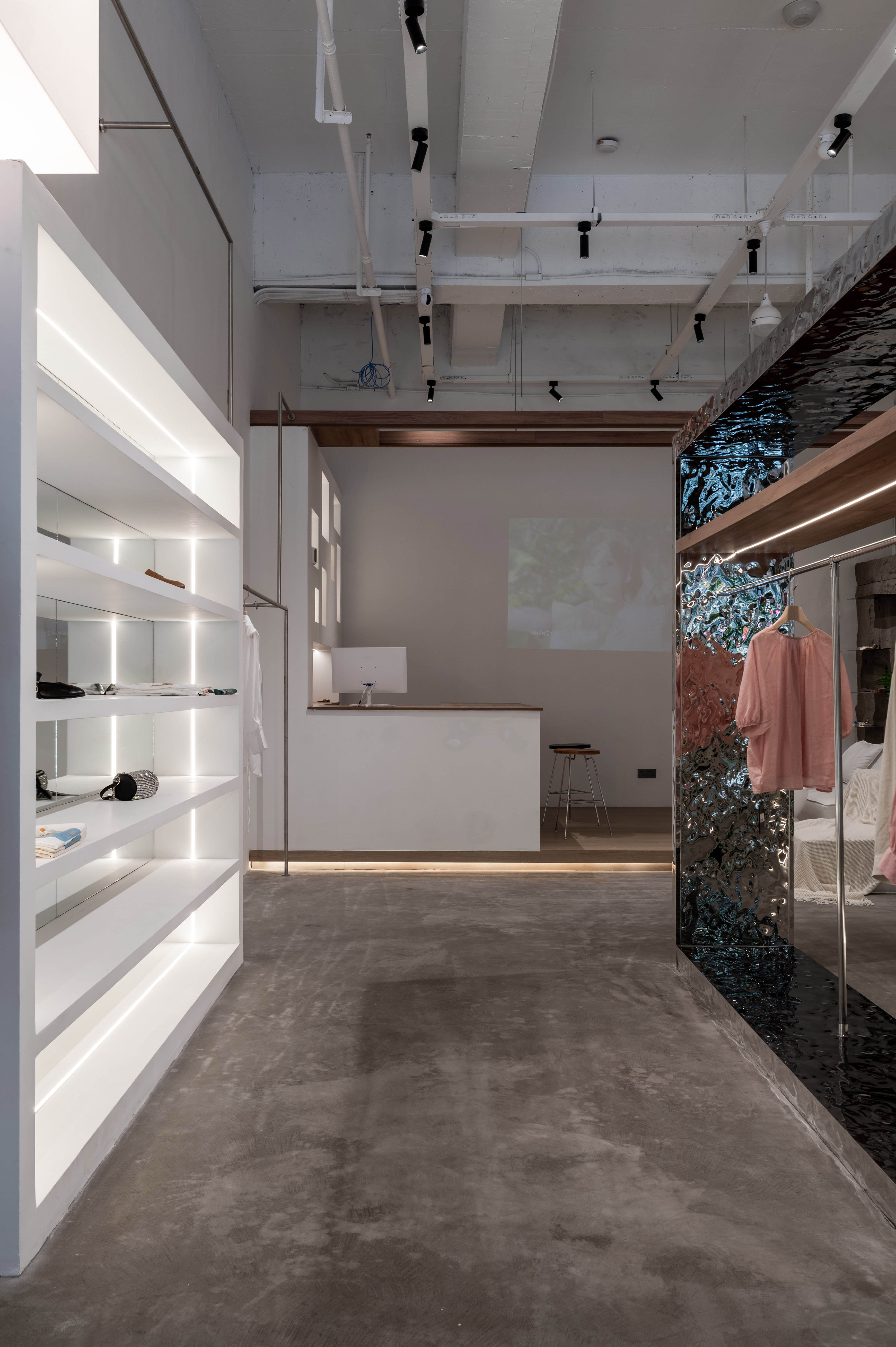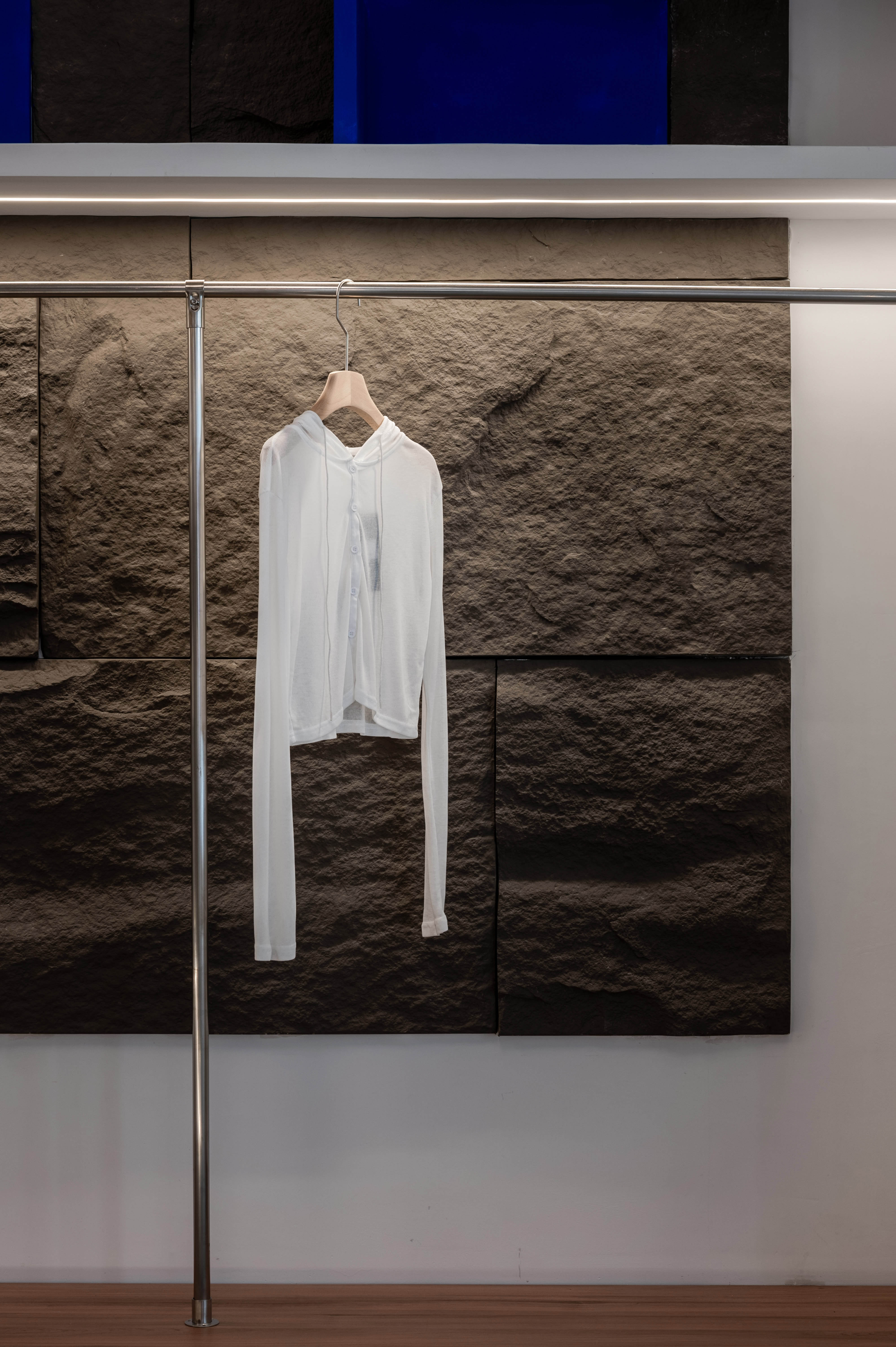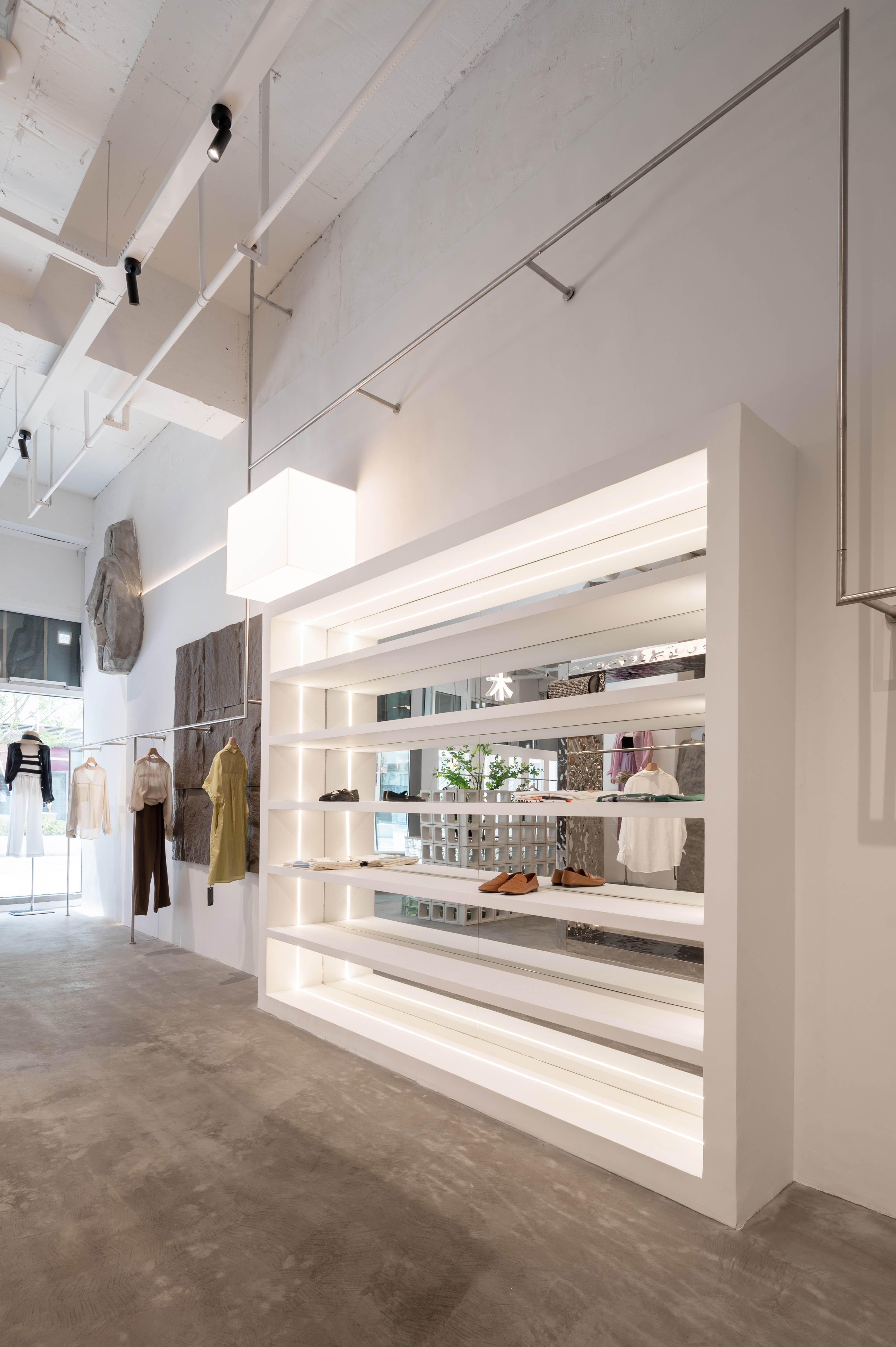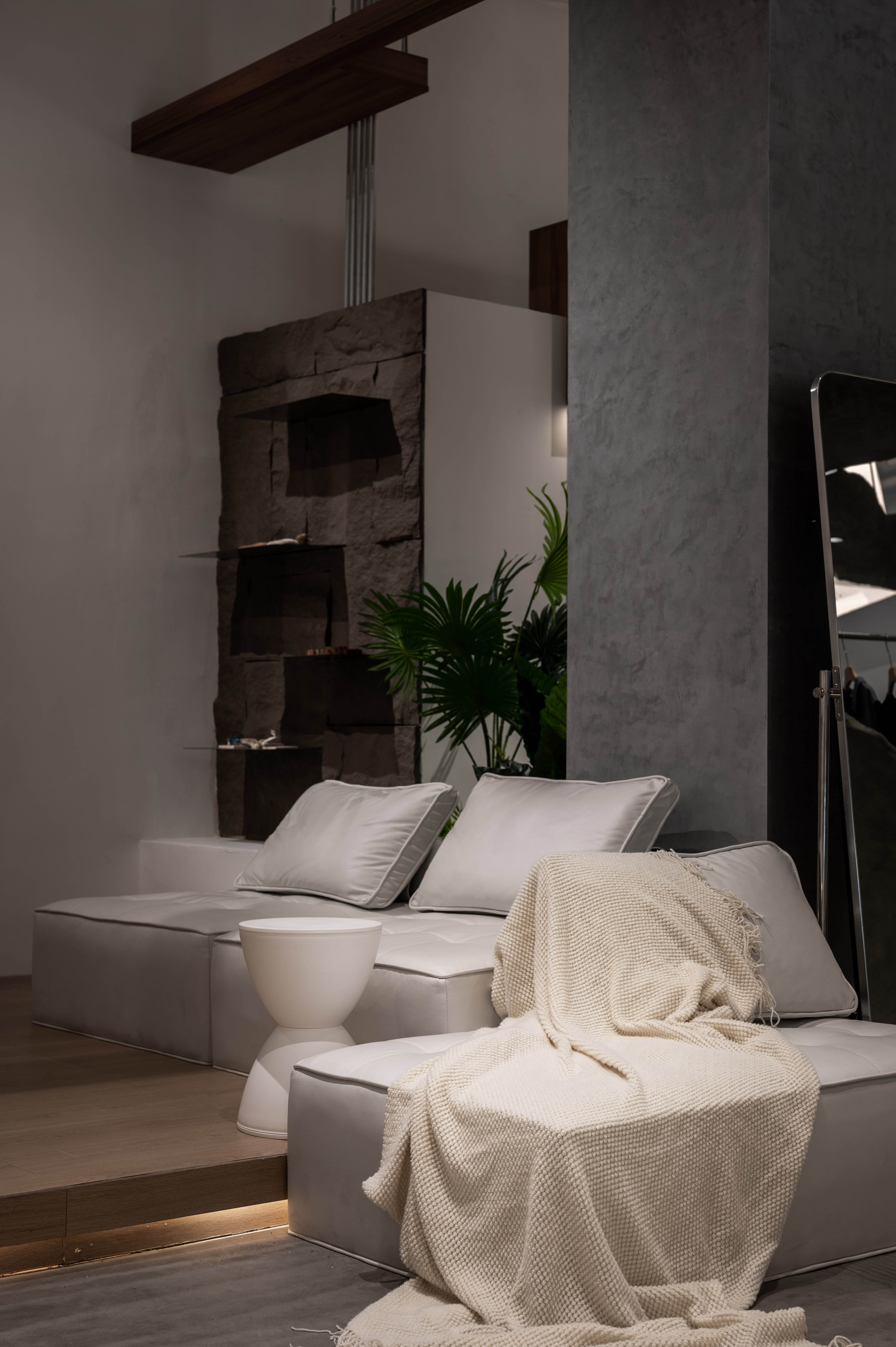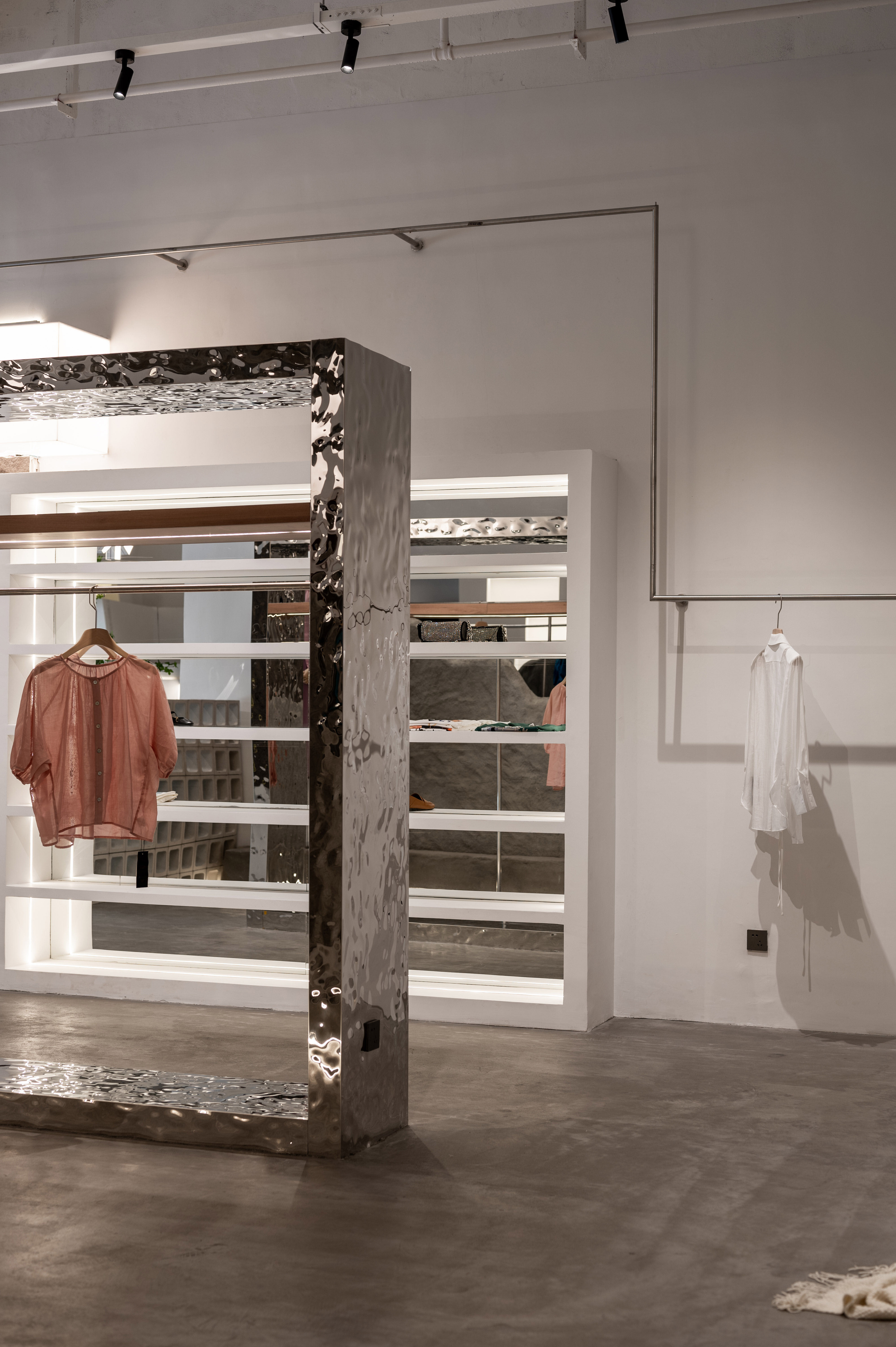 地面是水泥质感,墙面顶面白色大面积的弱化,自然,简洁,进门左手边的墙上,是一块大石头。 树木,石头,自然,万物,还有服饰,在万物诞生,展示。