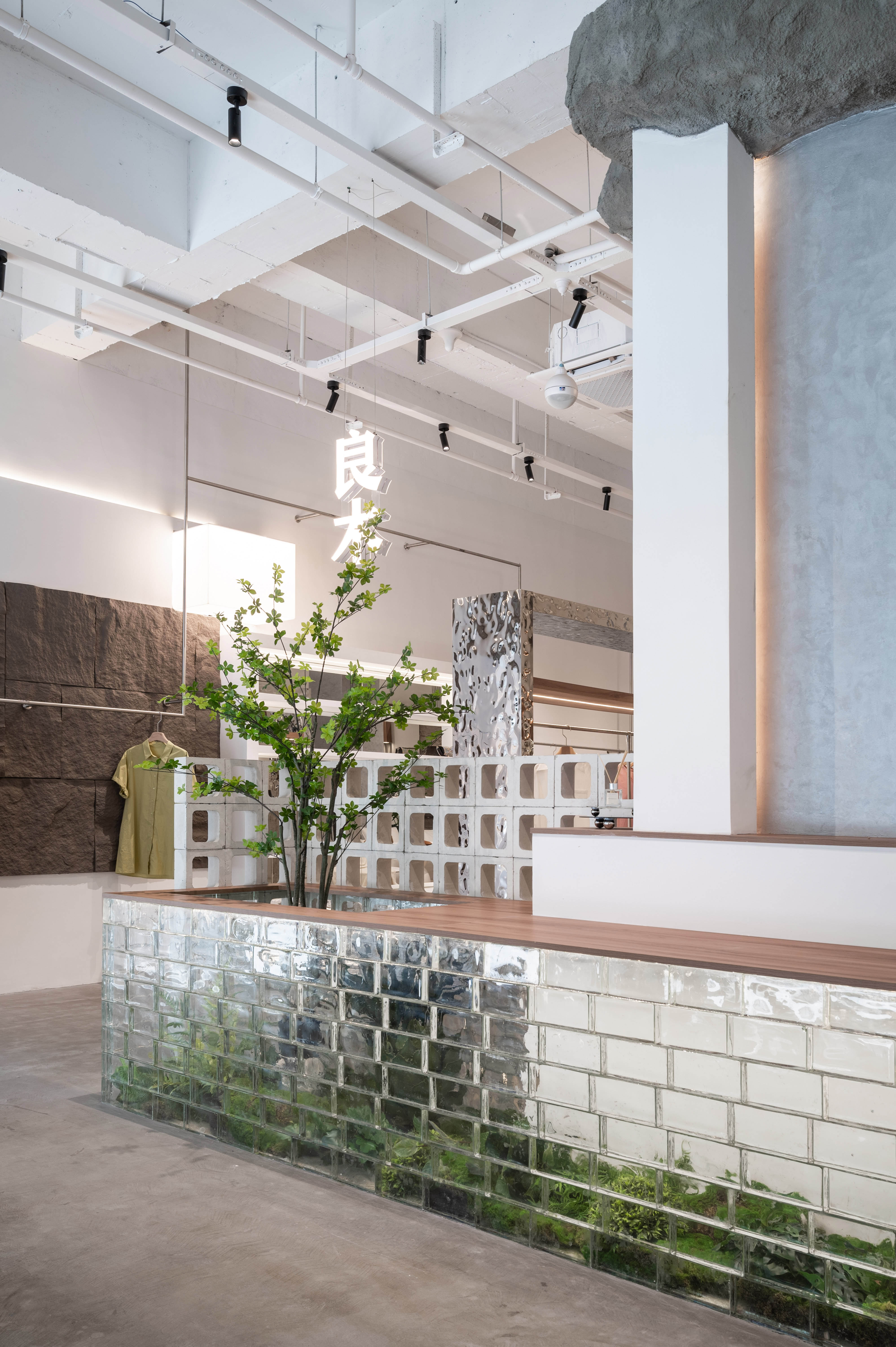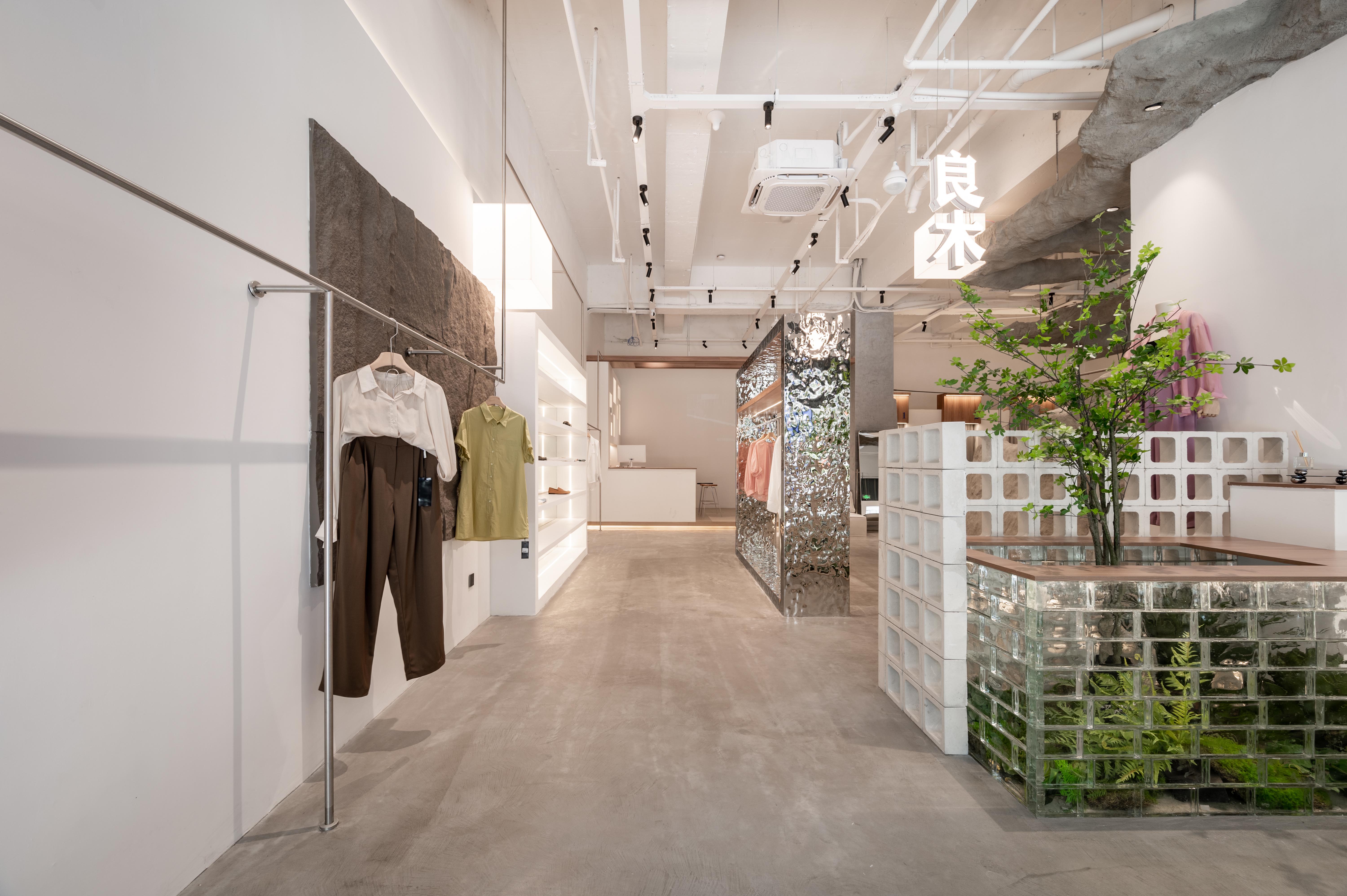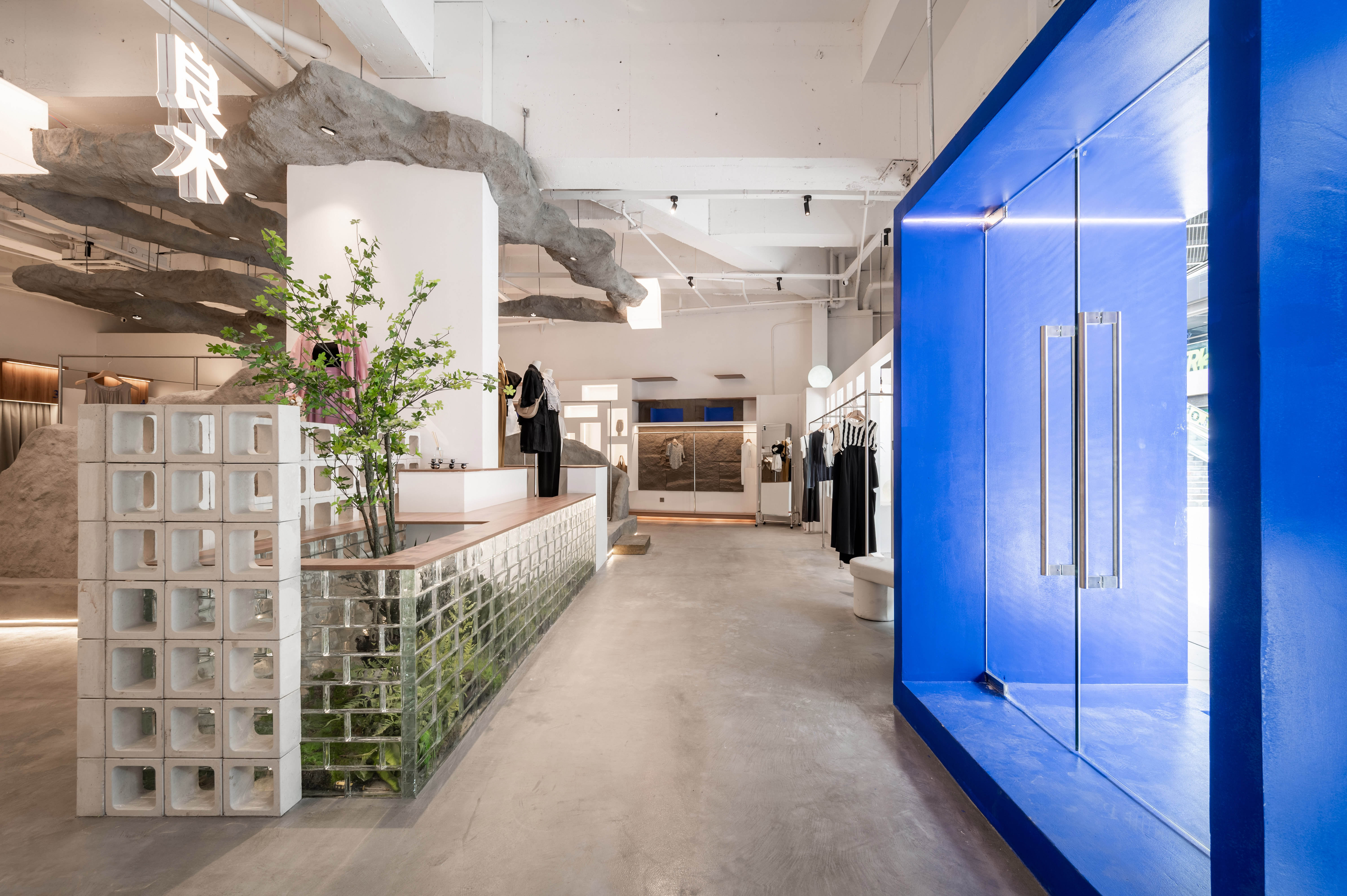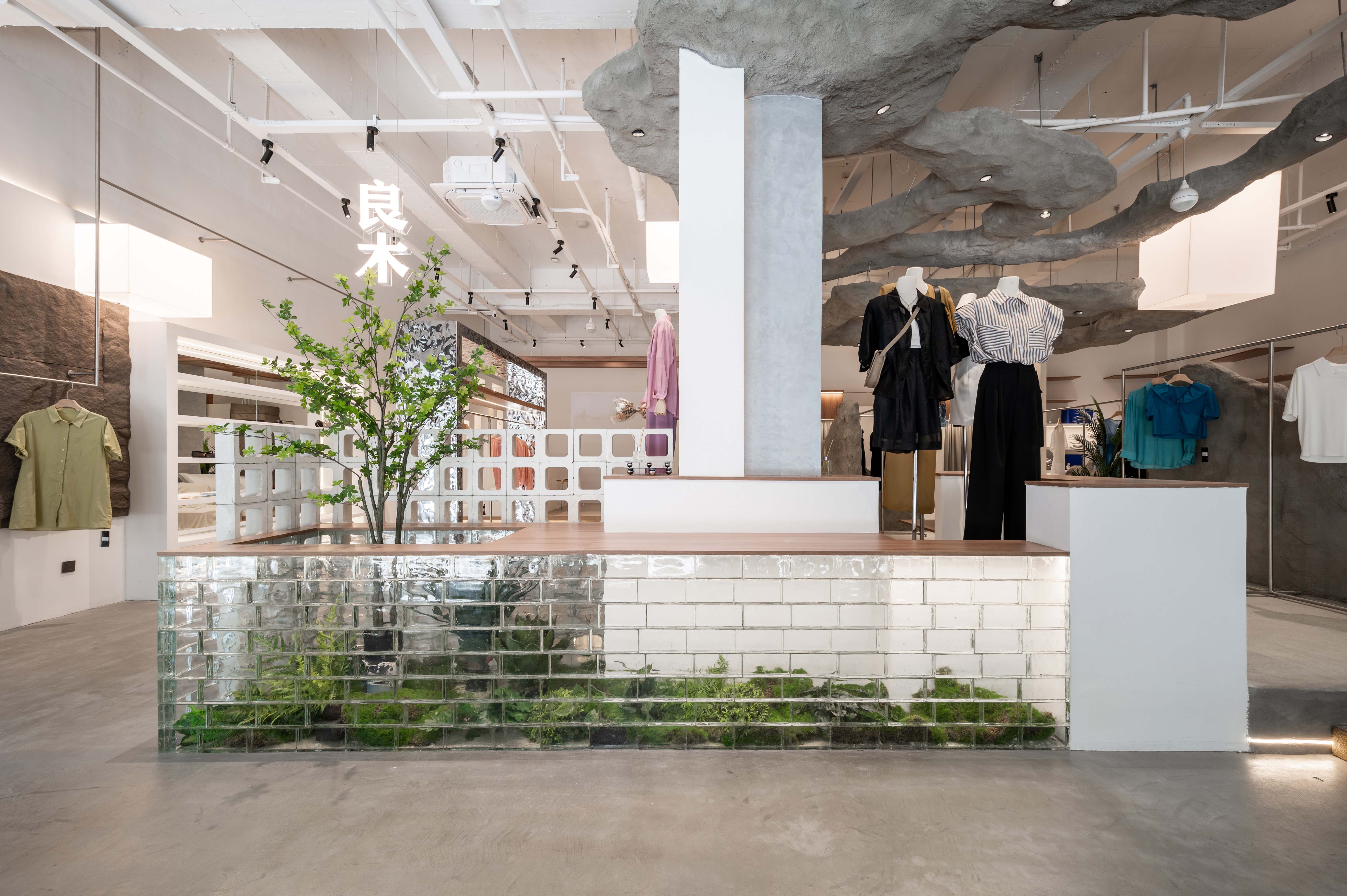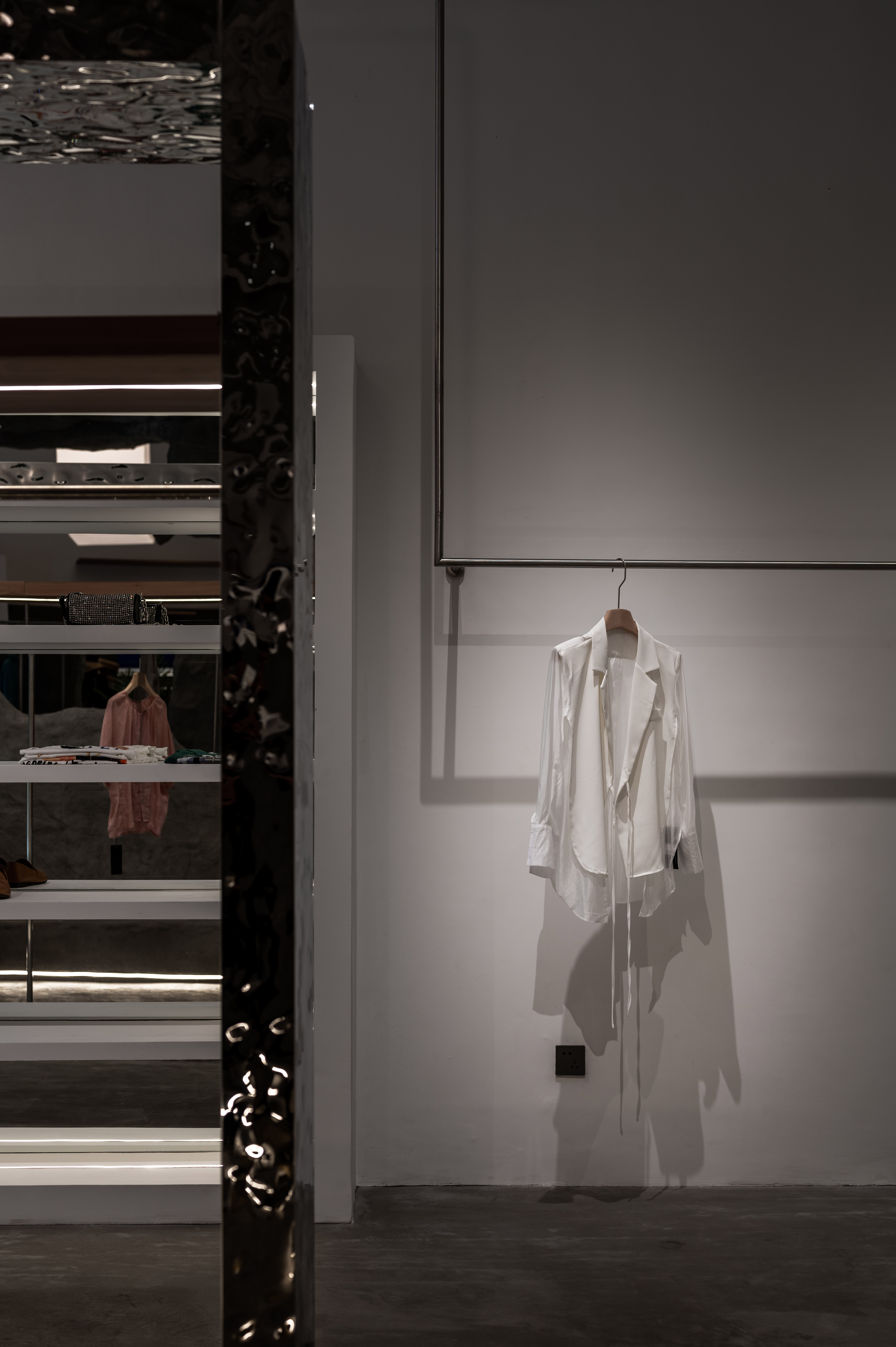 地面是水泥质感,墙面顶面白色大面积的弱化,自然,简洁,进门左手边的墙上,是一块大石头。 树木,石头,自然,万物,还有服饰,在万物诞生,展示。