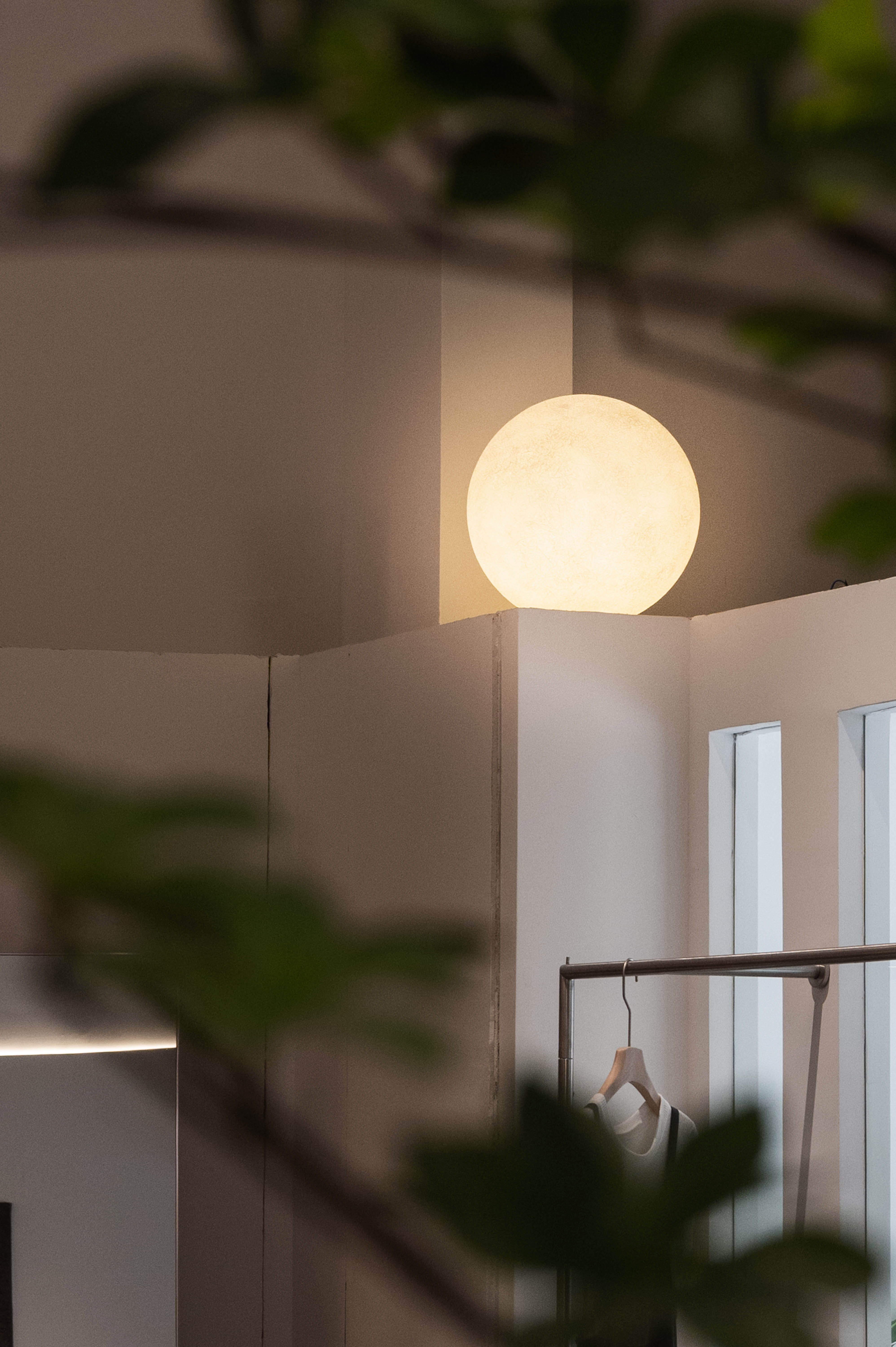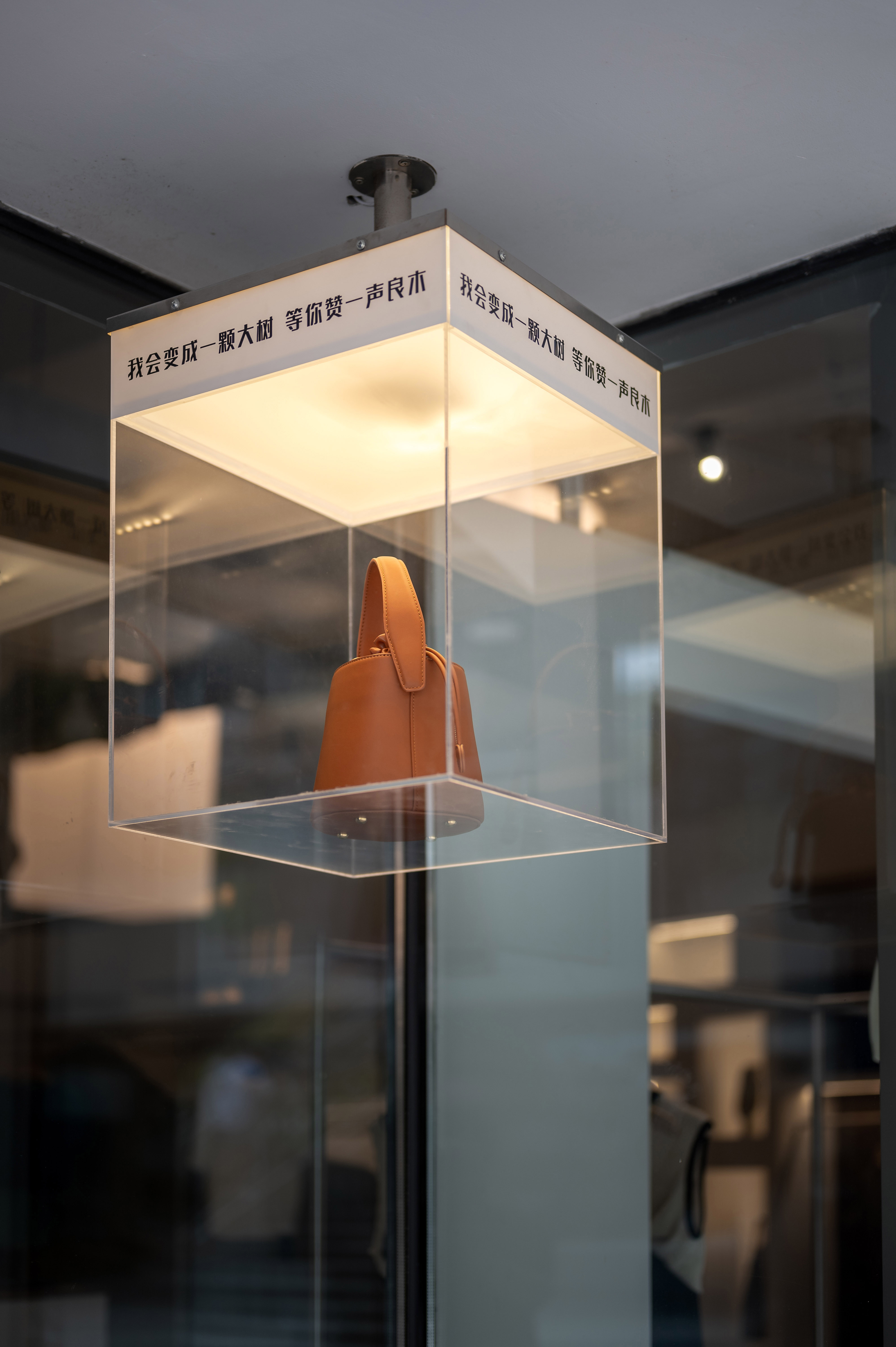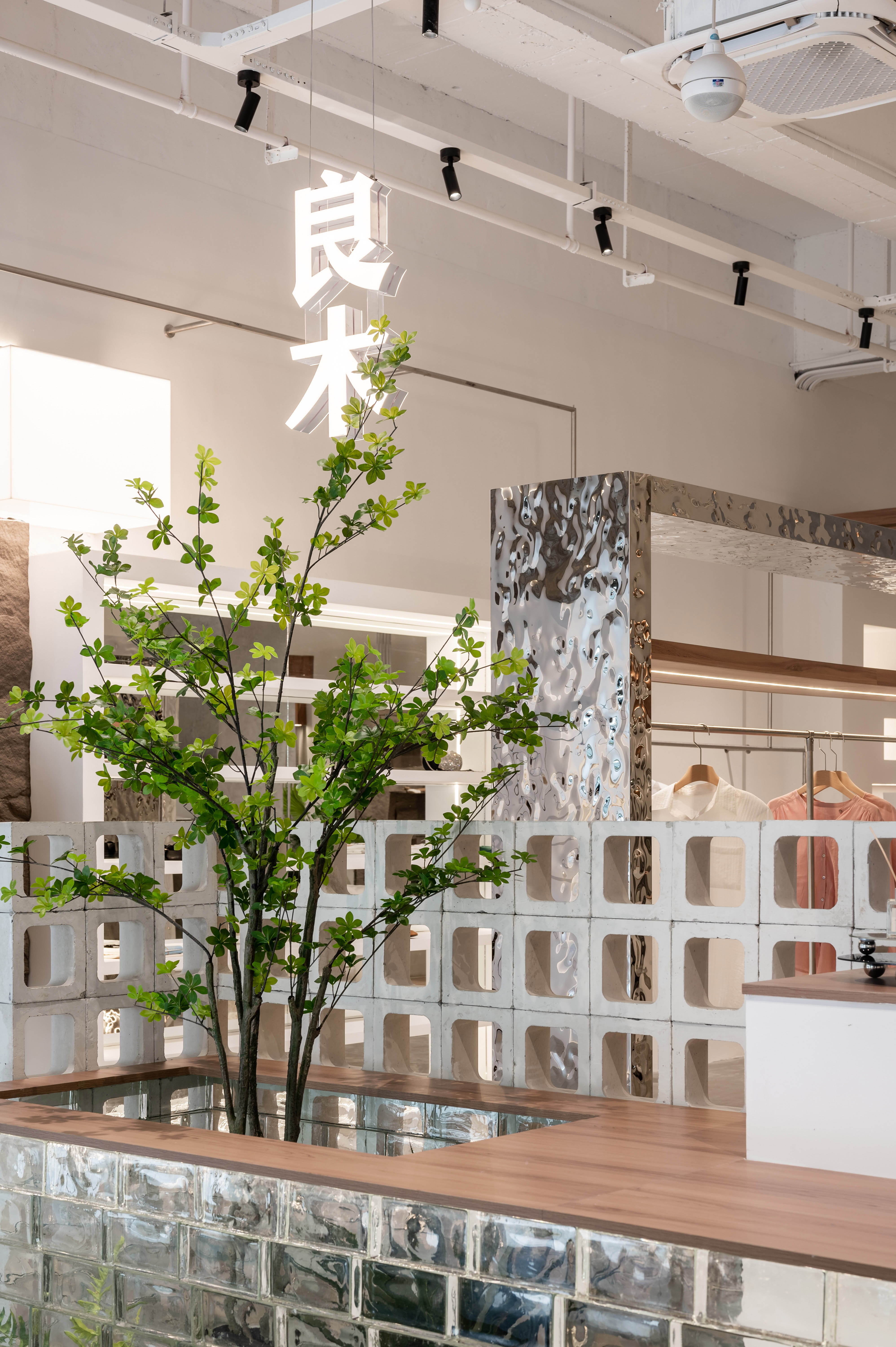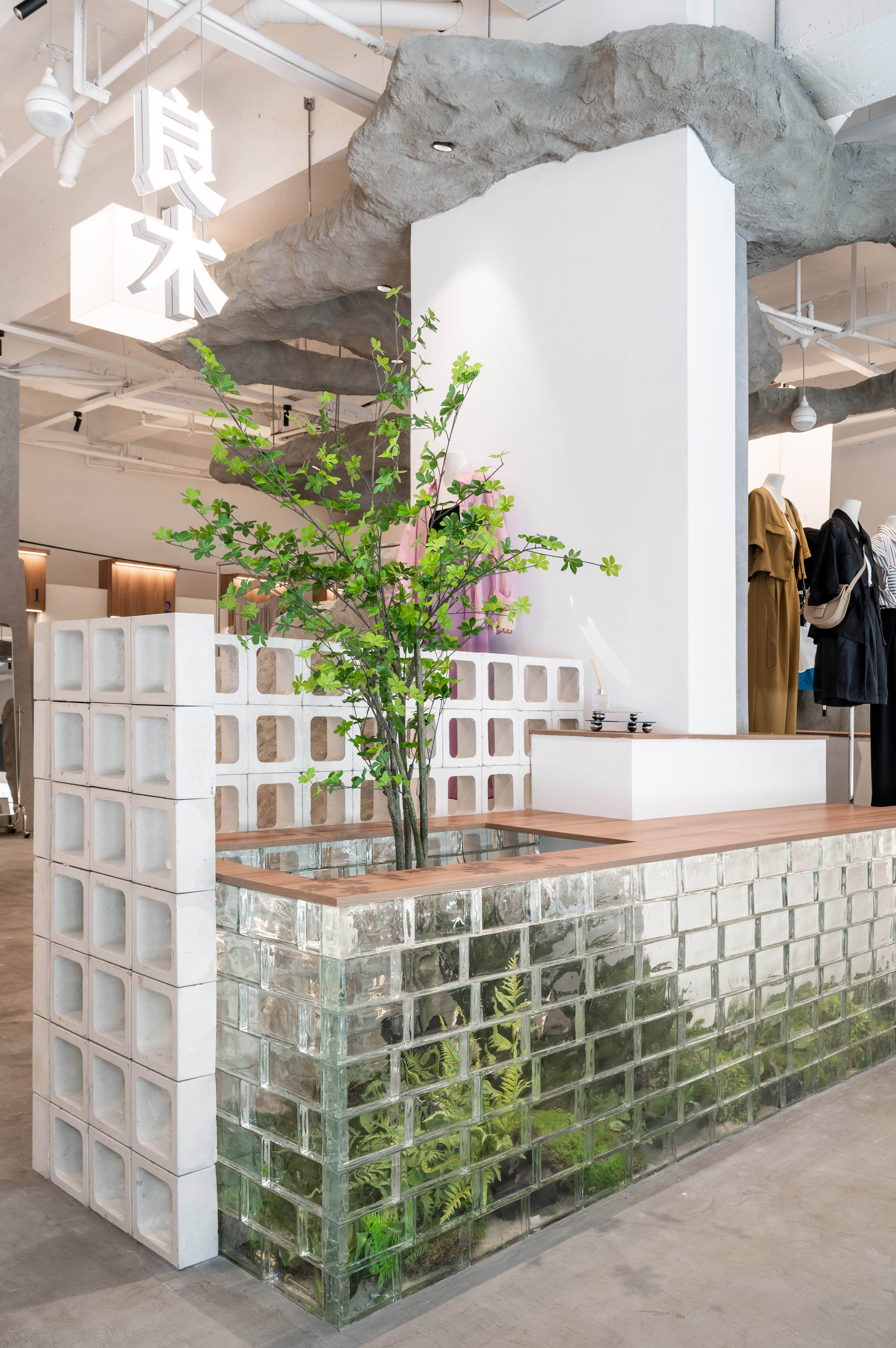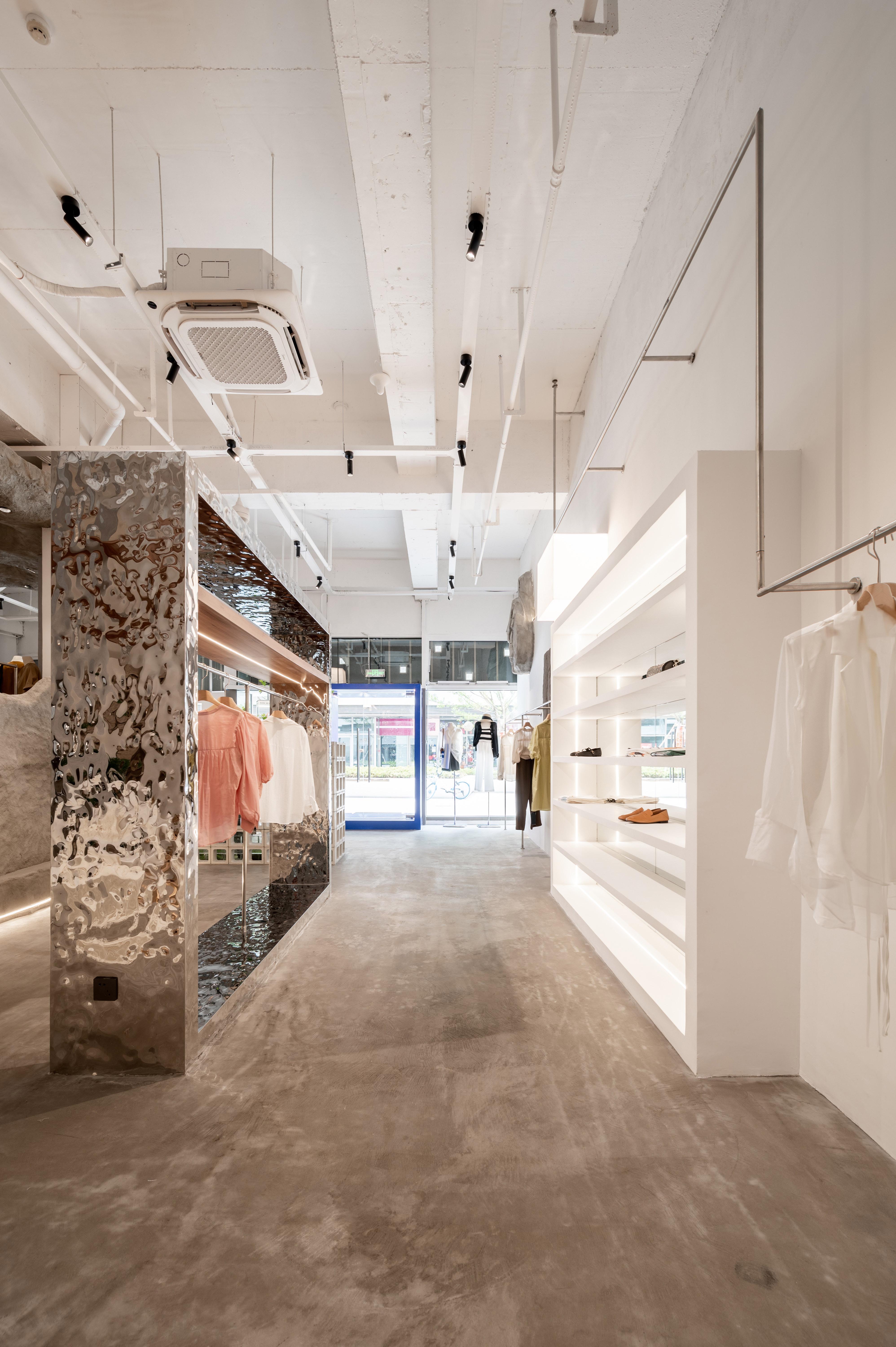 地面是水泥质感,墙面顶面白色大面积的弱化,自然,简洁,进门左手边的墙上,是一块大石头。 树木,石头,自然,万物,还有服饰,在万物诞生,展示。