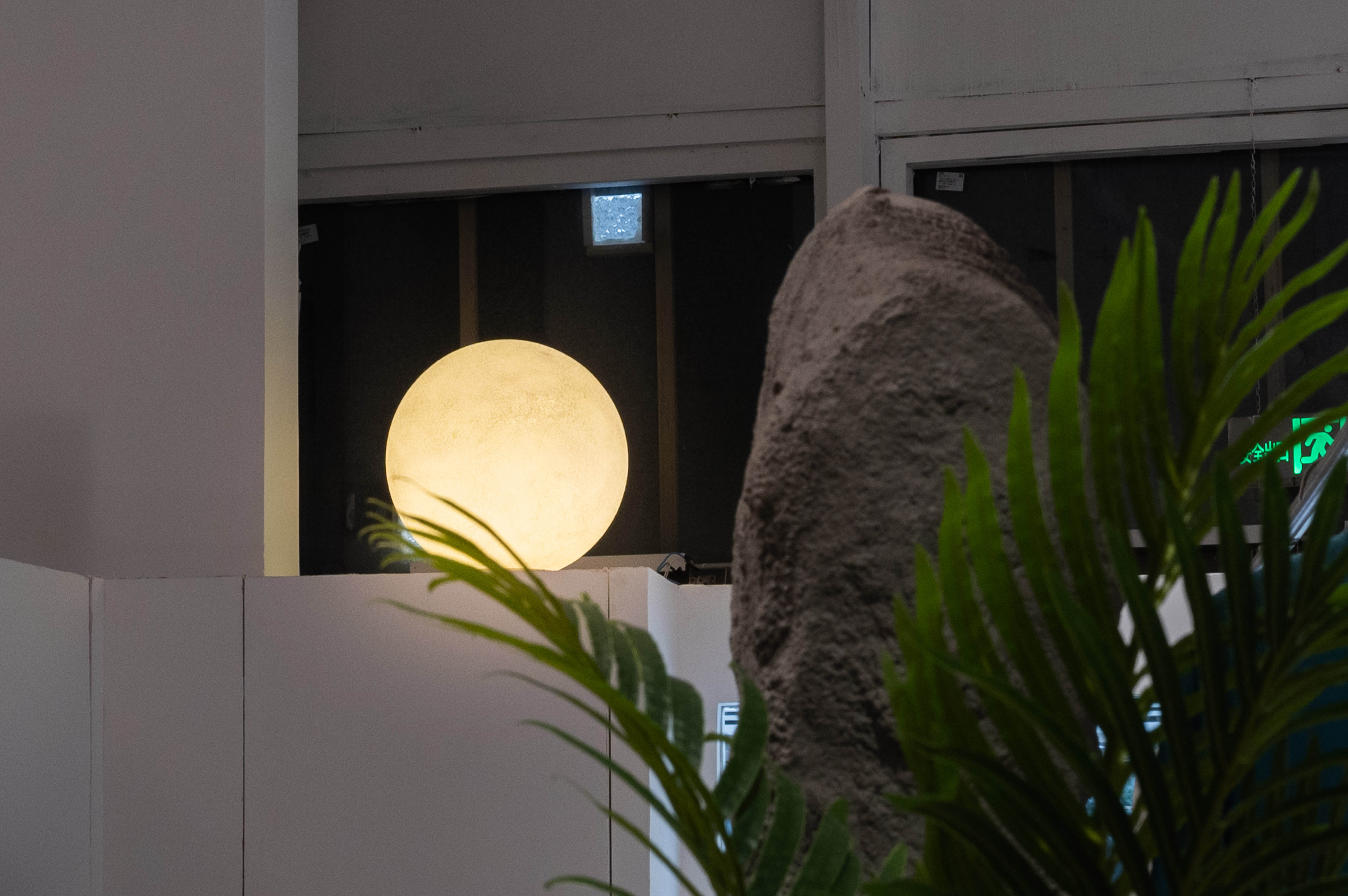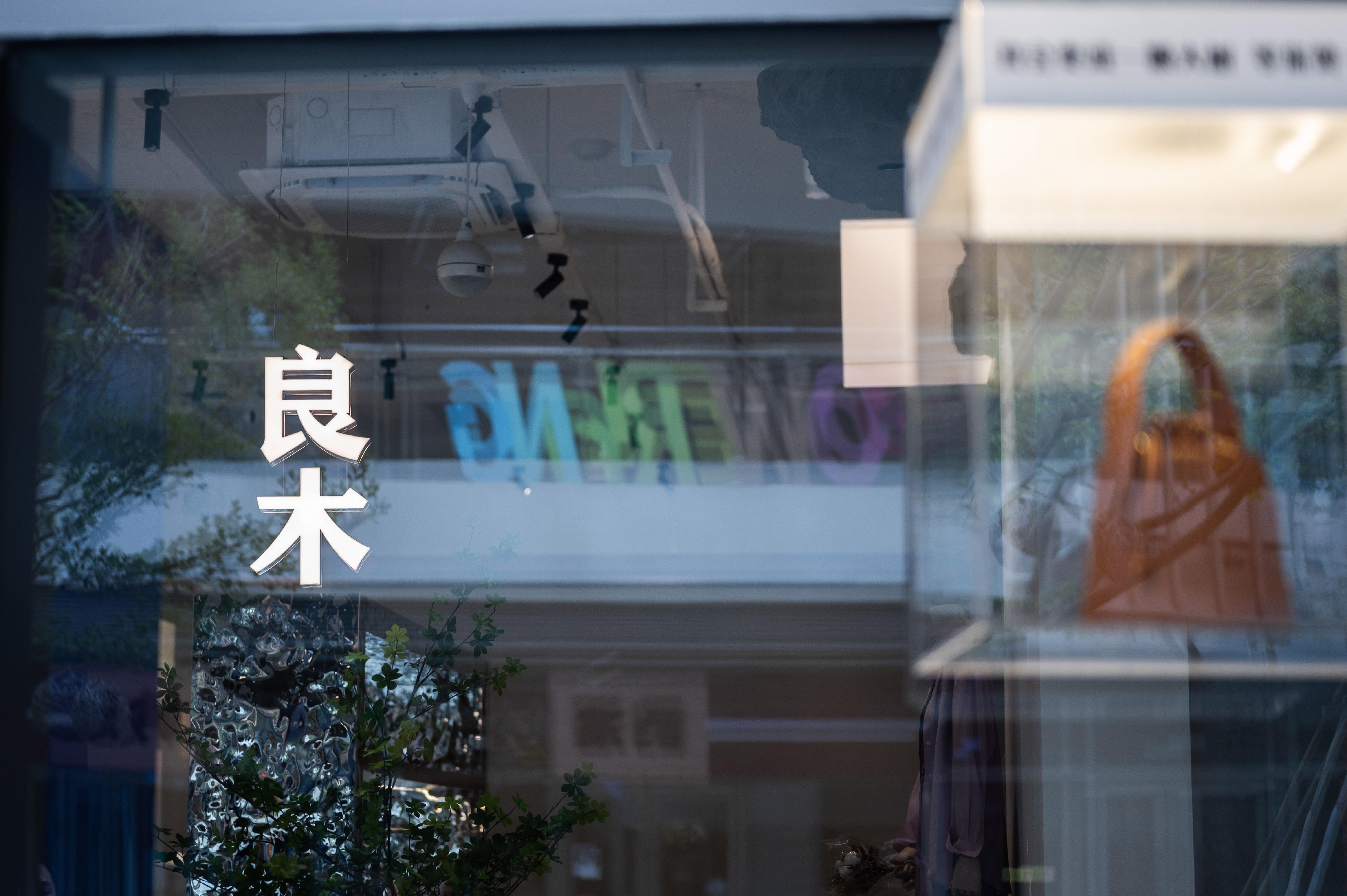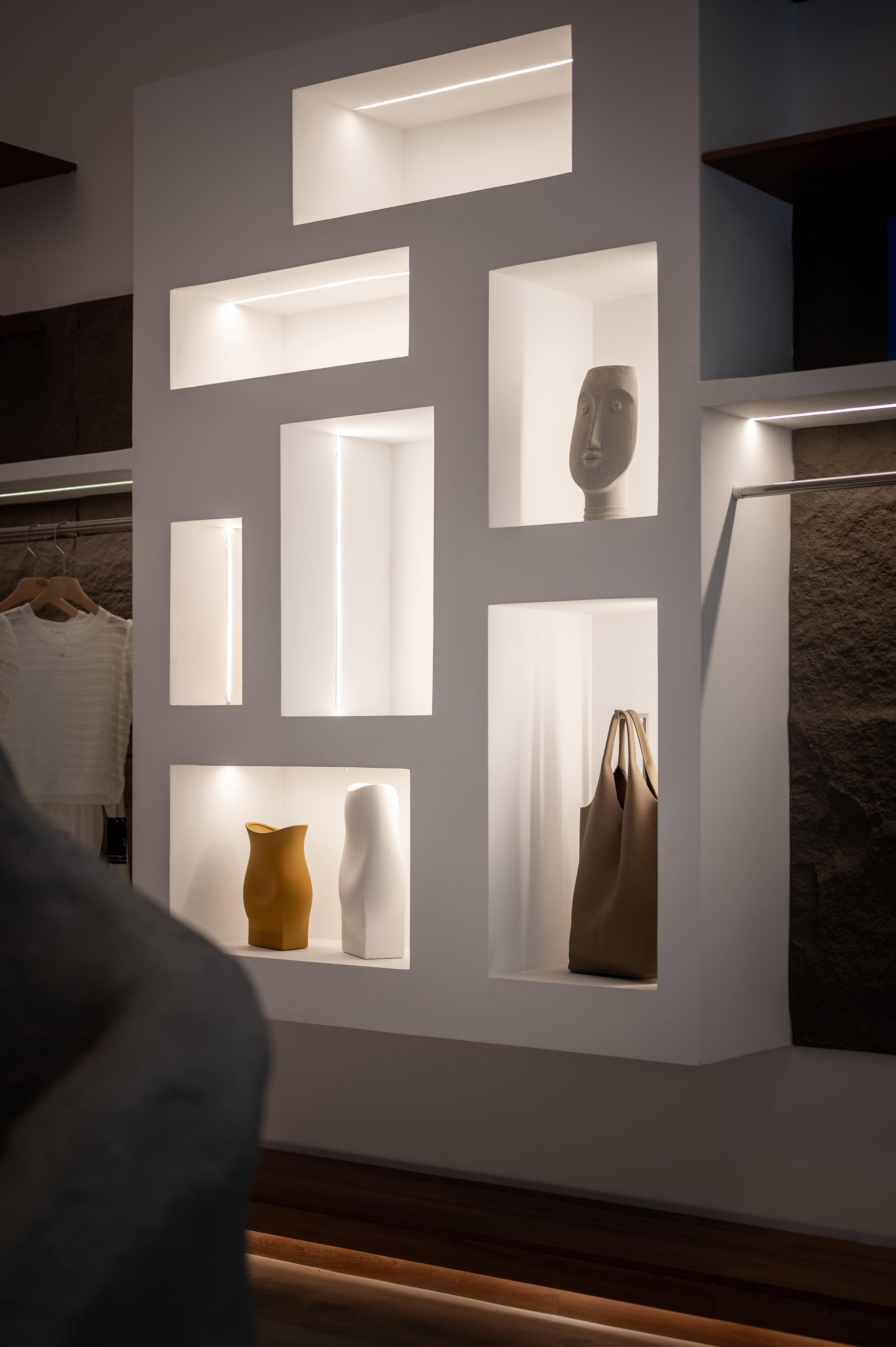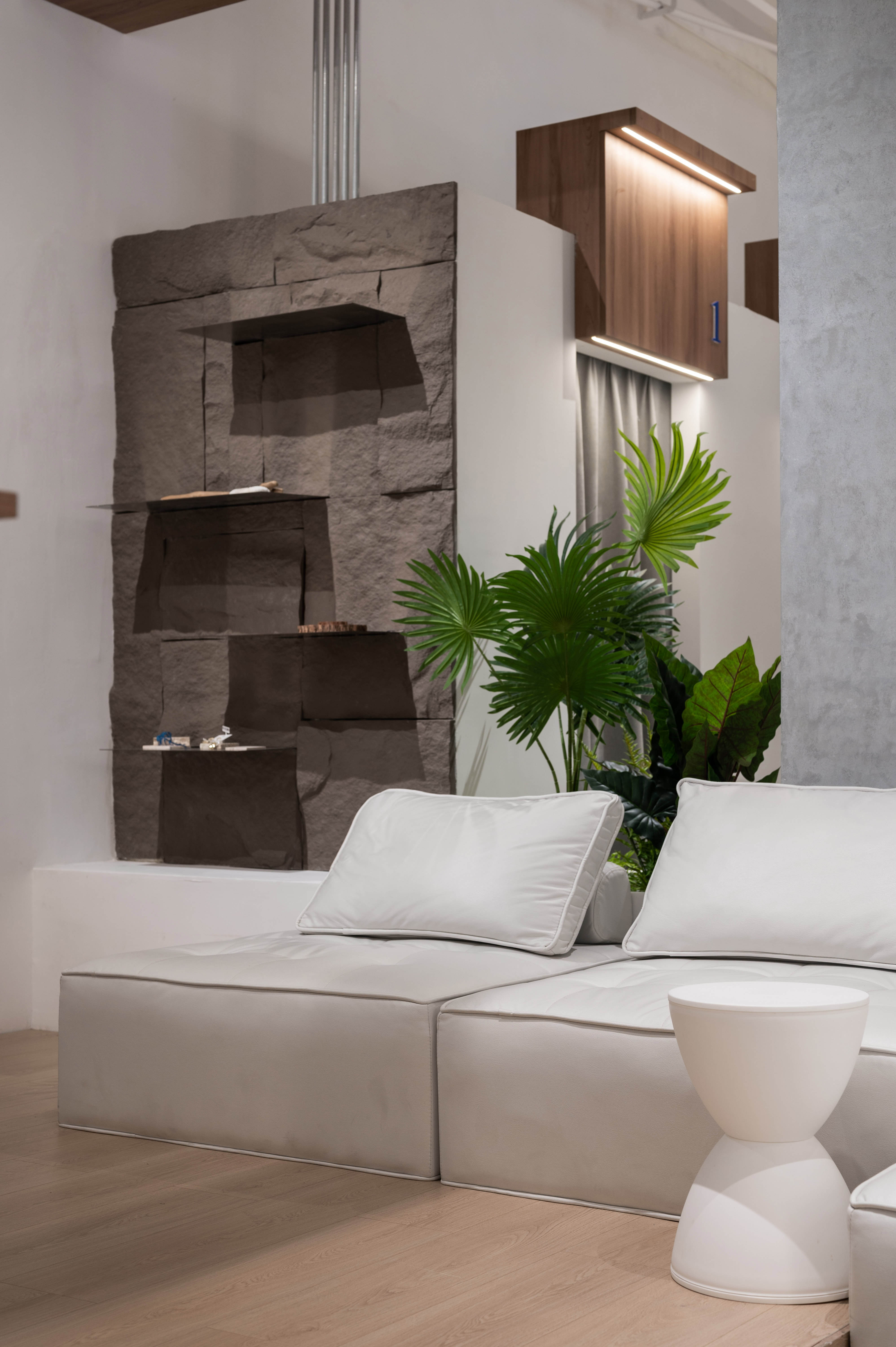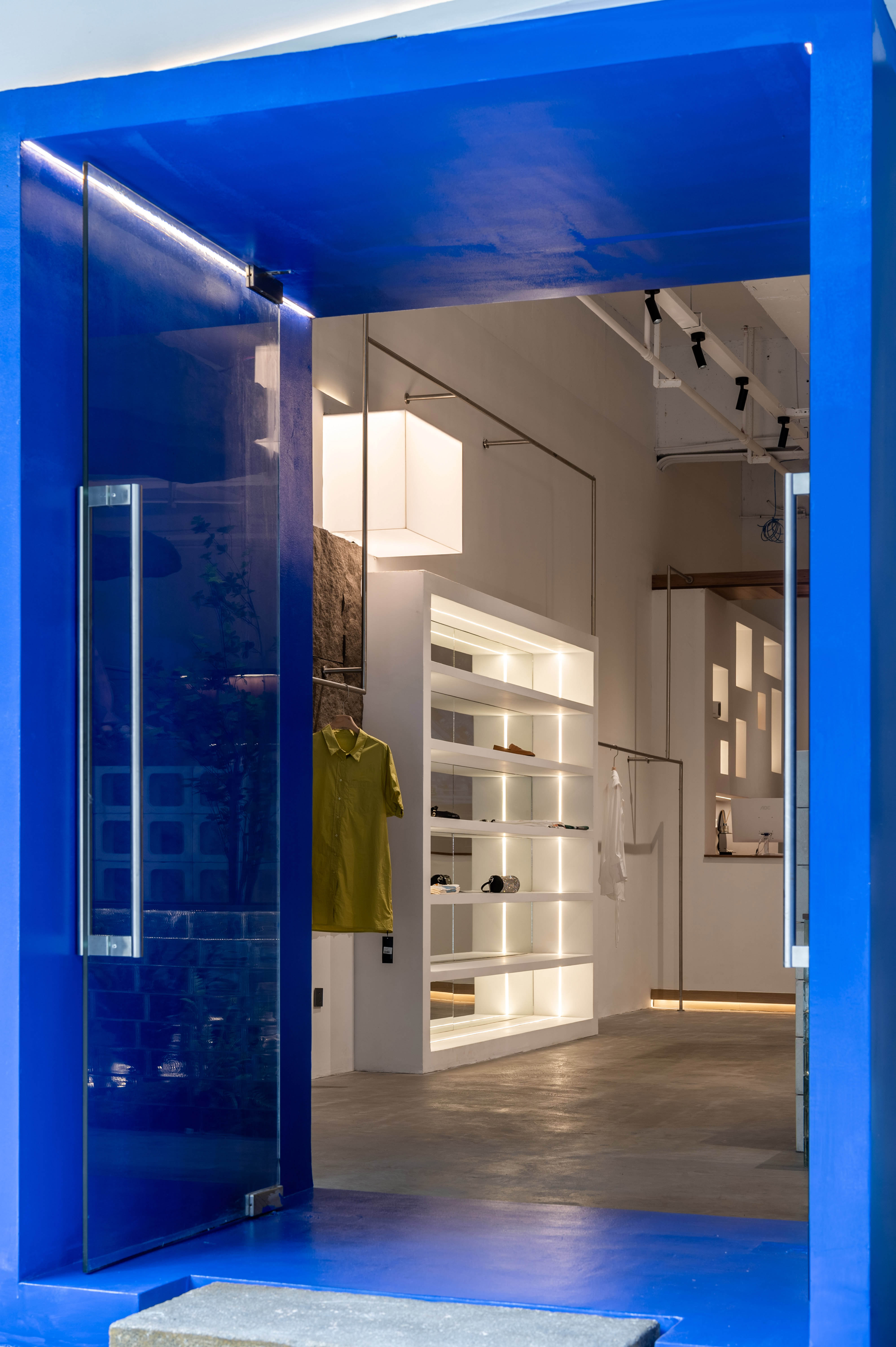地面是水泥质感,墙面顶面白色大面积的弱化,自然,简洁,进门左手边的墙上,是一块大石头。 树木,石头,自然,万物,还有服饰,在万物诞生,展示。