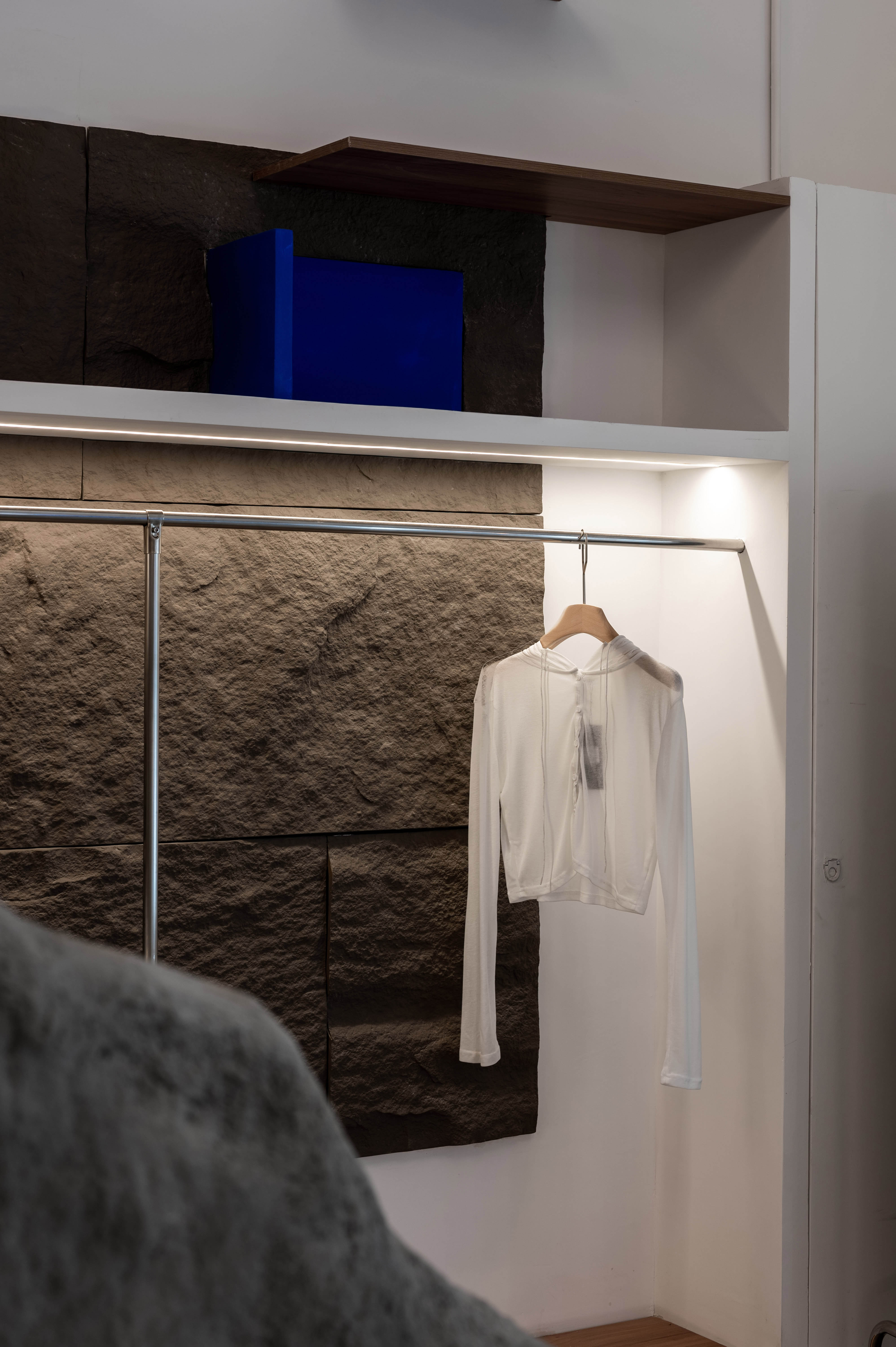 整体挂衣杆的区域内做了组柜子,内部的镜面反射着柜子内的物品以及灯光的线条感。