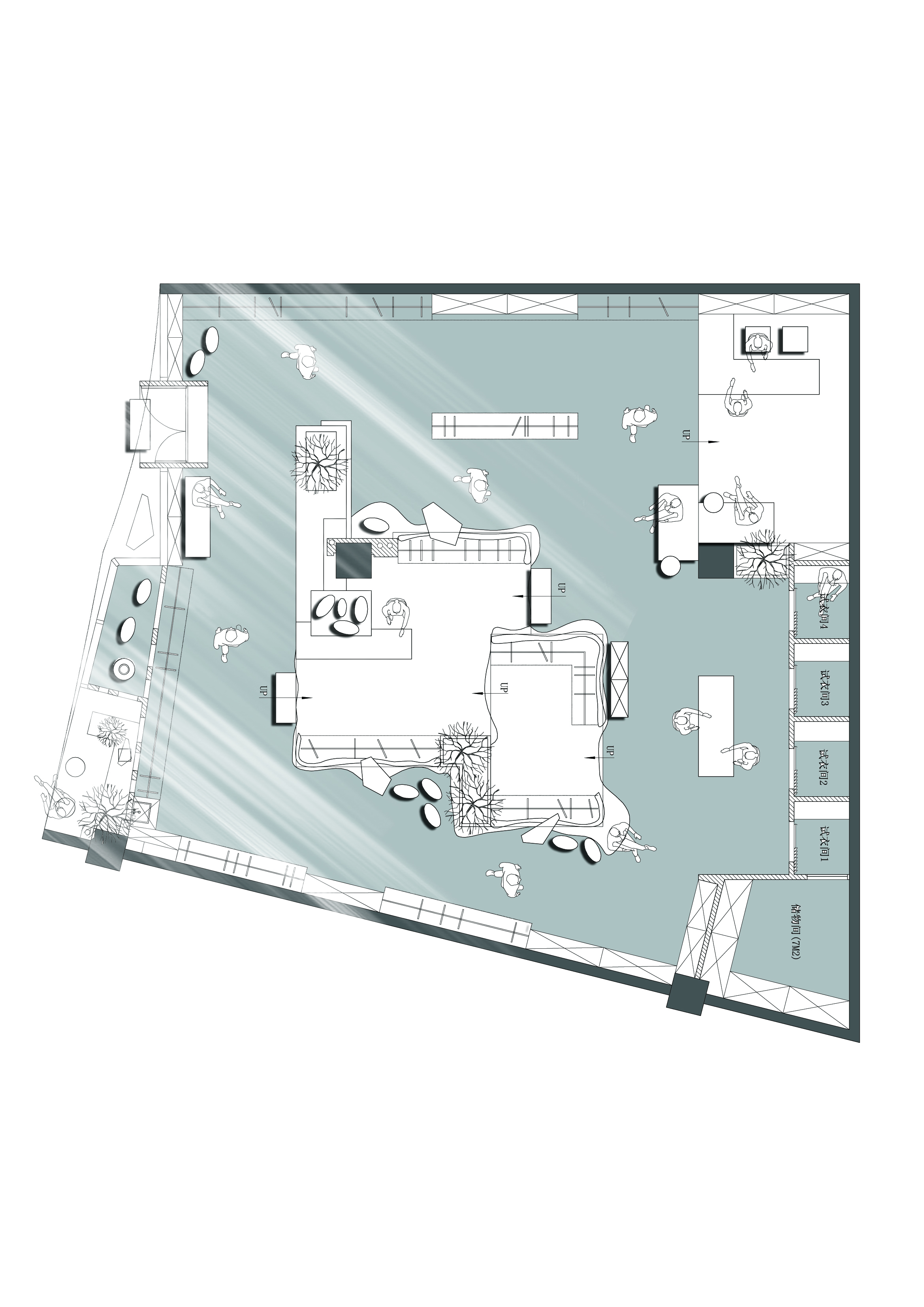 空间布局:格局上做了循环动线,围绕着中间的洞穴空间而来