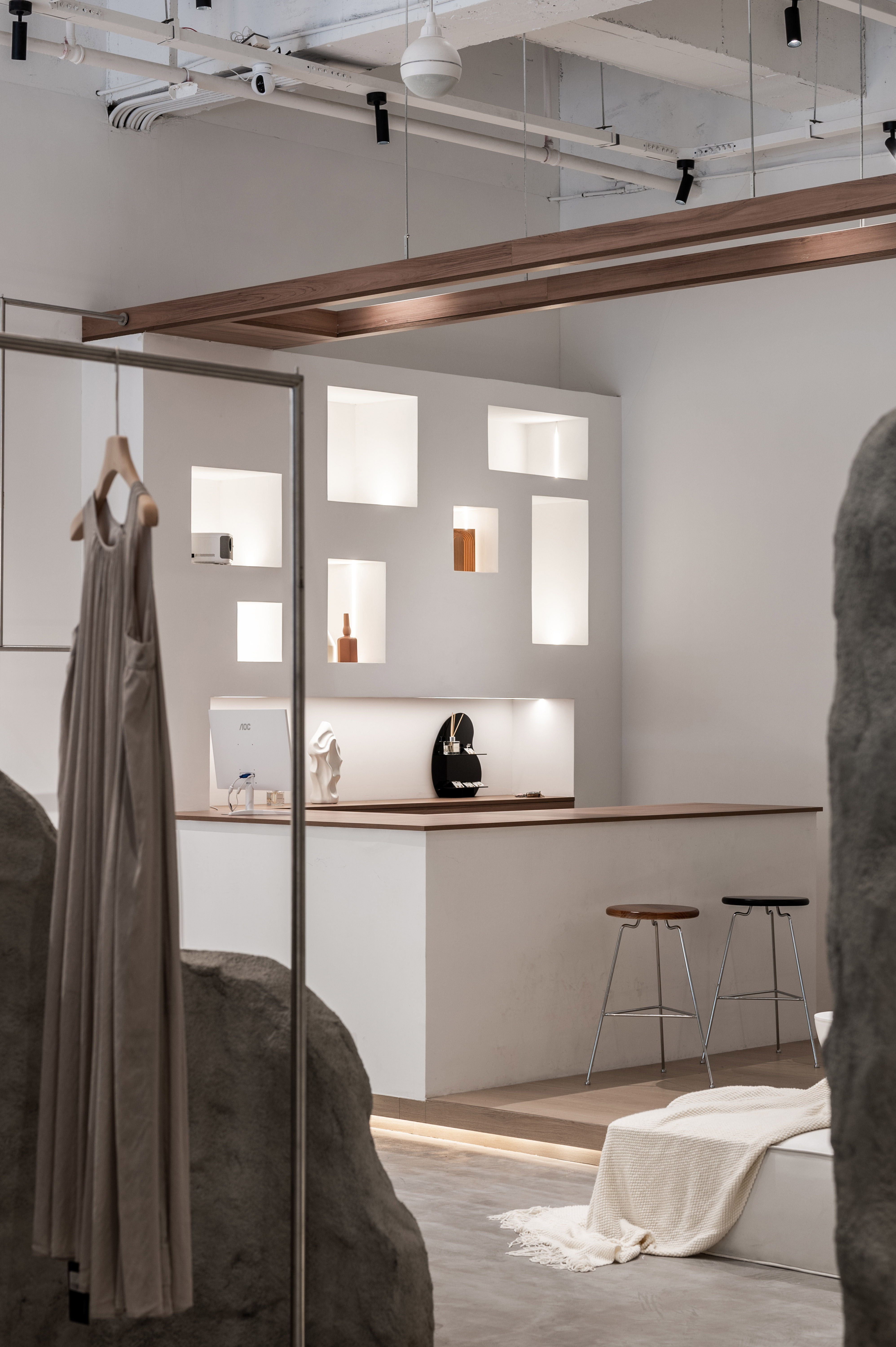 整个服装店靠内墙区域分三个功能区,收银台,试衣间,储物间,收银台区域也做了地面抬高,形成一个独立空间,跟洞穴区域一样的思路,只是用了木头的材质,形成冷暖对比。