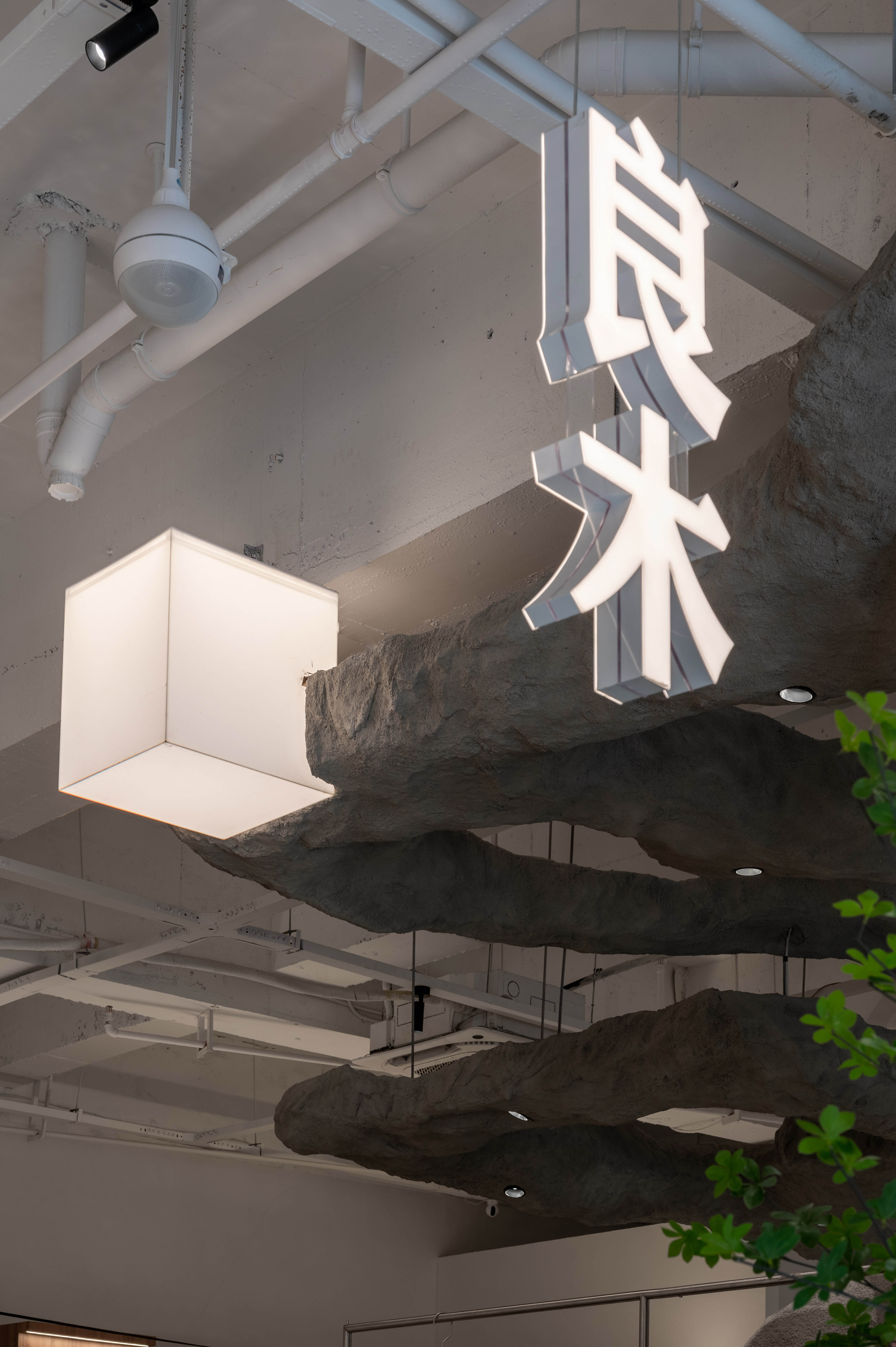 进门看到的是一个大的体块,由好几个高低不平的岛台组成,正对门大的岛台由玻璃砖围合而成,里面植入很多的绿植,造景给进门的一个视觉焦点的营造,进门的大树,上面悬吊着良木,来开启这场旅行。
