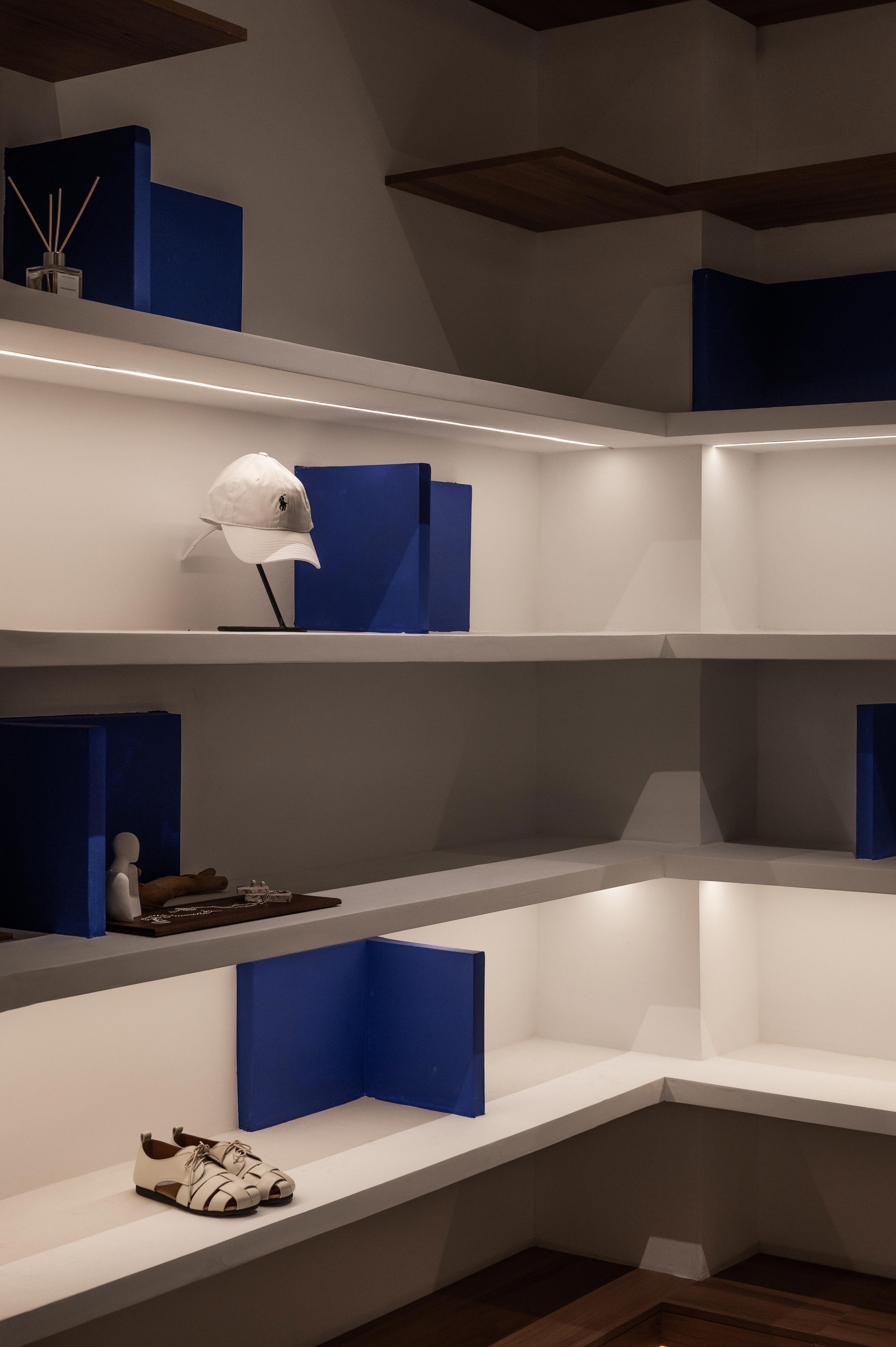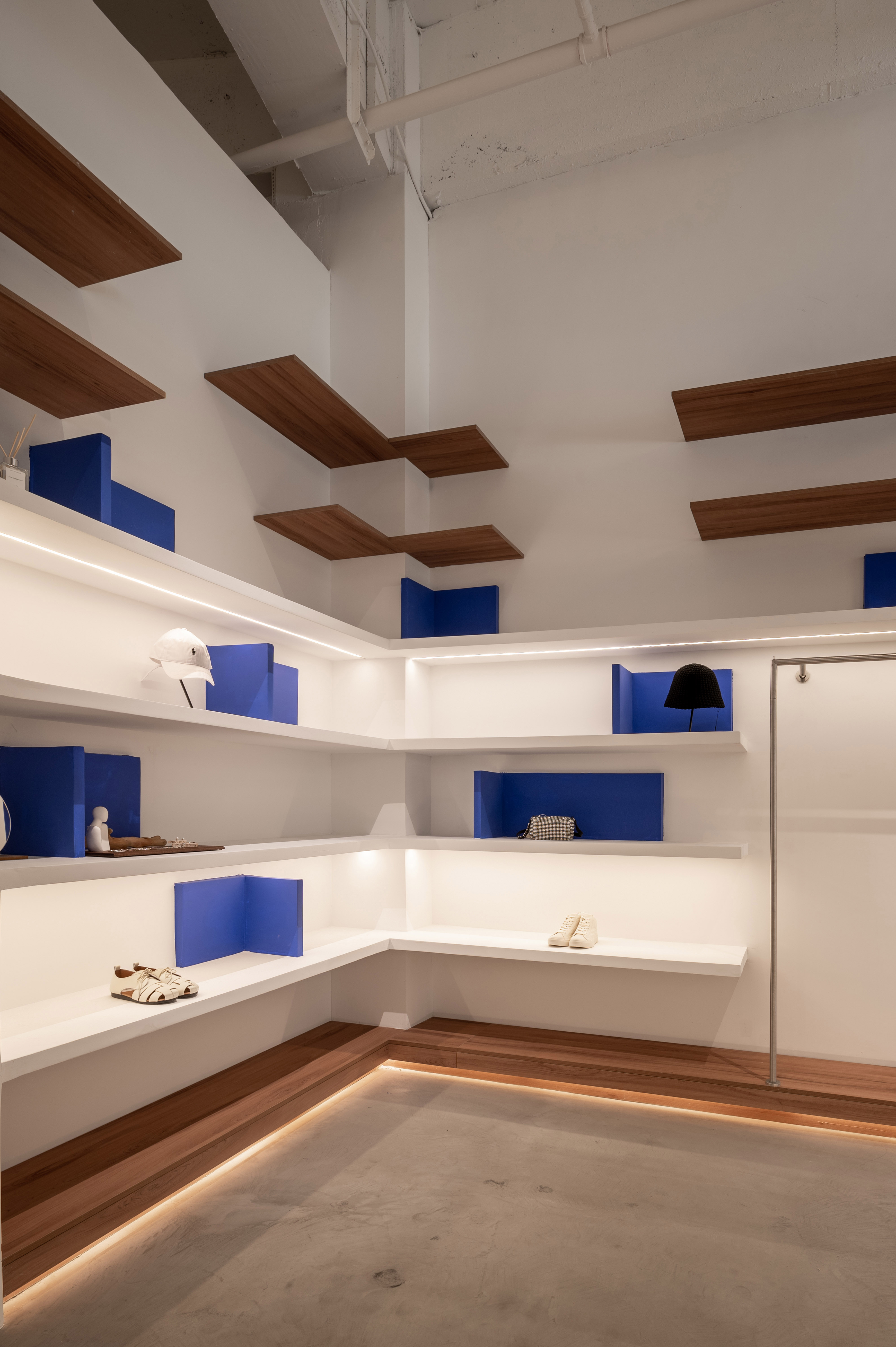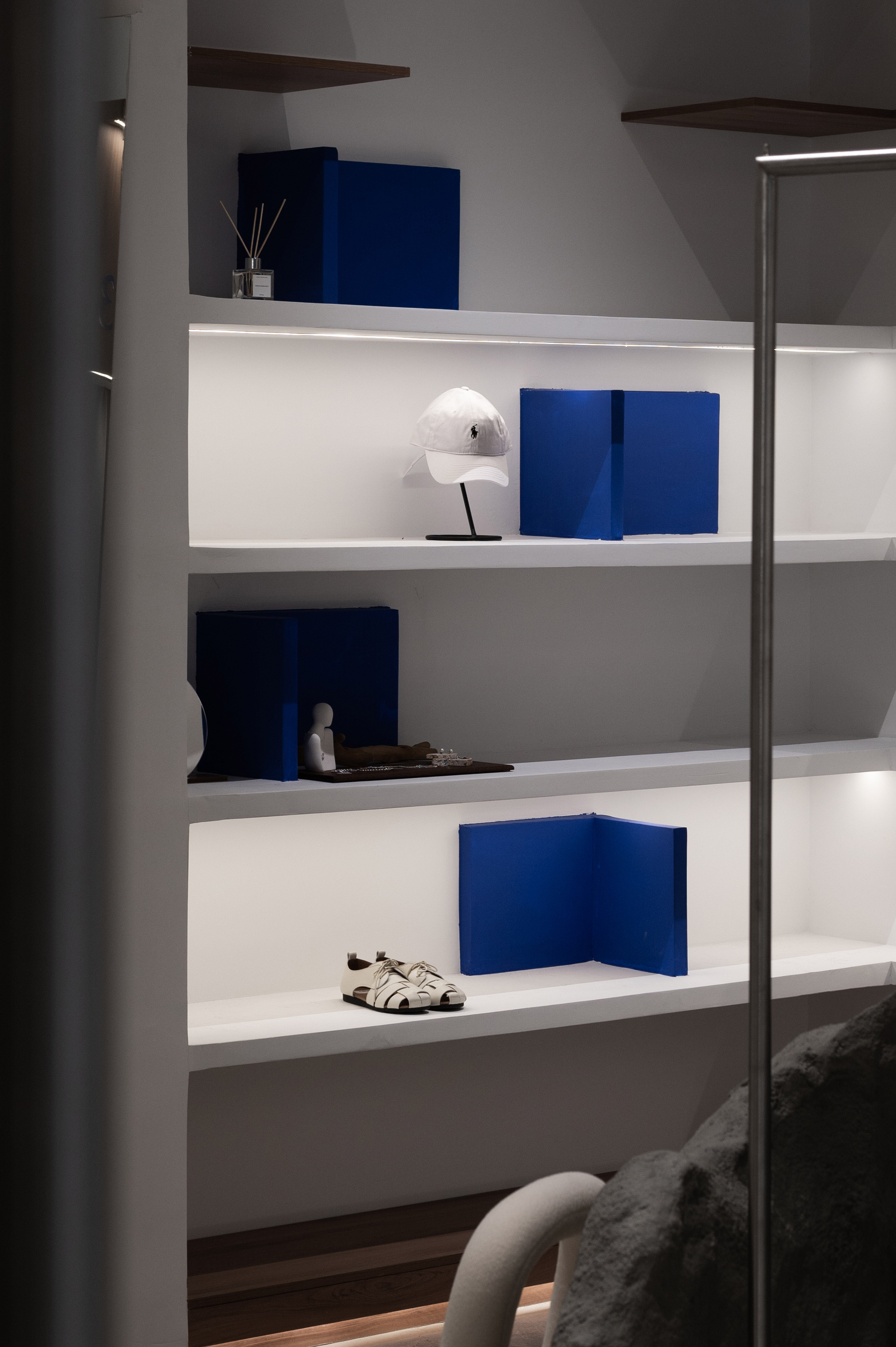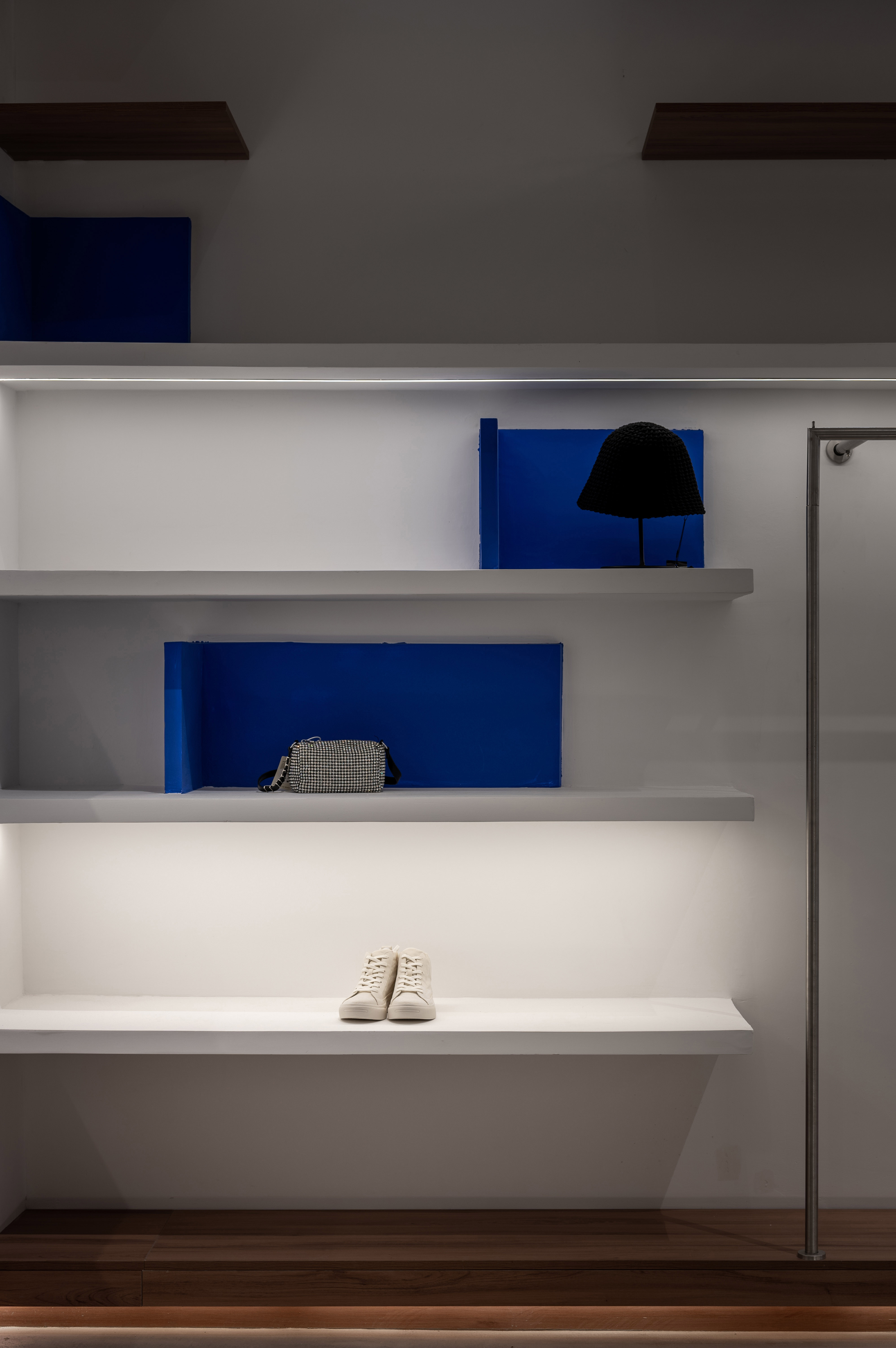 更衣间的外面,是一些层板跟挂衣杆的组合墙,因为高度的原因,也是做了部分层板在比较高的位置,也可以出样产品或者展示饰品,不让高度浪费,充分利用优势,然后也做了部分克莱因蓝的跳色在几个围合的板上。