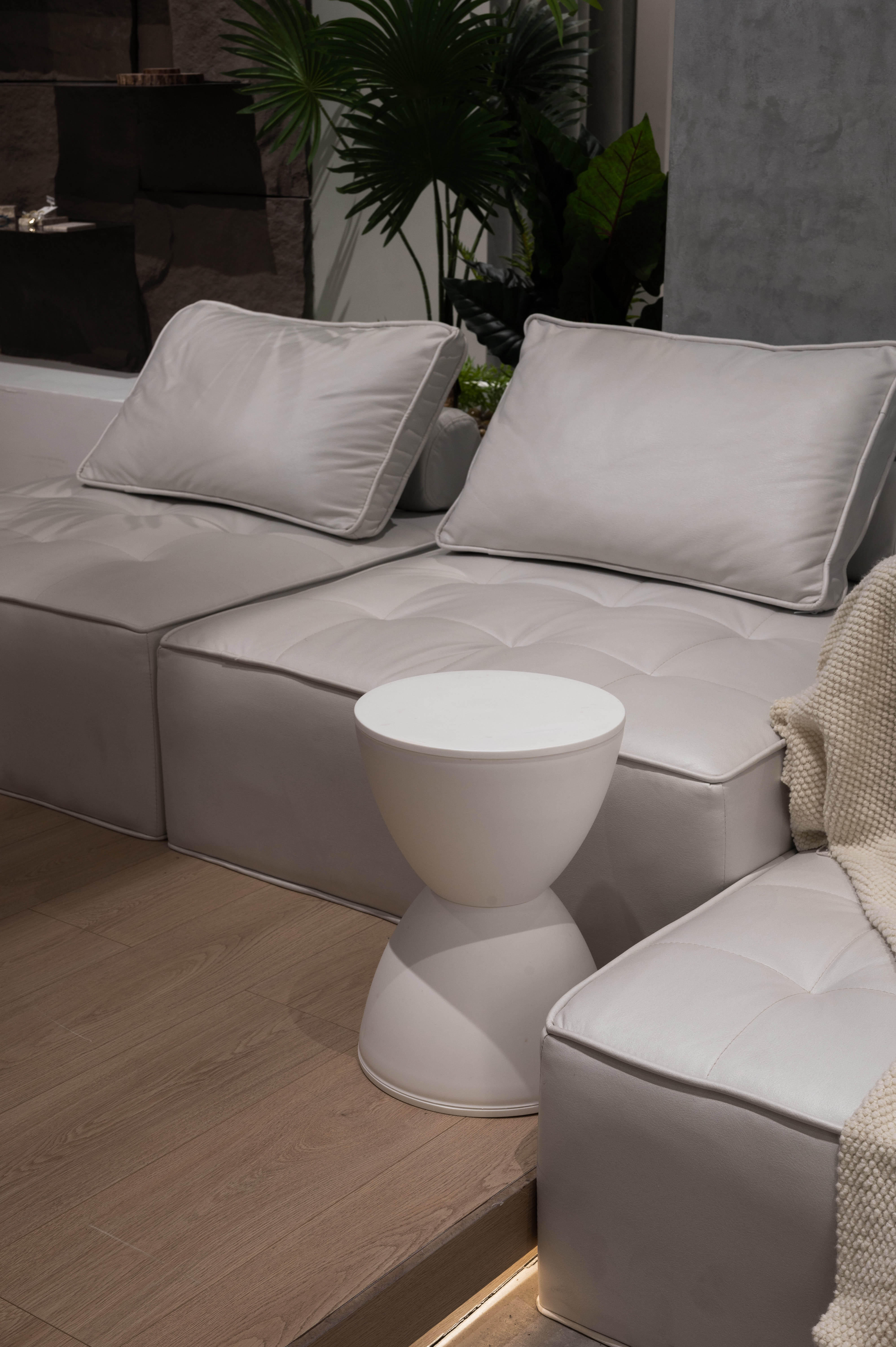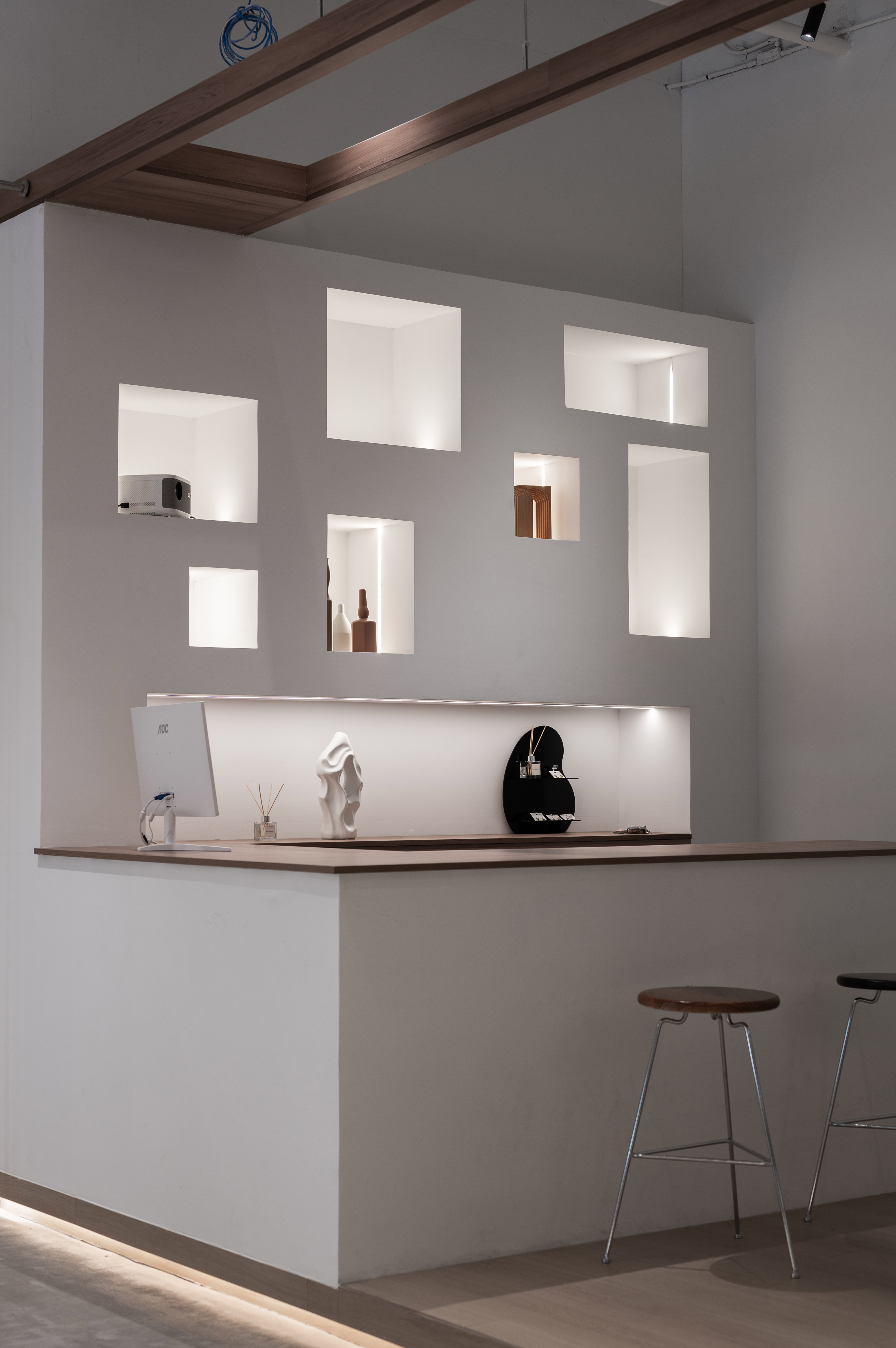 收银台后背是一个个的壁龛,放着一些饰品,收银台也兼顾了休闲的功能,两个豆腐沙发供人休息。