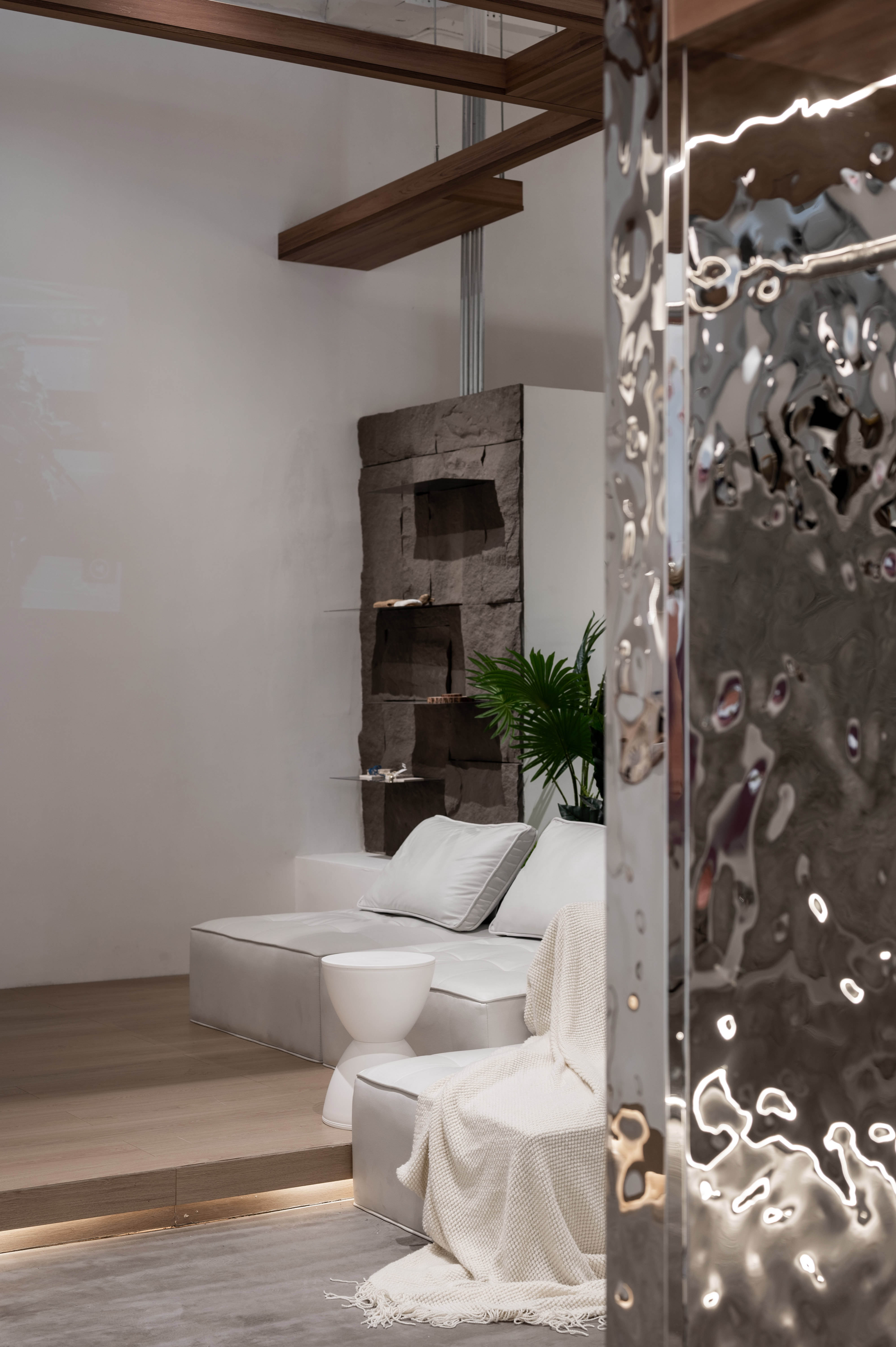 整个洞穴区域分两个地面高度,呼应的顶上做了打开着的洞穴顶,洞穴顶是开放的,一方面为了实际消防的需要,另一方面保留相对的打开空间的想法,在更高的地台与公共区域的连接上,也是放了一块成品的老石头踏步。