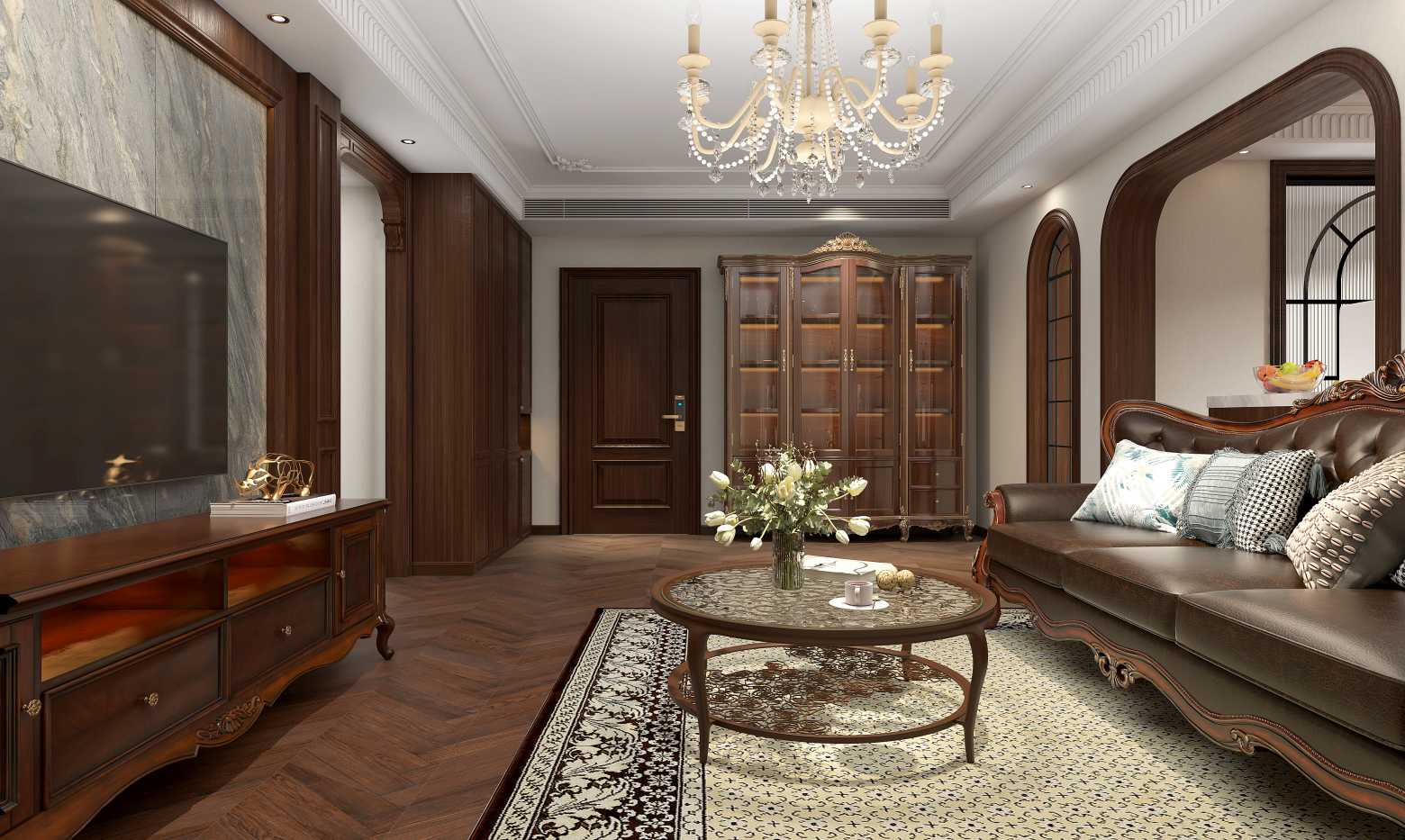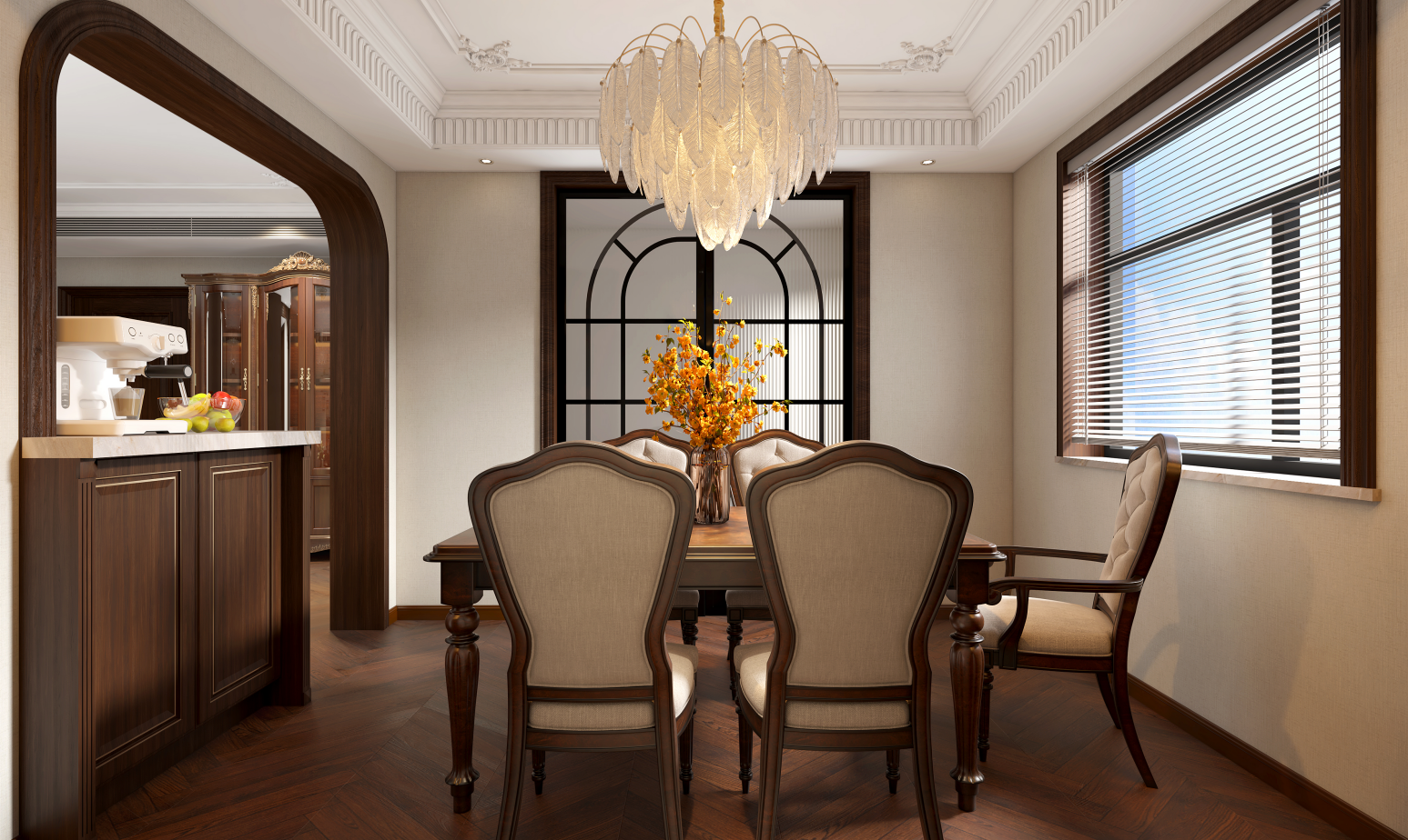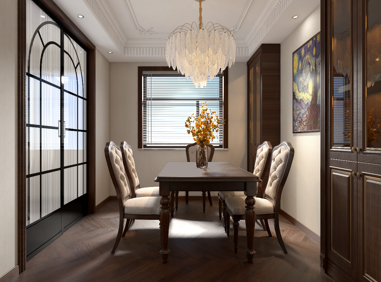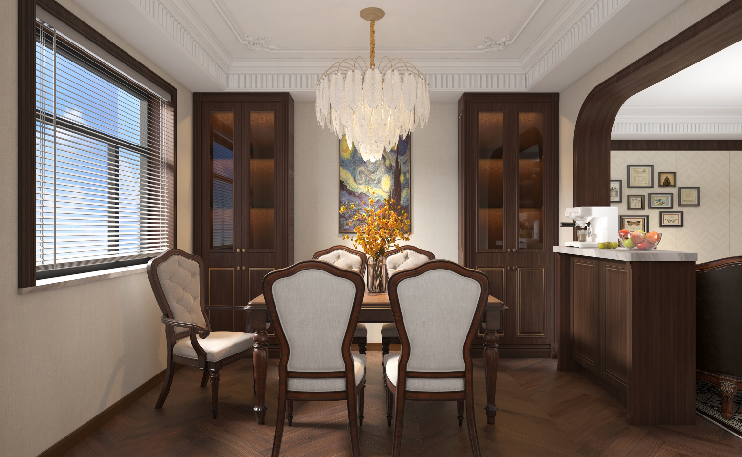 空间意境:整体风格是美式复古风,采用深色实木造型作为基础色,搭配浅色墙布,让整个空间从色彩感观上体现出层次感。