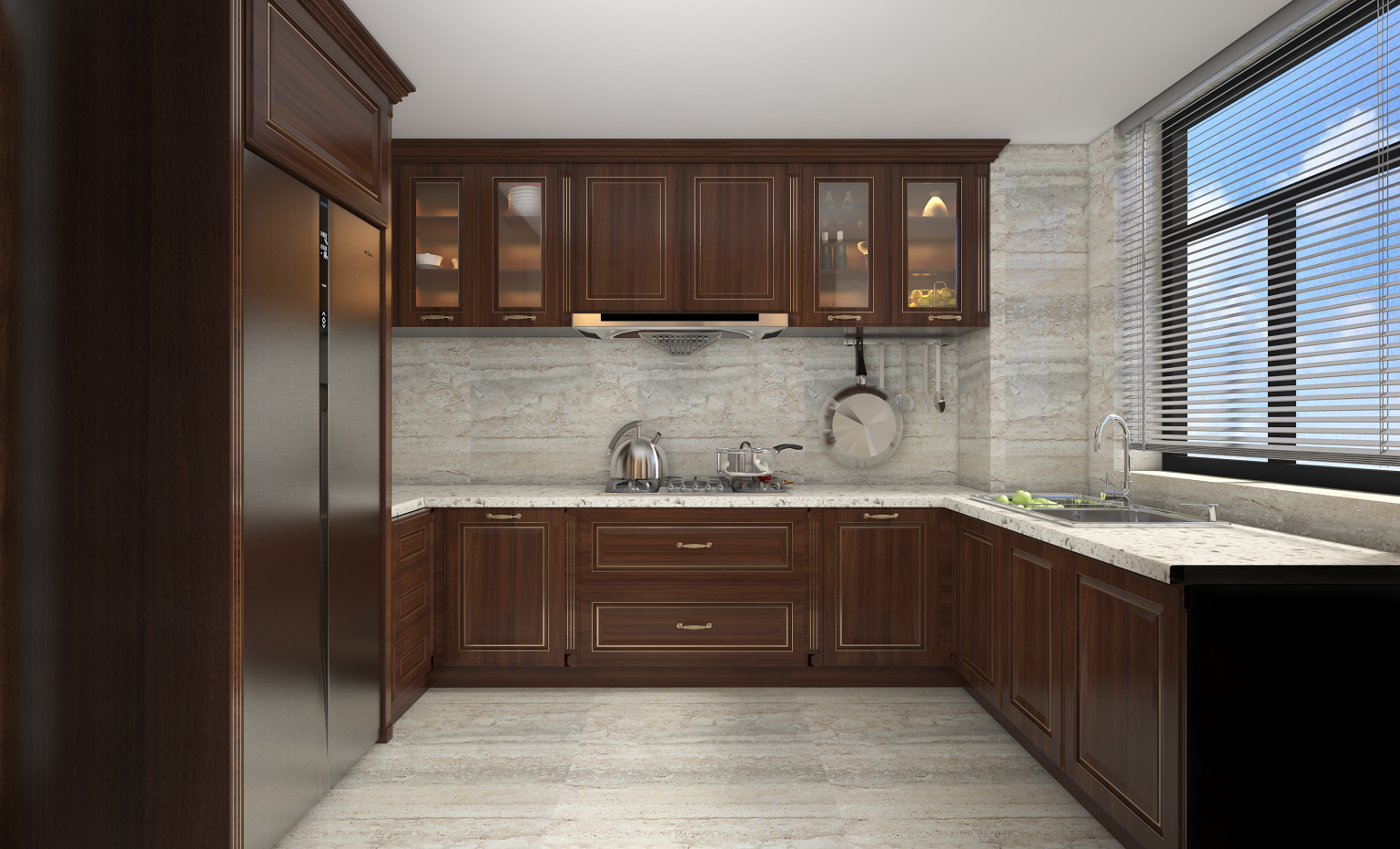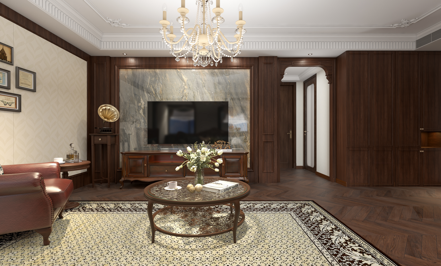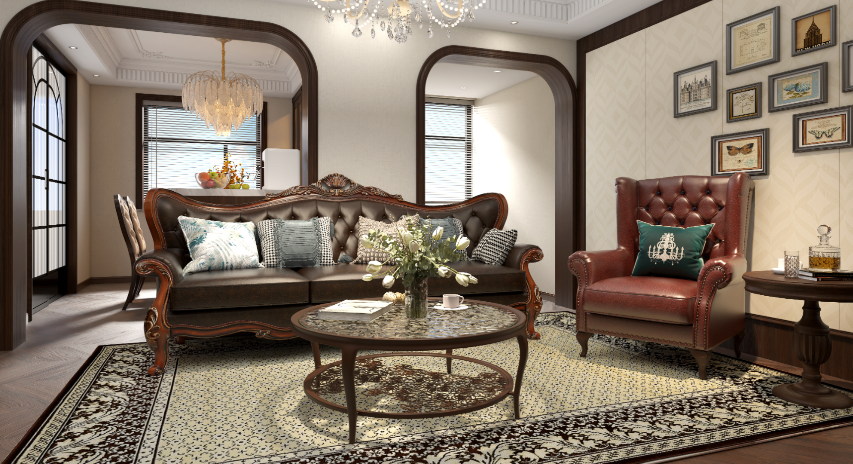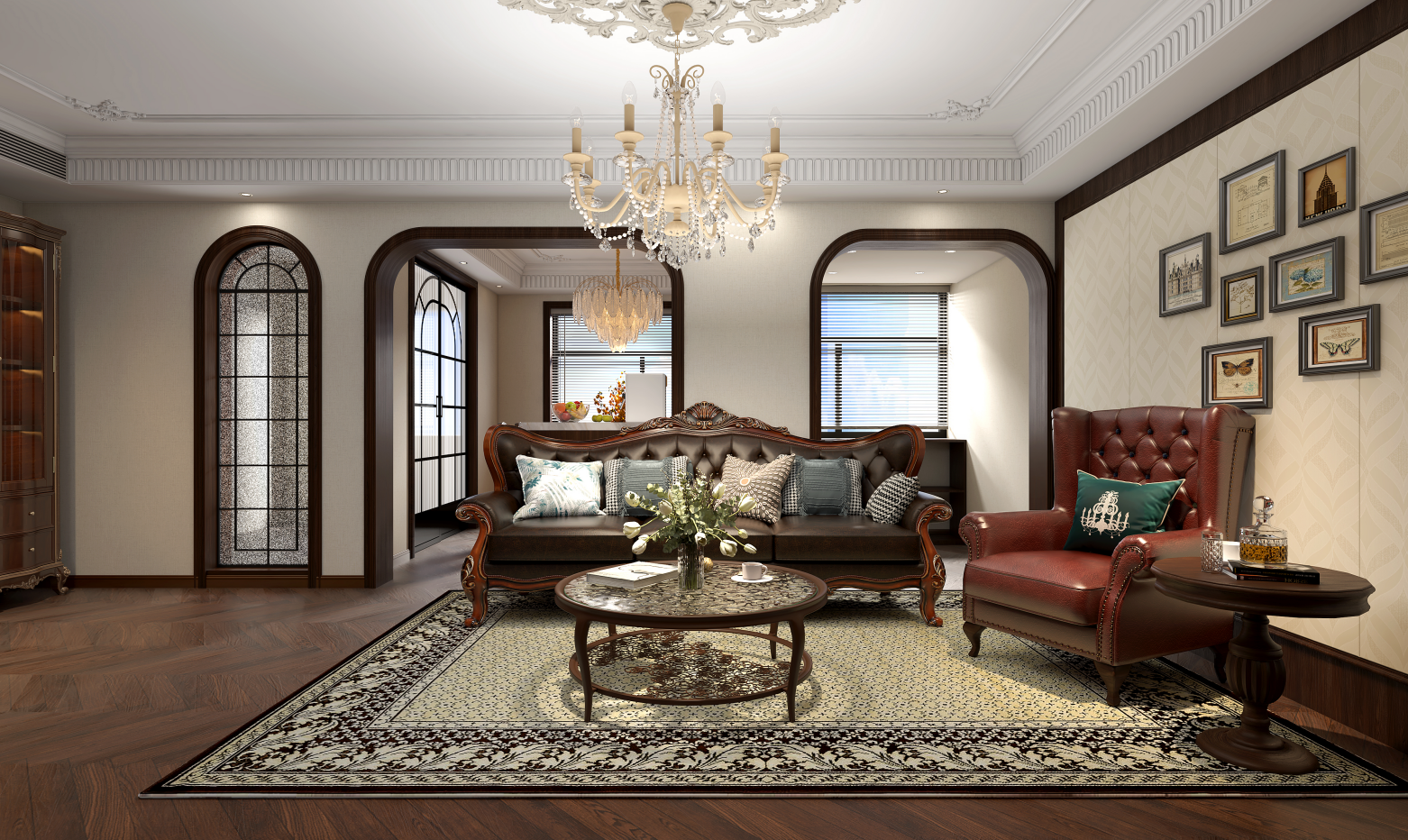 空间意境:整体风格是美式复古风,采用深色实木造型作为基础色,搭配浅色墙布,让整个空间从色彩感观上体现出层次感。