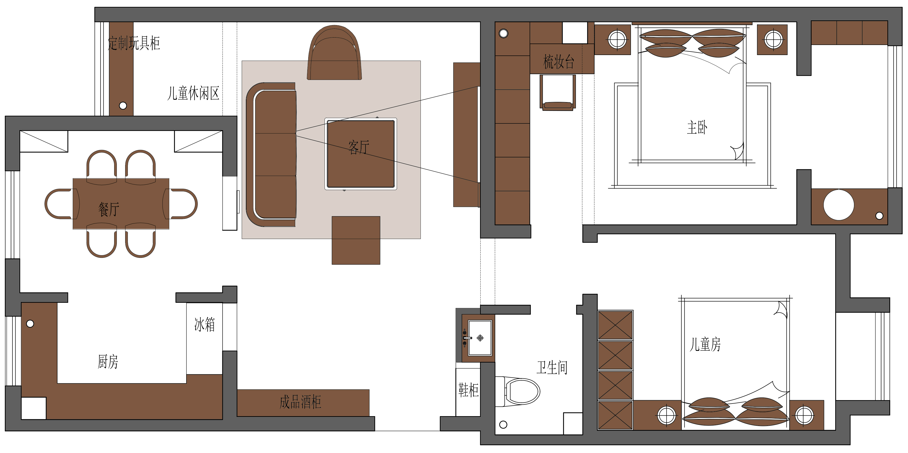 空间布局:将原有的三室两厅改为两室两厅,原本北向卧室改为餐厅,并与厨房打通,形成舒适独立的就餐空间。