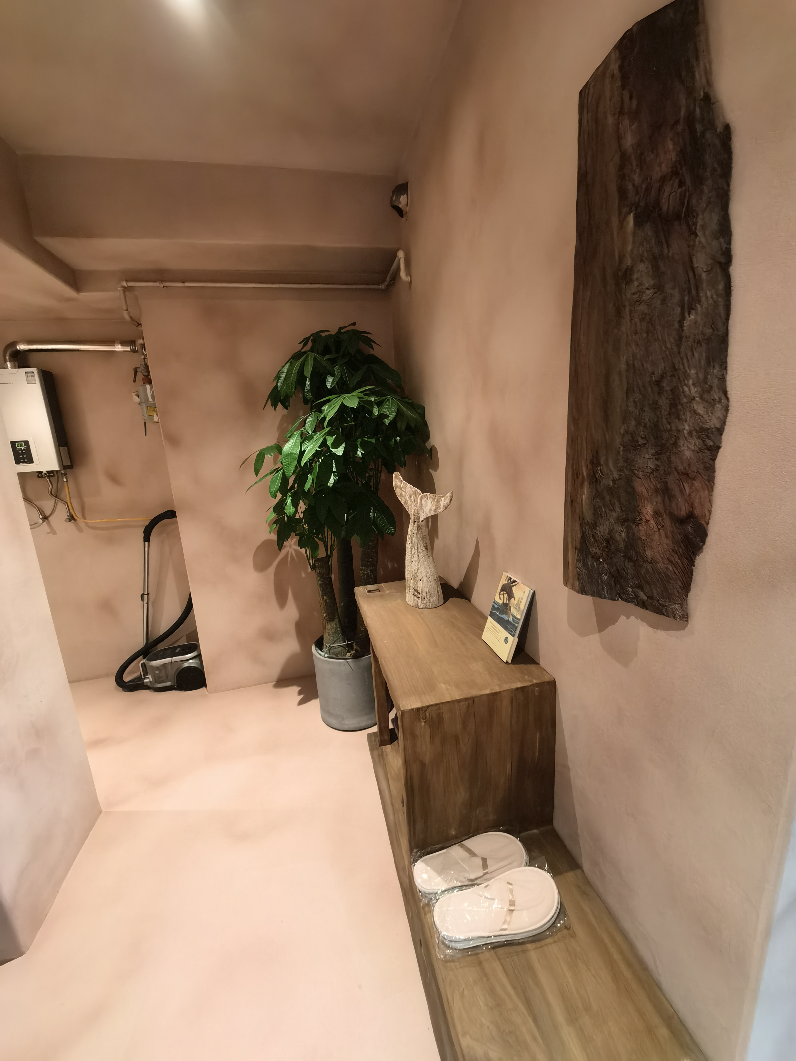 选用更加环保的无机微水泥,原木板翻新做旧,手工的木制床架 挂衣板!